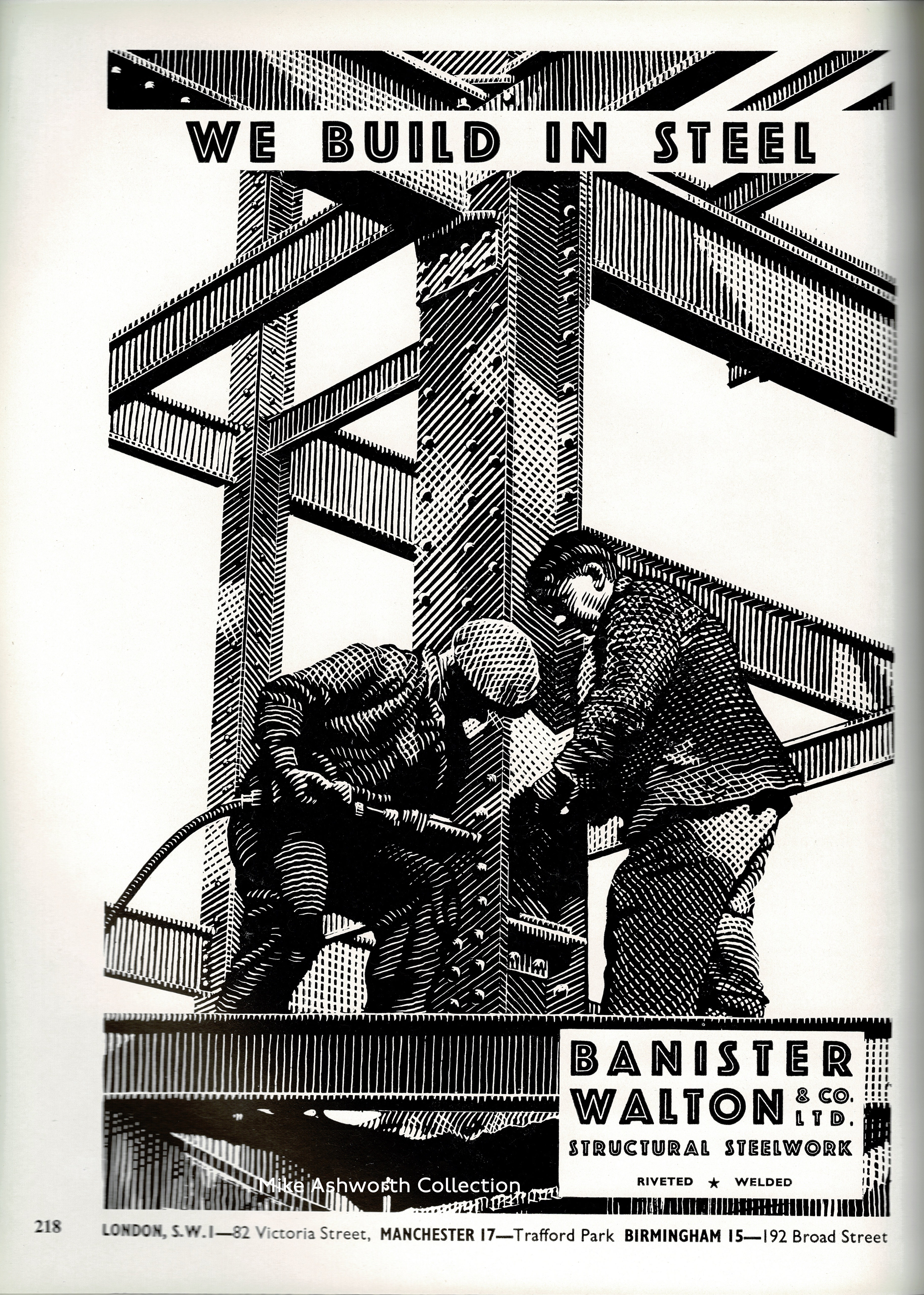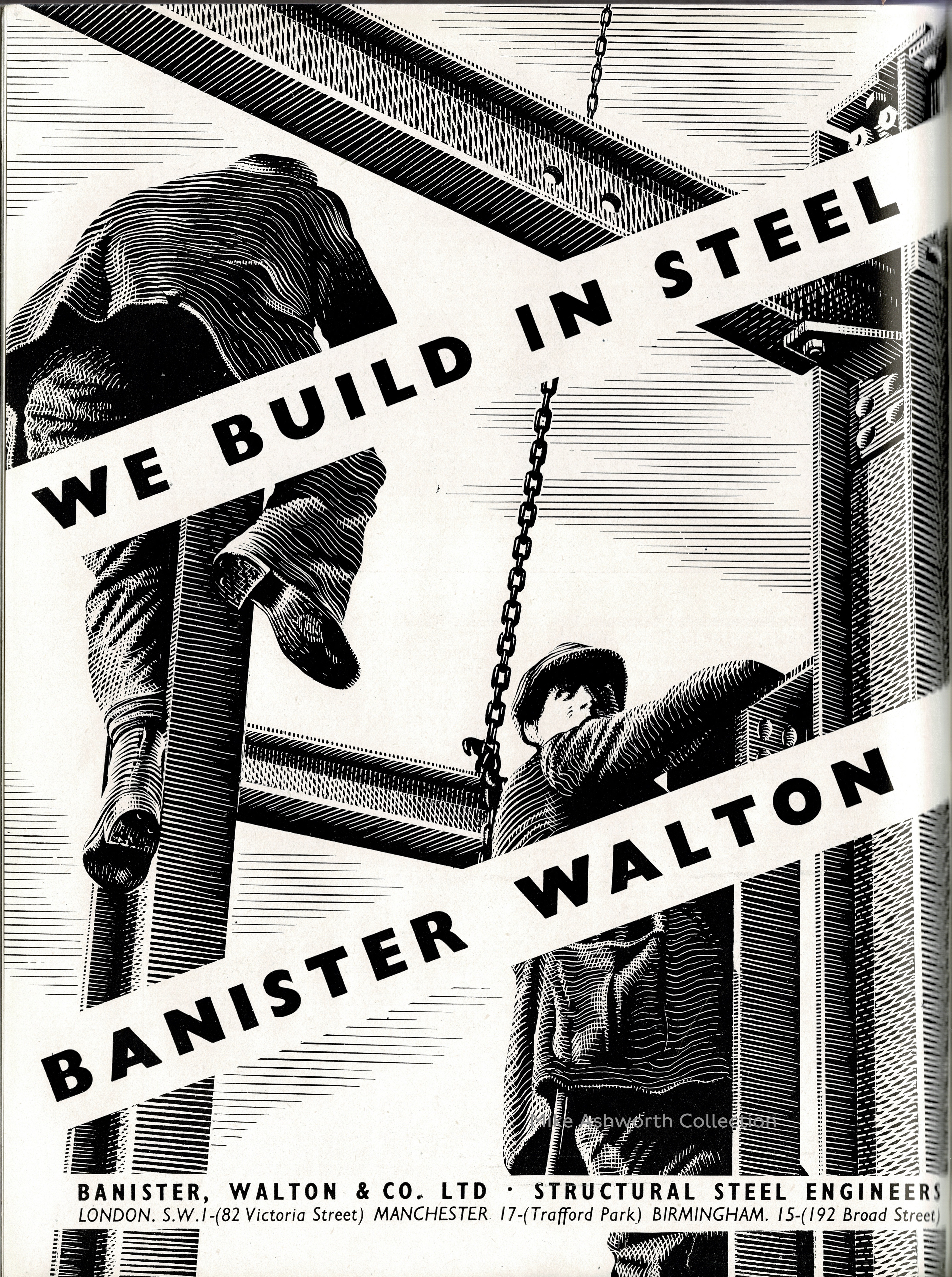 What a marvellous work in board and pen line! Showing the ‘old’ days of steel frame construction when health and safety was less of a rigorous concern this bold graphic certainly gives an excellent impression of such demanding and dangerous work.