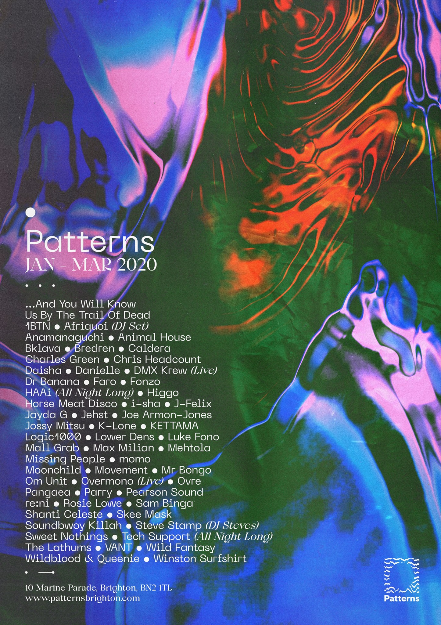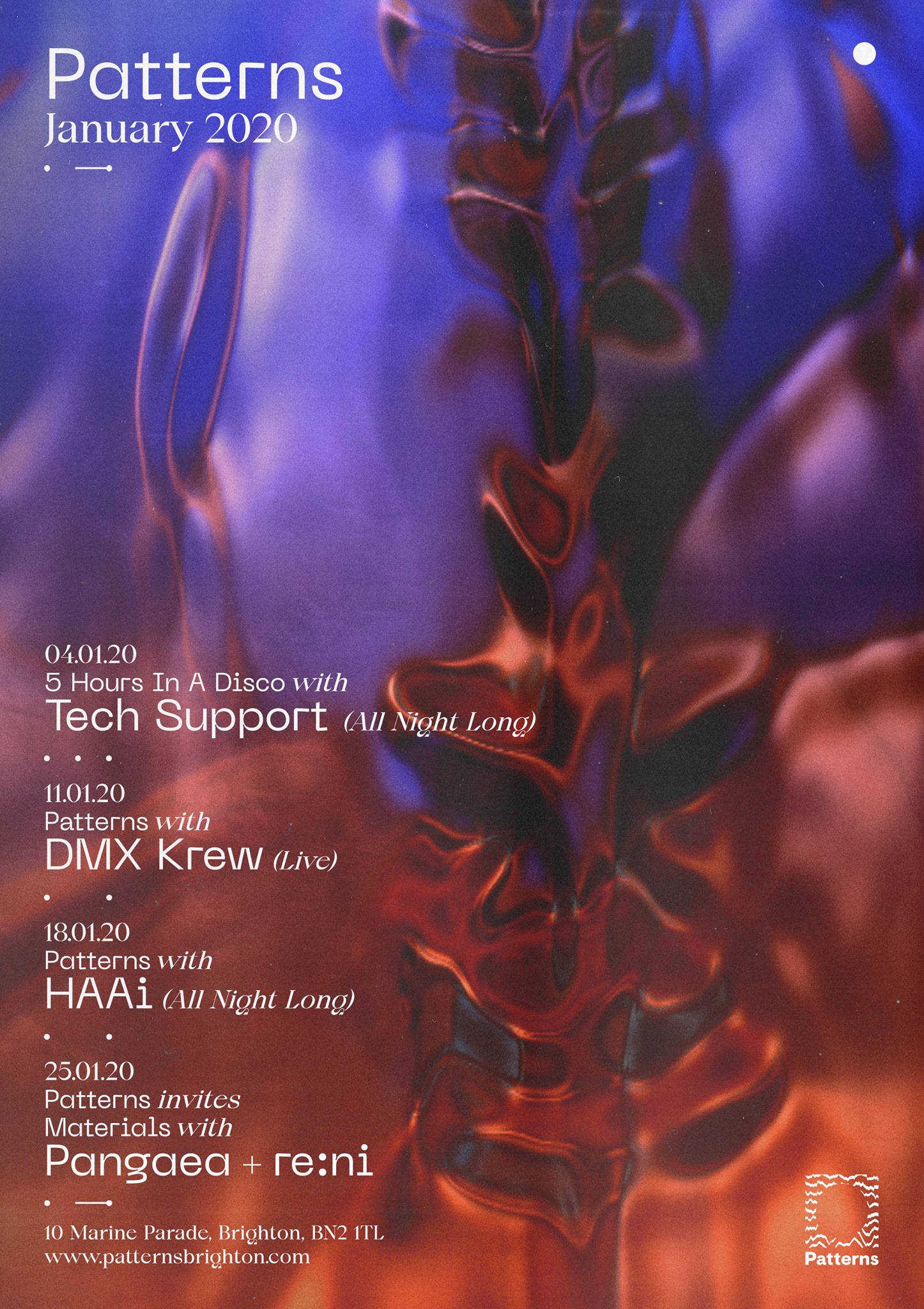 Patterns, a nightclub in Brighton, uses the glitchy, not-quite-monospaced Neue Machina and high-contrast-chiselled Cako in its iridescent poster and video art, designed by London-based Blixa Aguerreberry.