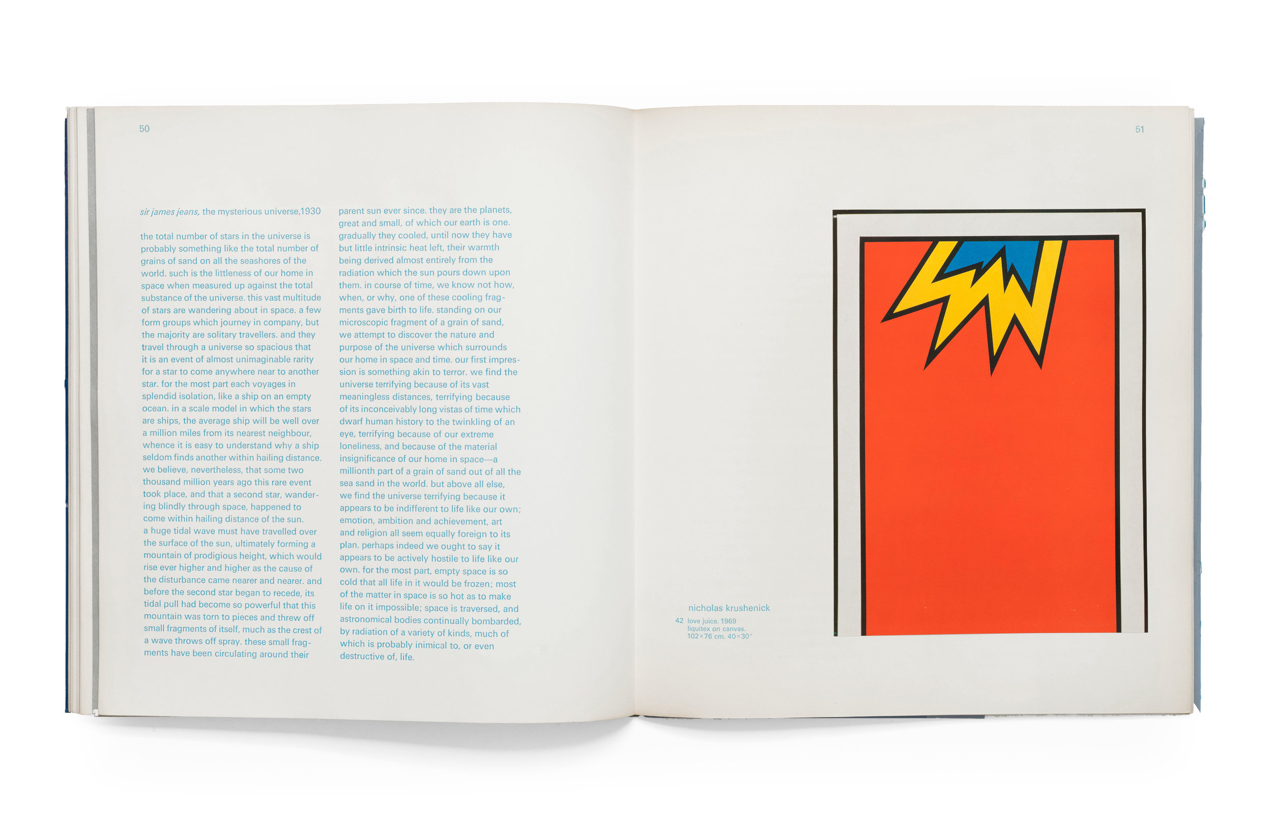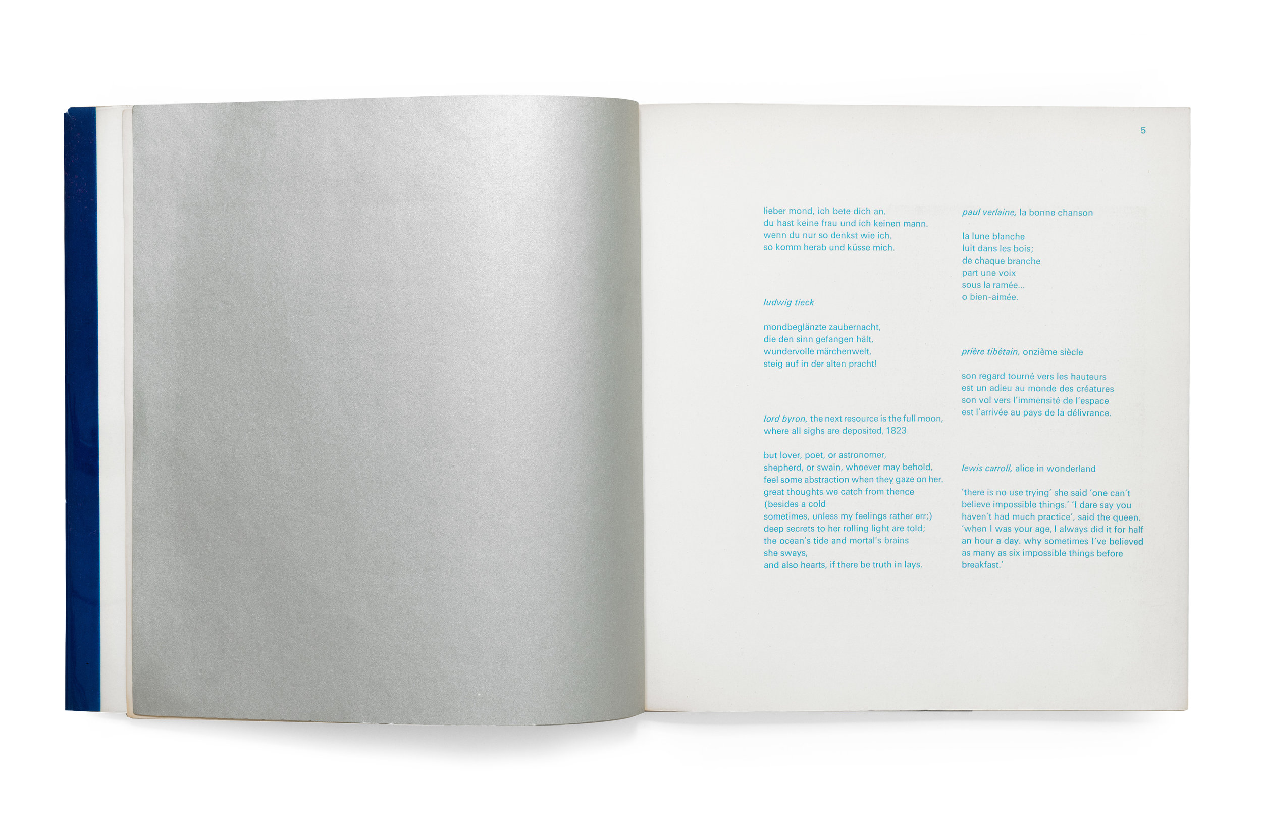Moon and Space is a perfect example of that sense of reward the reader receives not only for continuing through the book, but for returning back to it again and again. Published in 1969 by Galerie Beyeler (which has ceased to exist and was replaced with the remarkable institution, the Foundation Beyeler), Moon and Space is among a family of exhibition catalogs from that era which are all magnificently designed. …