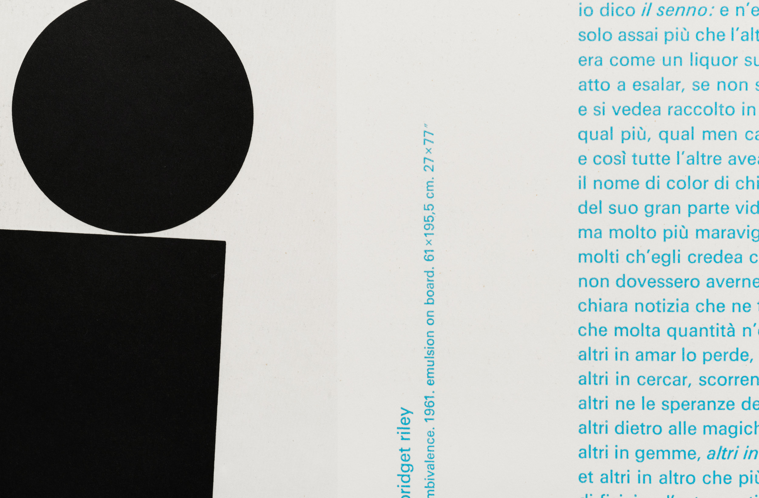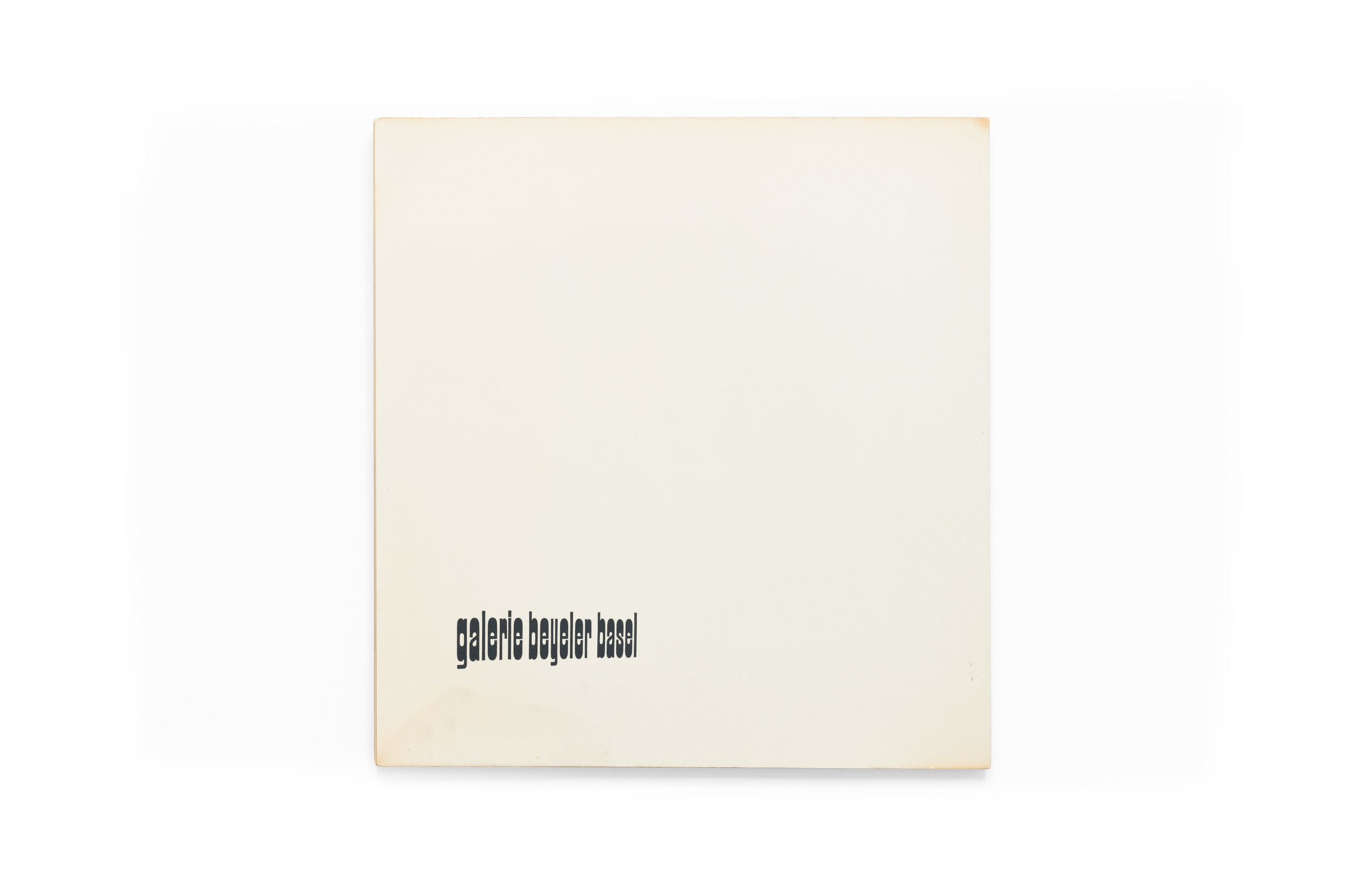 The designer is unattributed, however, I believe it is the work of op artist Victor Vasarely who was trained as a book designer and represented by Galerie Beyeler. It bears many signature marks of Vasarely’s designs from the large and playful typsetting of Univers, to the dancing text blocks and images across the page, and finally the liberal interchange of substrates throughout.