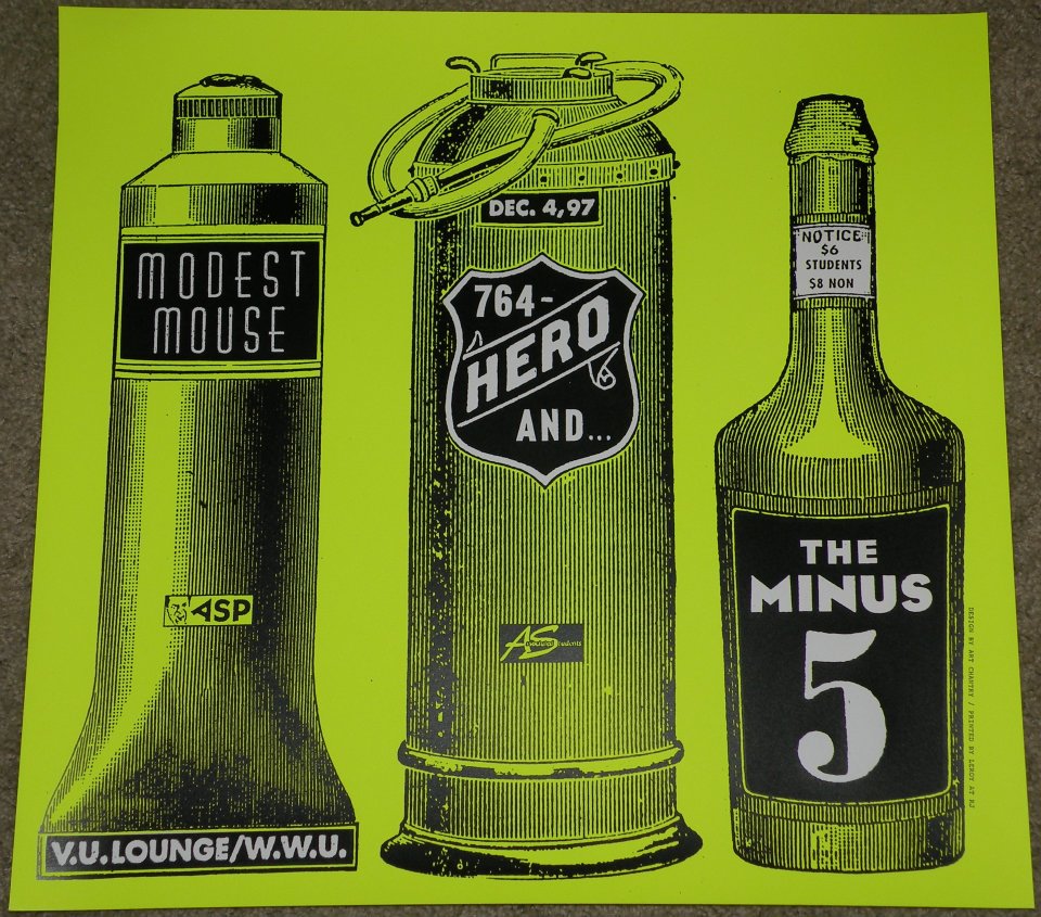 Modest Mouse, 764-HERO, The Minus 5 at V.U.Lounge Contributed by Stephen Coles on Feb 20th, 2013. Artwork published in 1997. Source: www.facebook.com © Art Chantry. License: All Rights Reserved. This and other classic Art Chantry posters are for sale directly from the artist. Typefaces More about Huxley VerticalGet Huxley VerticalMore about FuturaGet FuturaMore about EagleGet EagleMore about FB BodoniGet FB BodoniMore about unidentified typeface Formats Posters/Flyers (5801) Topics Music (6386) Designers/Agencies Art Chantry (2) Tagged withfaux vintage (132)rock and roll (146)concert & gig posters (515)Modest Mouse (2)screen printed (347) In SetsInnovators Club (Ella Yoon) (9) Post a comment Name Email – will not be published Website Your response Submit Comment More Huxley Vertical in use The Still, Small Voice of Trumpets by Lloyd Biggle, Jr. (Doubleday)1968Emanuel SchongutContributed by Florian Hardwig Prince – For You album art1978Jeff FarmakesJoe GiannettiContributed by Garrison Martin Attack of the 50 Foot Woman movie poster1958Reynold BrownContributed by D Jones Sponsor More in Music Johnny Winter – John Dawson Winter III album art1974Teresa AlfieriContributed by Garrison Martin T Swoop – “All Star” single coverc. 2023Julian GrönbergSimbayu StudiosContributed by Julian Grönberg B.B. King – Live & Well album art1969Henry EpsteinByron GotoContributed by Florian Hardwig BET Awards 20192019Sibling Rivalry StudioContributed by Plain Form More in Posters/Flyers Opak magazinec. 2009Adeline MollardFloyd E. SchulzeContributed by Swiss Typefaces Staff Pick Qwak! video game flyer1974AtariContributed by David Smith Four Los Angeles Artists exhibition poster1975Cris GianakosContributed by Herb Lubalin Study Center Staff Pick Els Tres Tombs de Constantí 2025 posters2025Gerard SierraCristina LavillaContributed by Gerard Sierra More Fonts In Use Al Wilson – “Show and Tell” / “Listen to Me” single cover1973unknownPhoto(s) by oopswhoops on Flickr. Staff Pick Trans-missions Mai–Août 20162016Anette LenzContributed by TypeTogether Staff Pick Arthur Fiedler and the Boston Pops – Arthur Fiedler “Superstar” album art1971David KriegerNorman GreenContributed by Florian Hardwig Staff Pick Banger magazine, Vol. 1 & 22018Mark LeedsEllie RoseC-ll-ct-v-lyContributed by Ellie Rose Staff Pick