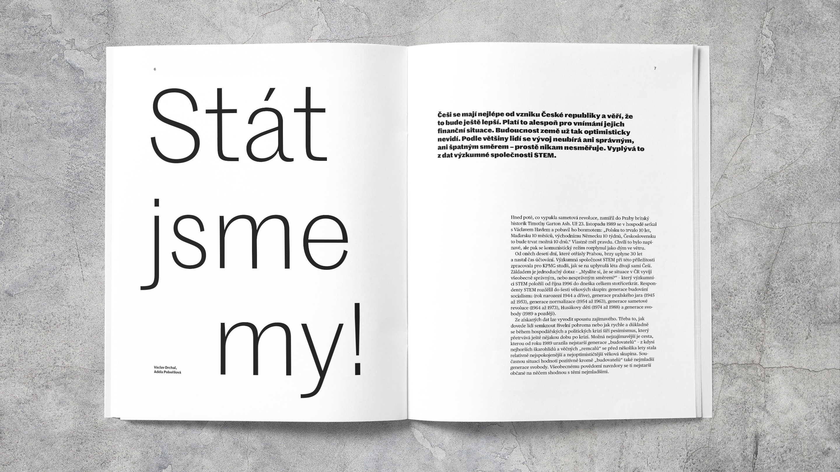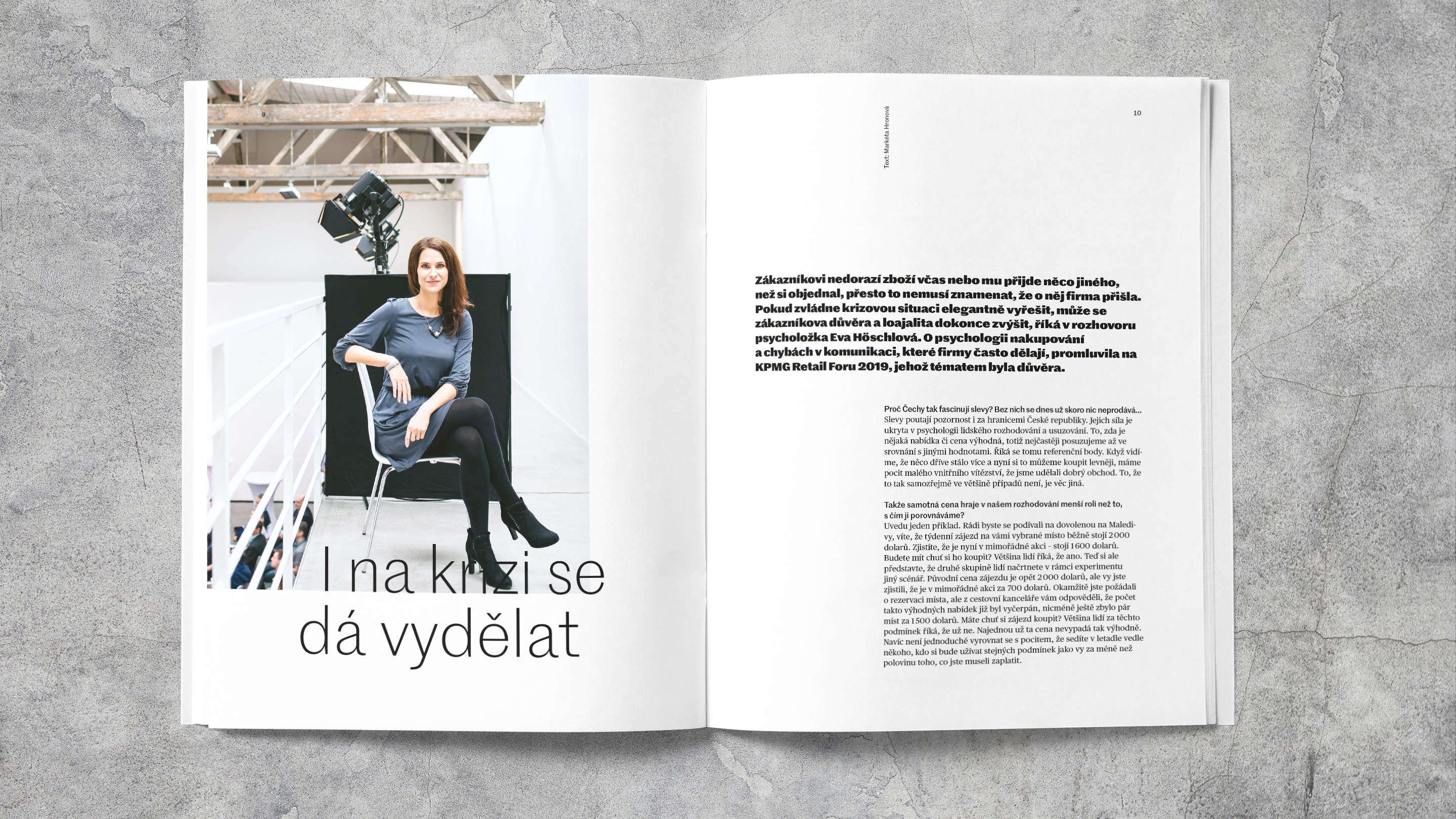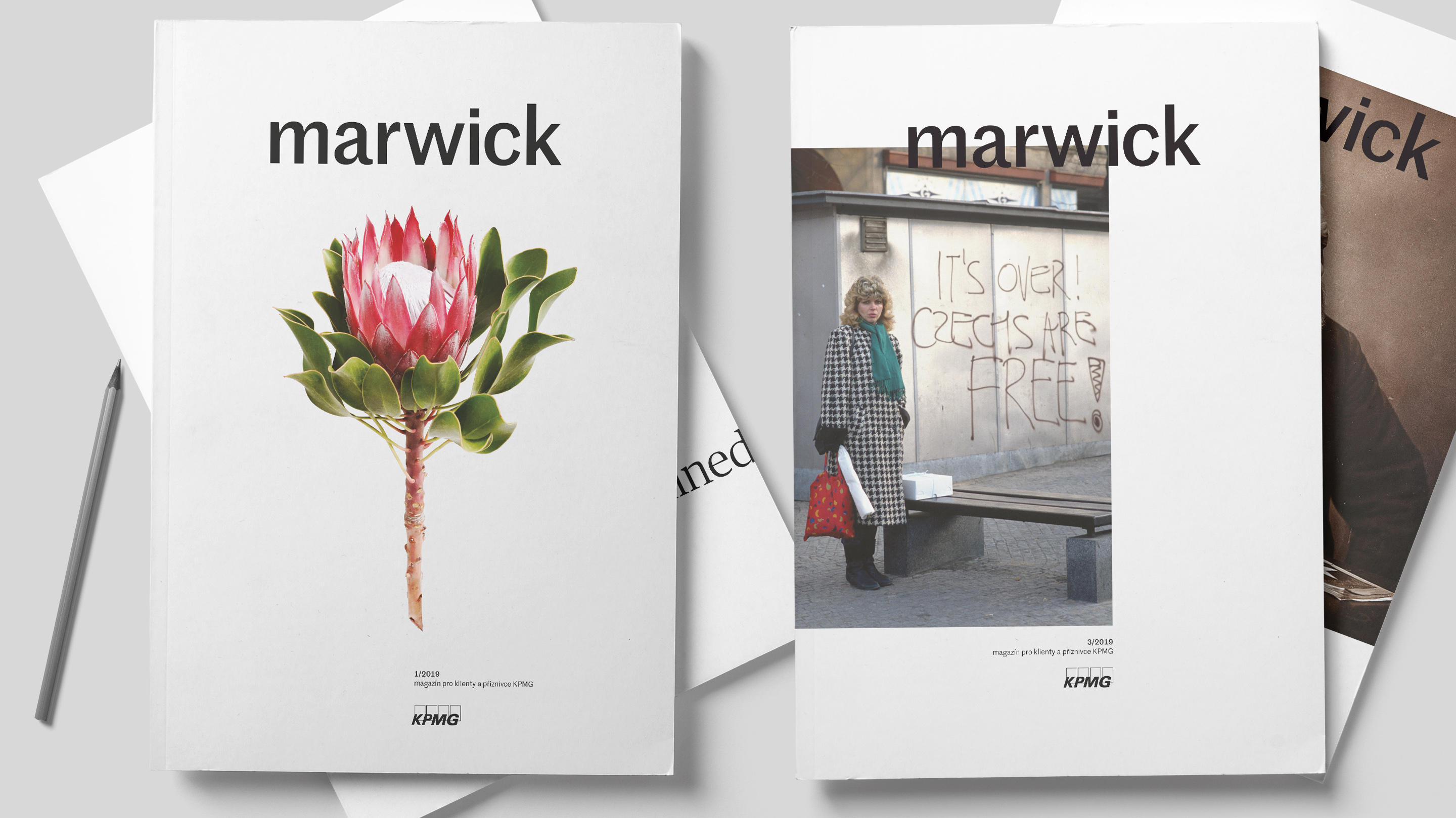 Award–winning Marwick magazine, published by the Czech office of KPMG consultants, provides an overview of current topics that are important for business. Since 2019, the magazine typography pairs typefaces from Commercial Type: Marr Sans is used from logo to captions. Publico Headline is used for big sizes, Publico Text is used for for smaller point size text.