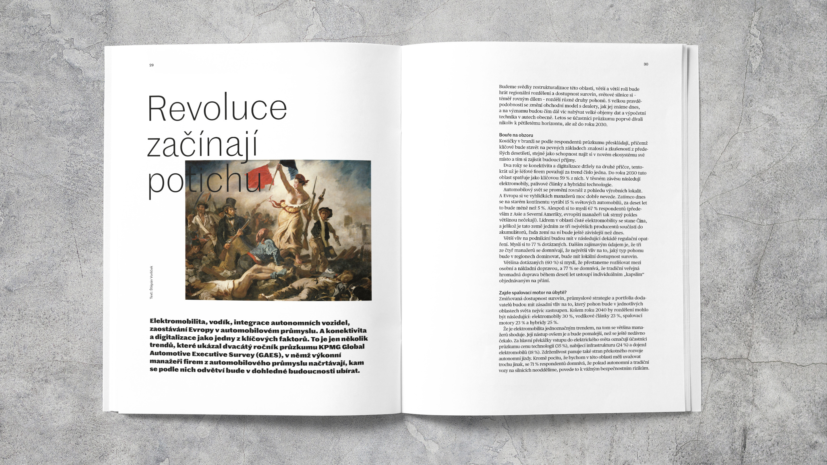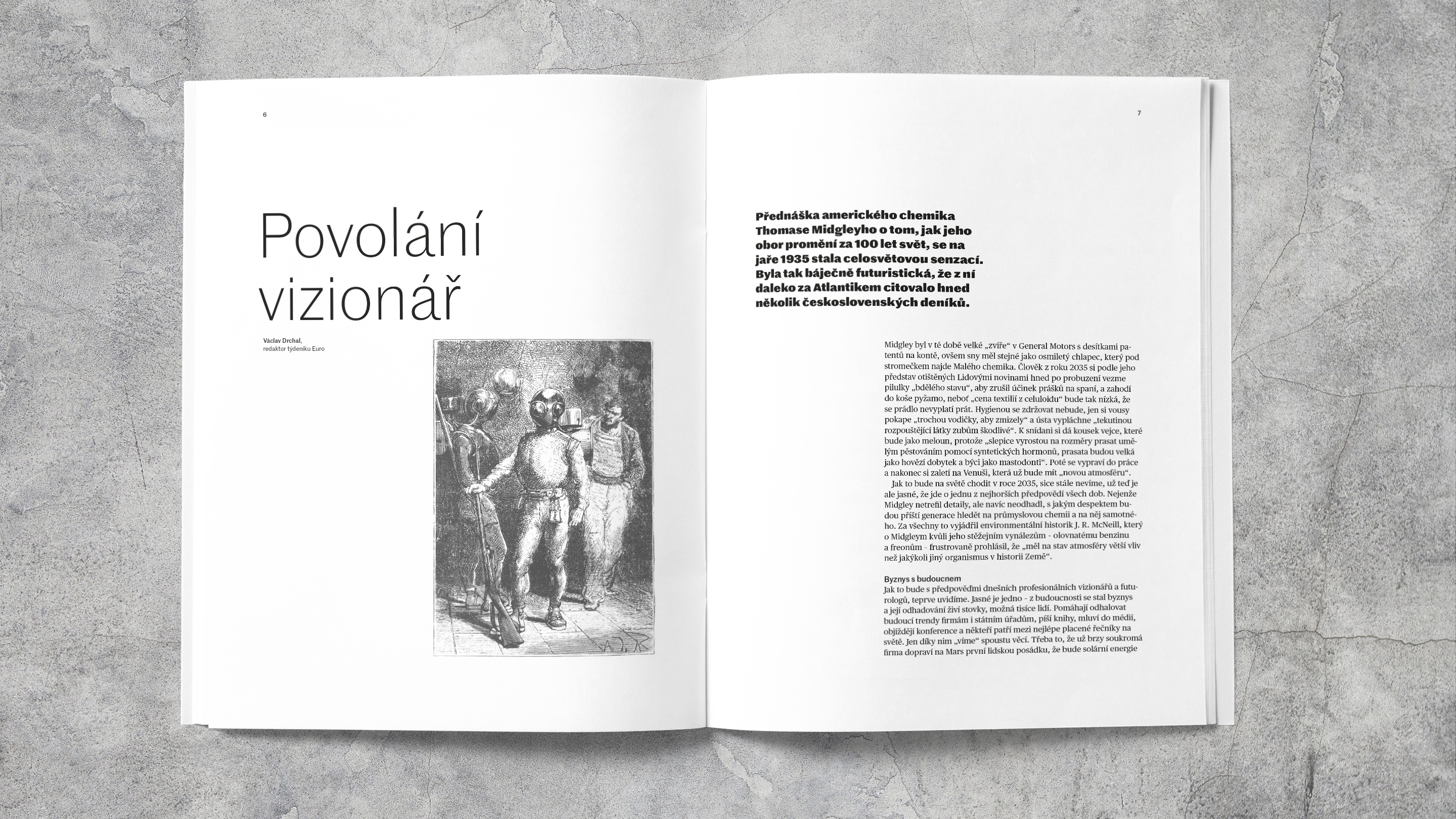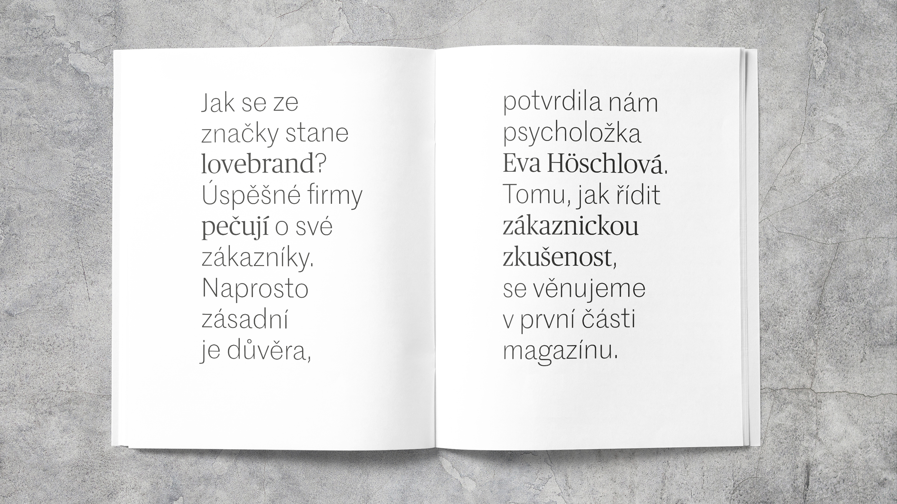 Award–winning Marwick magazine, published by the Czech office of KPMG consultants, provides an overview of current topics that are important for business. Since 2019, the magazine typography pairs typefaces from Commercial Type: Marr Sans is used from logo to captions. Publico Headline is used for big sizes, Publico Text is used for for smaller point size text.
