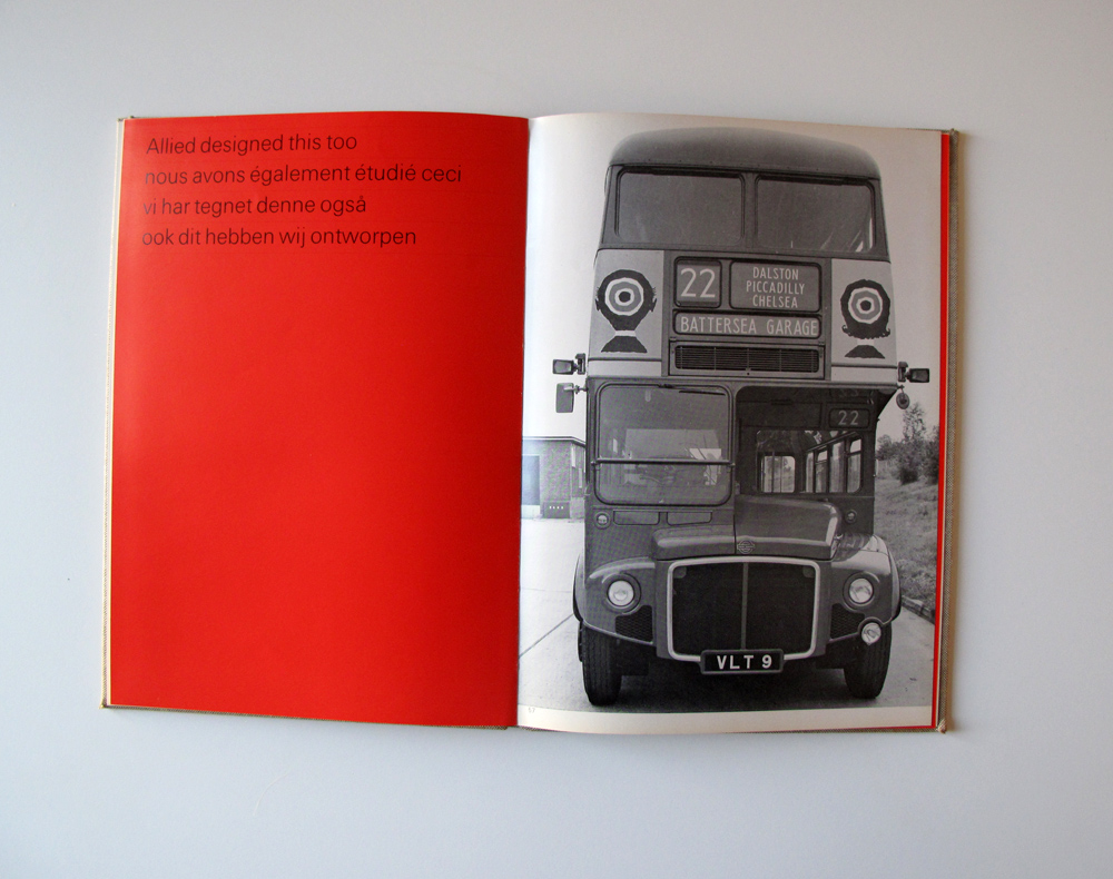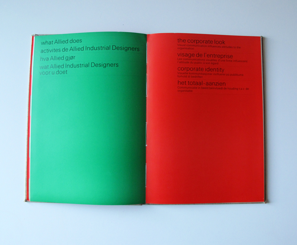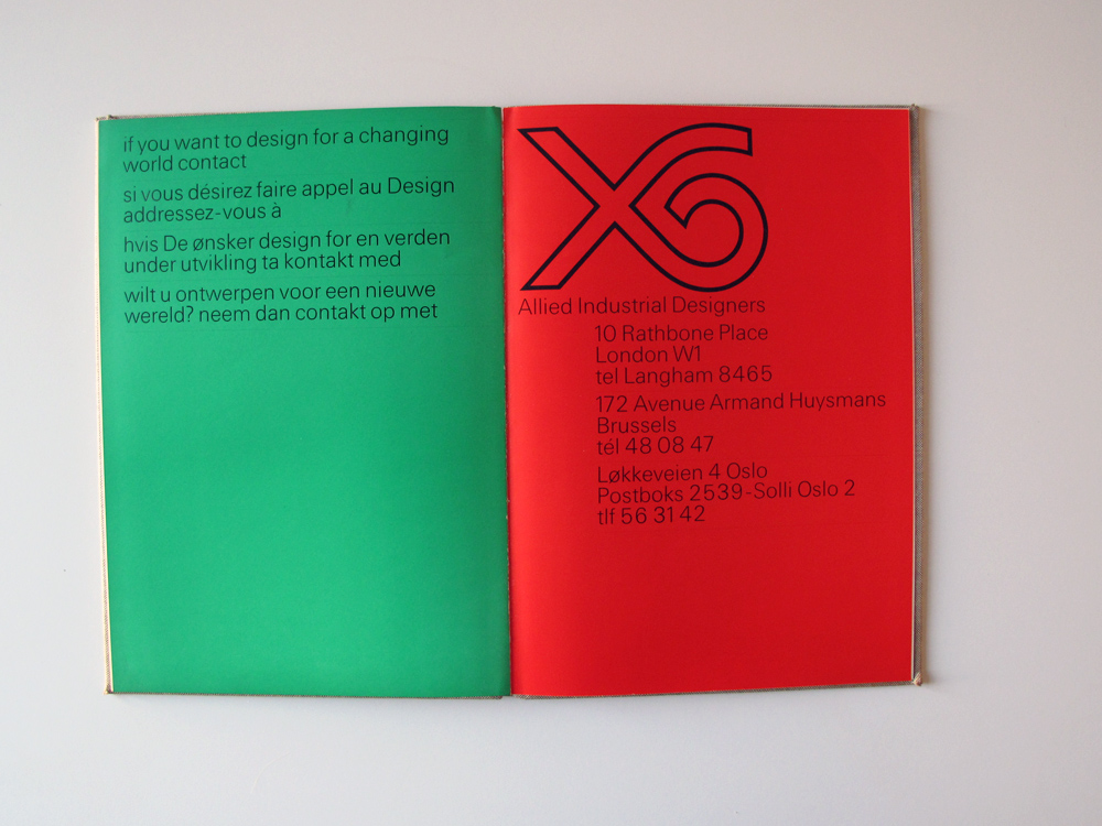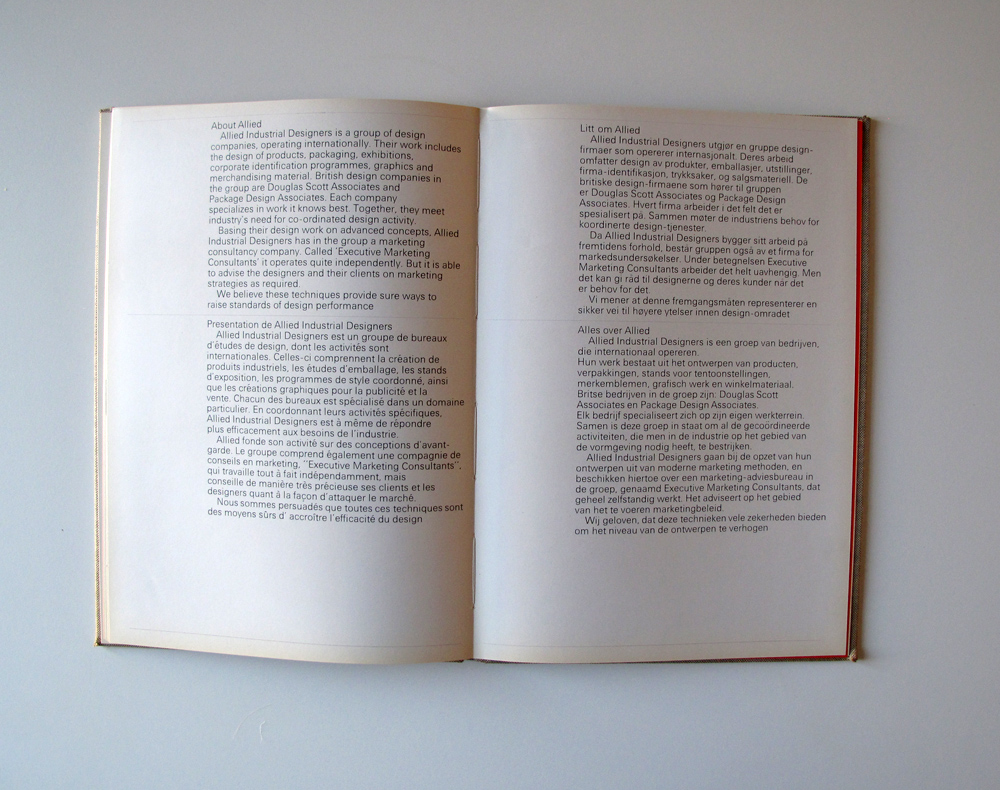 This catalog showcases the work of Allied Industrial Designers. With offices in London, Brussels and Oslo, the text has been included in four languages – English, French, Norwegian and Dutch – all rendered in the same style and size, only distinguished by sequence and whitespace.