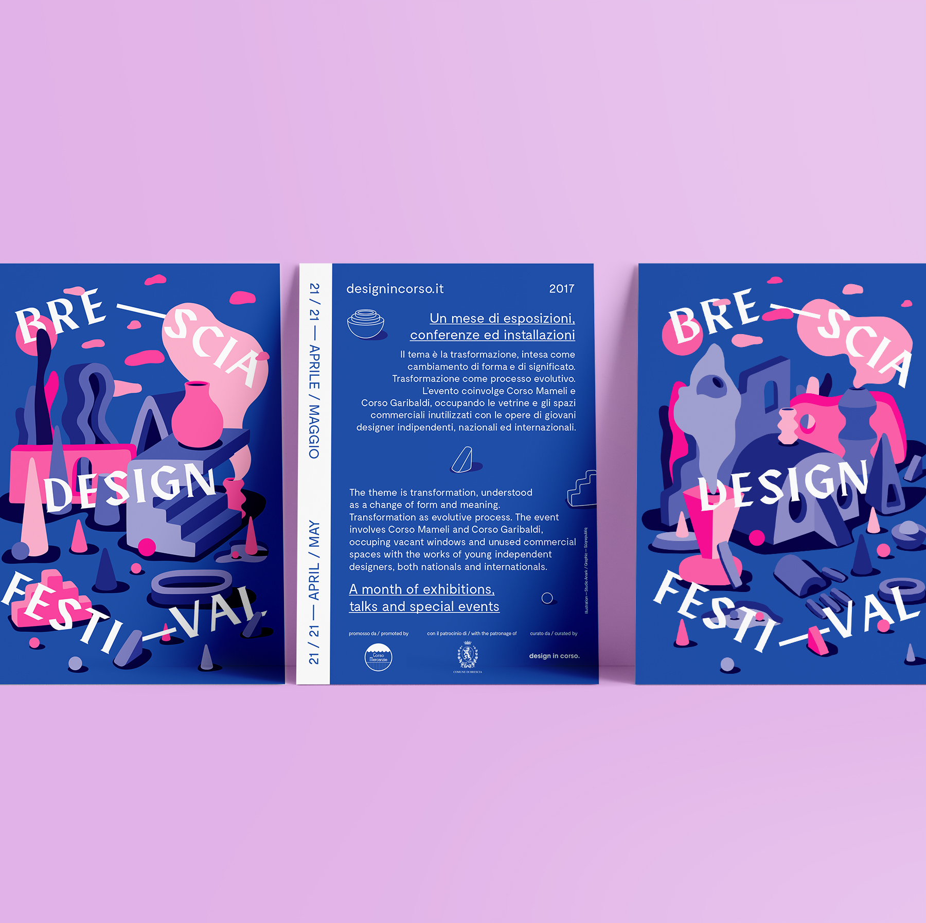 Identity for the second edition of Brescia Design Festival in 2017, a month of exhibitions, conferences and installations. The theme is transformation, understood as a change of form and meaning. Transformation as an evolutionary process. The event involves Corso Mameli and Corso Garibaldi, occupying the unused shop windows and commercial spaces with the works of young independent national and international designers.