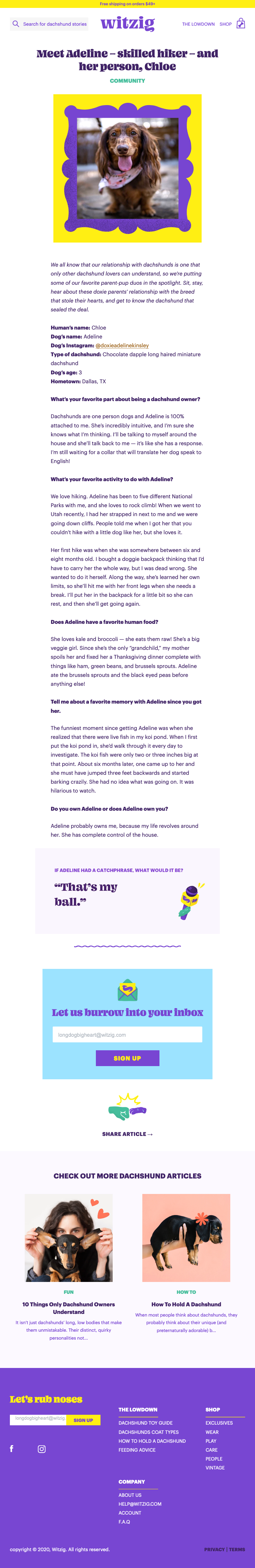 Witzig, which means ‘witty’ in German, provides specially curated products for dachshunds and their owners as well as an online community and blog with articles and content ranging from instructive ‘How-Tos’ to fun, informational articles. While you can buy the usual leashes, toys, clothes and other items for your dog elsewhere, Witzig provides specially curated items made just for dachshunds and people who love them. Most importantly, Witzig provides a sense of belonging for a very special community.
