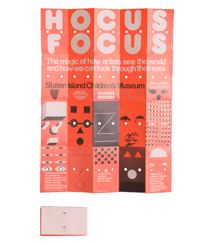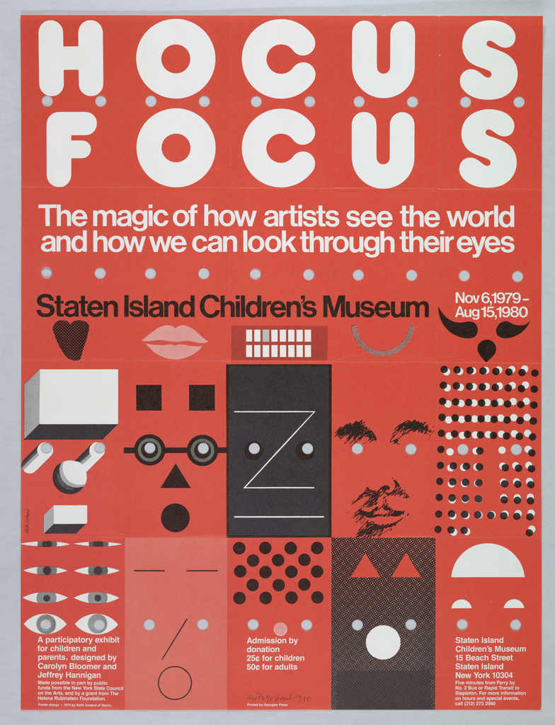 “The Hocus Focus poster was designed to promote an exhibition at the Staten Island Children’s Musuem about how artists see the world and how they can look through their eyes. There was an enjoyable whimsy of figuring out, in two color designs, fifteen faces that suggested different artistic personalitites. Each was created with as many different geometric forms as possible to reflect the numerous styles and approaches by artists.