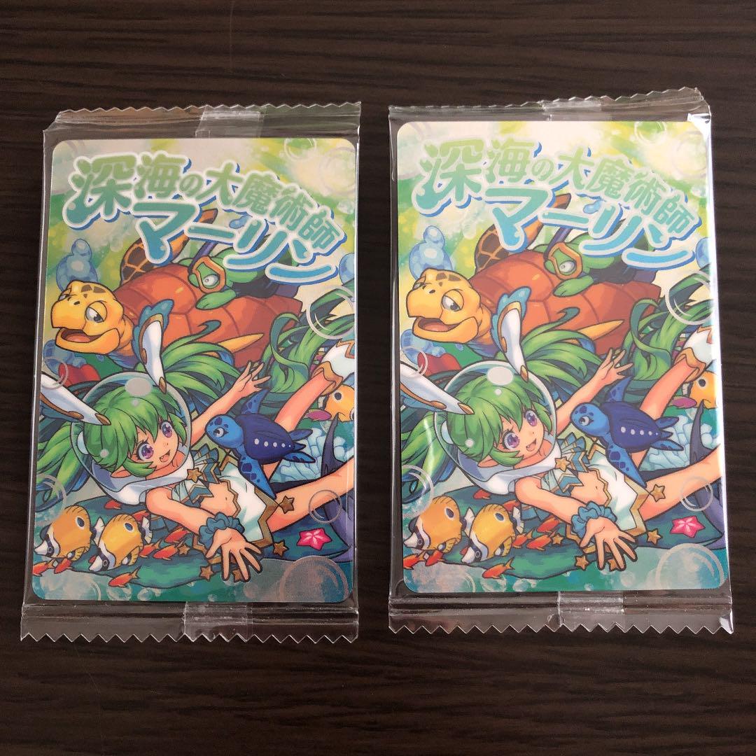 Packaging containing a wafer and a “Summer Merlin” card, one of many collectible cards that exist as a physical counterpart / spinoff alongside the Monster Strike mobile game and anime series. The font in use is Humming E, available from Fontworks.