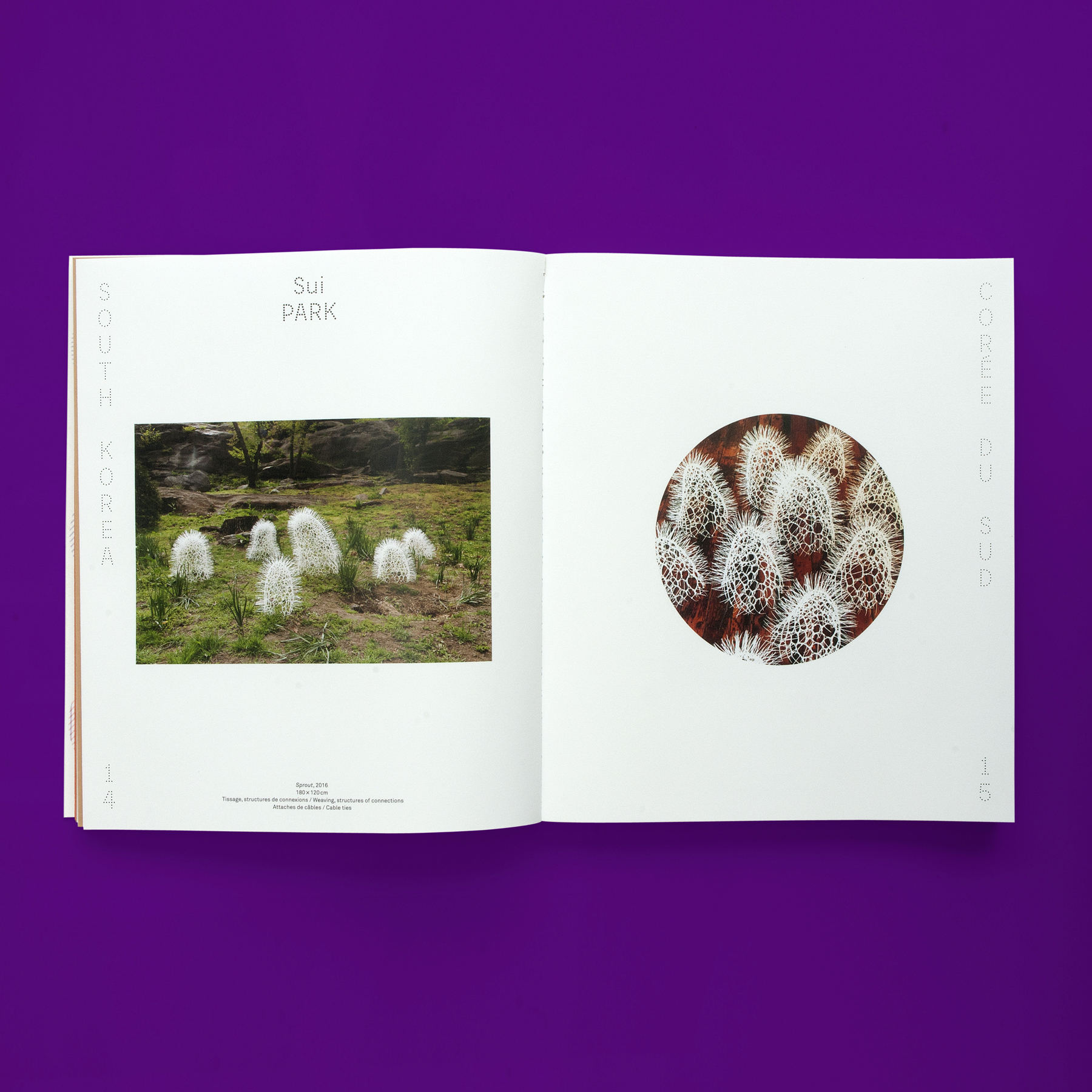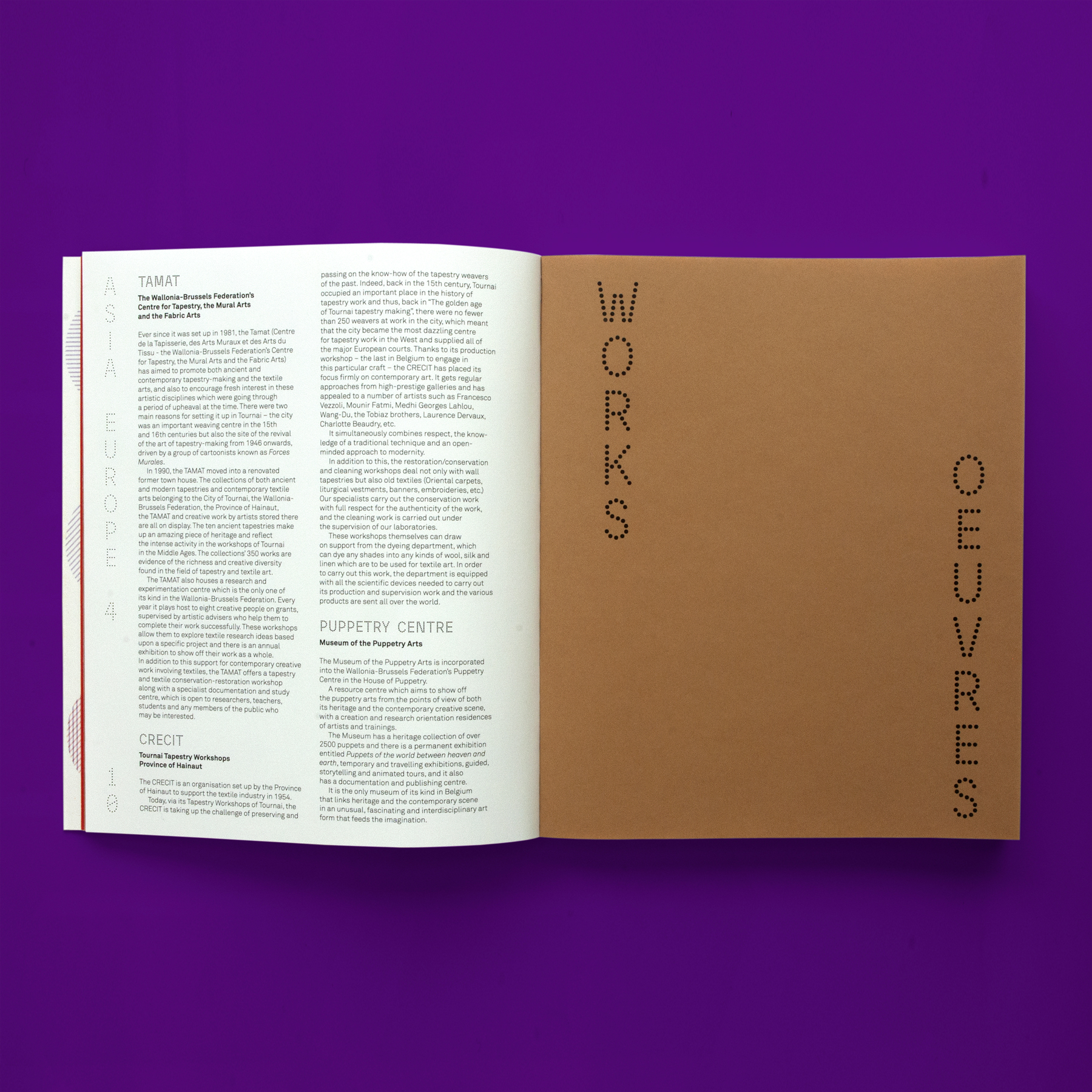 In 2019, Sébastien Lordez designed the exhibition catalog of Asia–Europe #4 for the TAMAT (Tapestry and Textile Arts Museum of the Wallonia-Brussels Federation). For the titles, he used Beretta Sans designed by Damien Gautier and released by 205TF. Running text is set in Akkurat designed by Laurenz Brunner and distributed by Lineto.