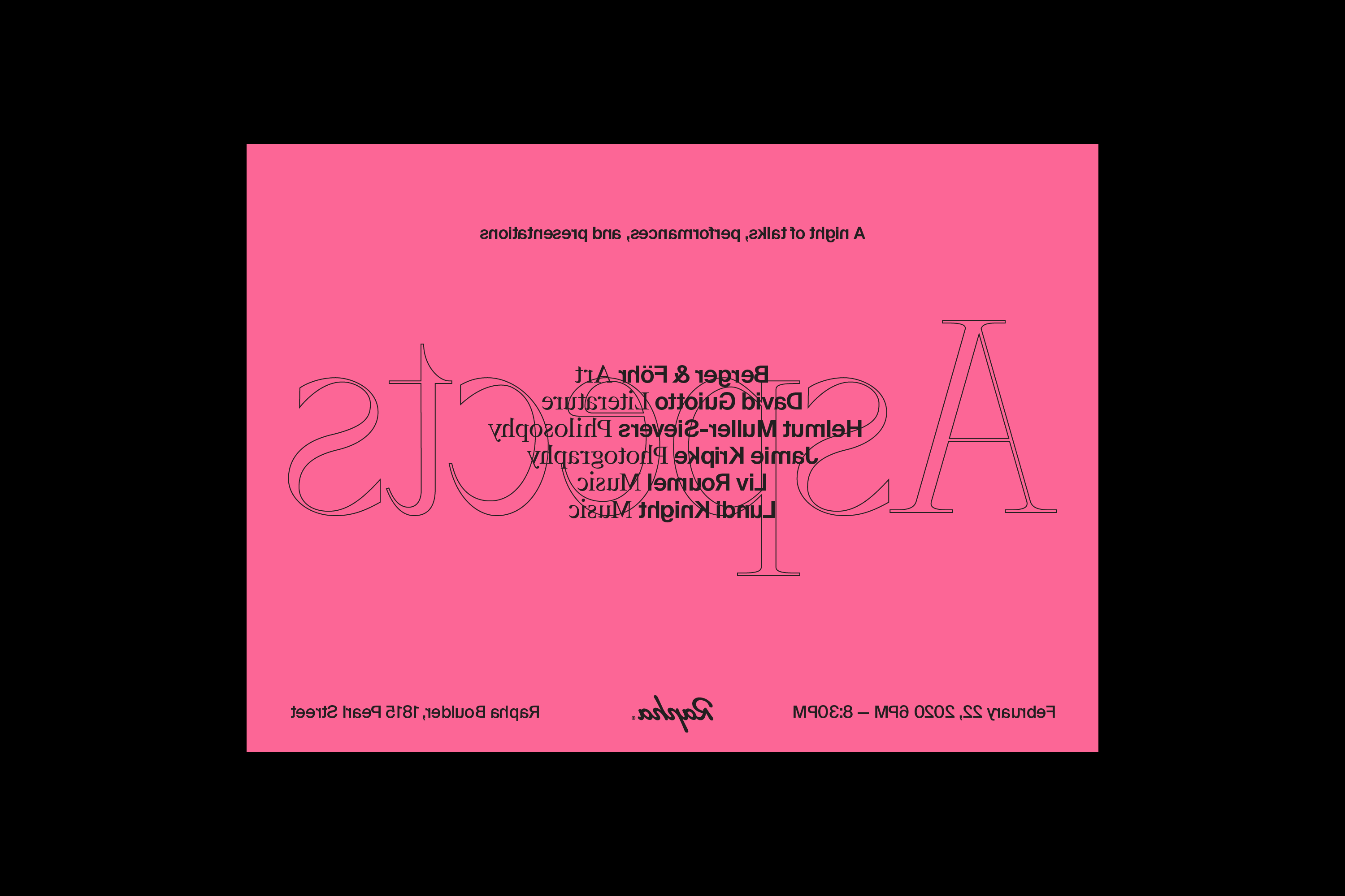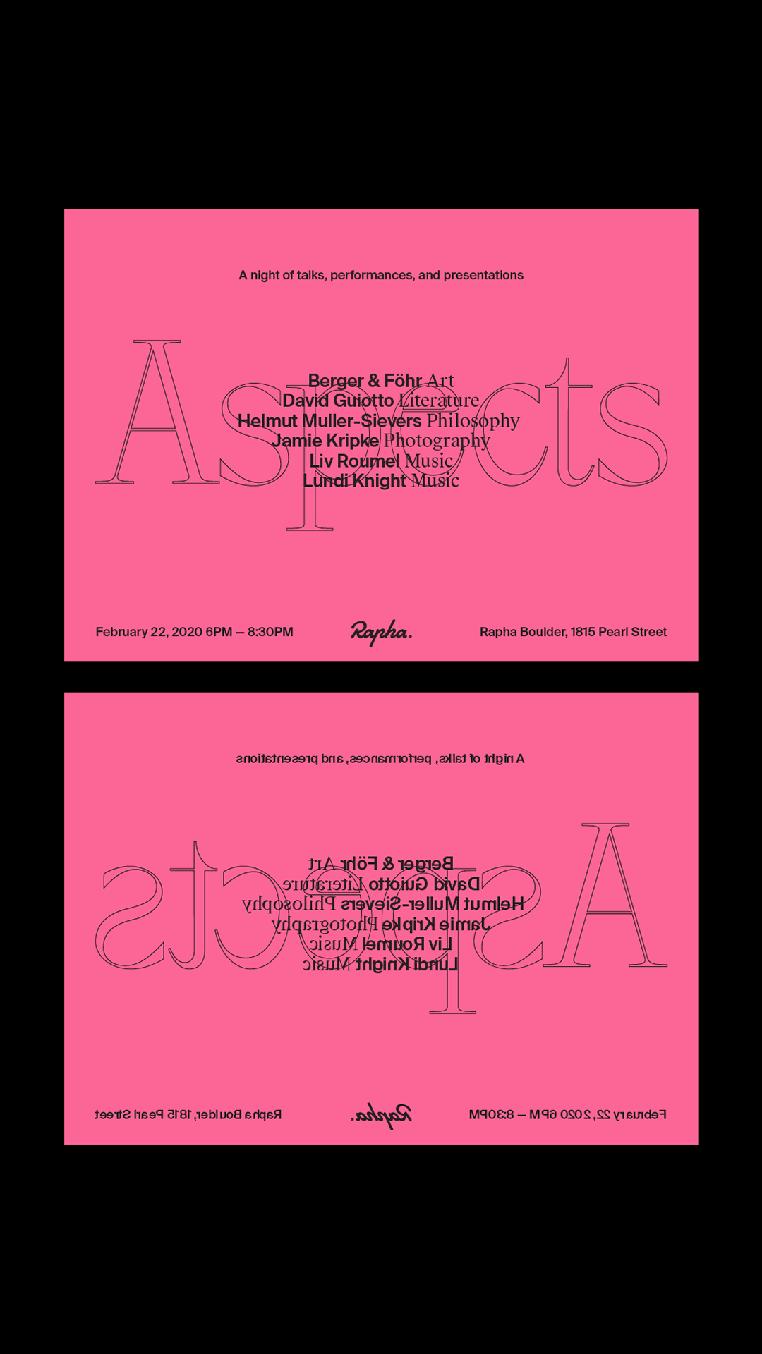 A literal interpretation of the word ‘Aspect’, the flyer’s backside is the front reversed. The large outlined text is BL Arctic by BoulevardLAB. Event details and speaker information is set Suisse Int’l and Suisse Works from Swiss Typefaces..