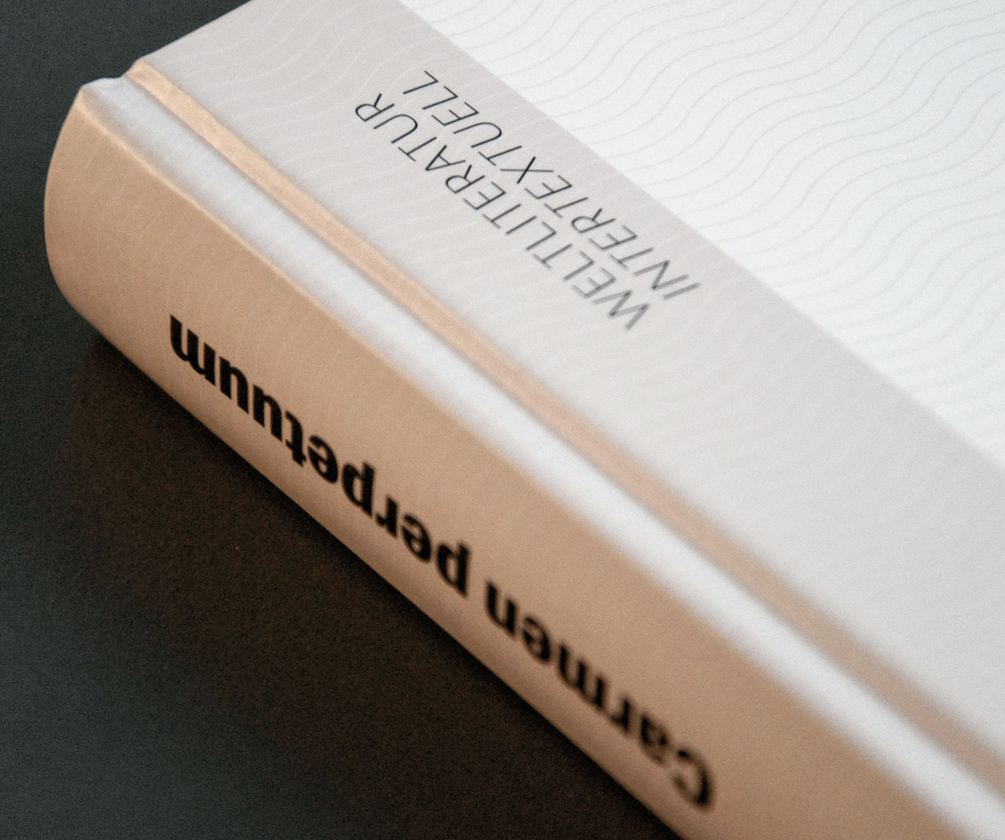 I opted to keep the key visual, but what needed a refresh was the typography. The previous materials, designed by a younger and less type-savvy me, had used Frutiger – a solid but not very interesting choice. So for this book cover I switched to Swedish Siri. Besides being a fresher – and not stereotypically Swiss – design, Siri had the advantage of being relatively dense and space-saving, useful for such a verbose title (especially since the editors wished that the subtitle be just as “visible” as the main title). The wide range of weights also came in handy – right down to the thinnest of weights used for the (potential) series ident, “Weltliteratur intertextuell”, in vertical orientation.