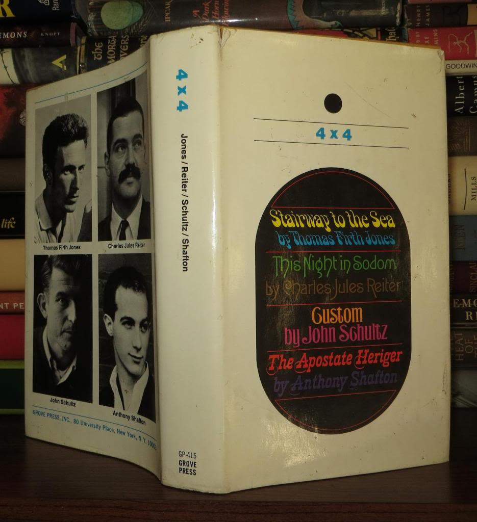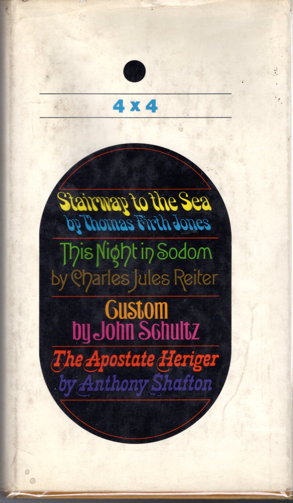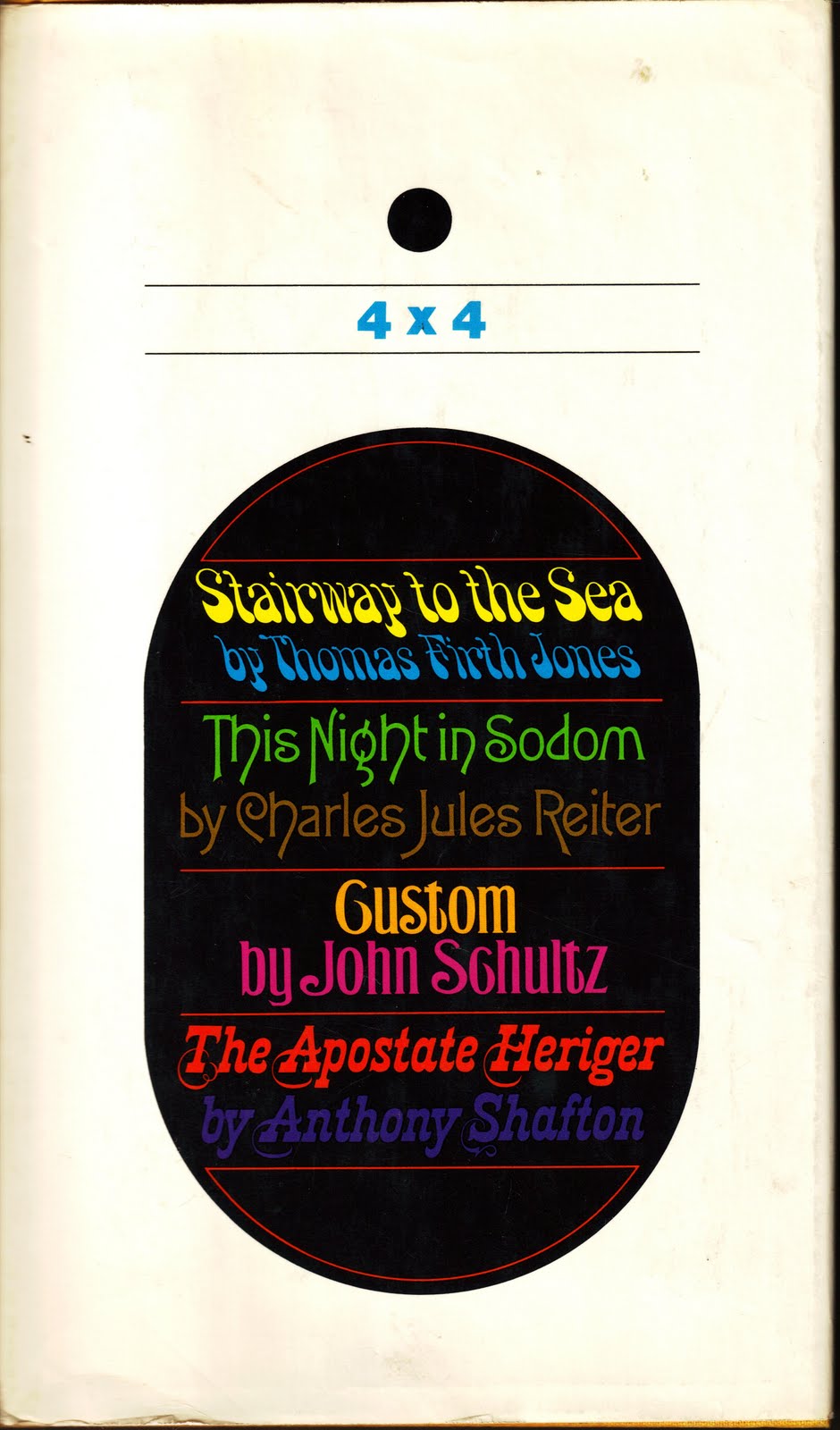 4×4 is the title of a compilation of four erotic novellas, published by Grove Press in 1962. Each pair of title and author’s name is set in a different typeface, with alternating line colors. The chosen typefaces are Smoke for Stairway to the Sea by Thomas Firth Jones, Art Gothic for This Night in Sodom by Charles Jules Reiter, Grant No. 2 for Custom by John Schultz, and Italic Ornate for The Apostate Heriger by Anthony Shafton. All four designs have roots in the 19th century, and all were included in the Morgan Press Collection, a series of revivals of wood and foundry typefaces adopted for phototype by Headliners in the 1960s.