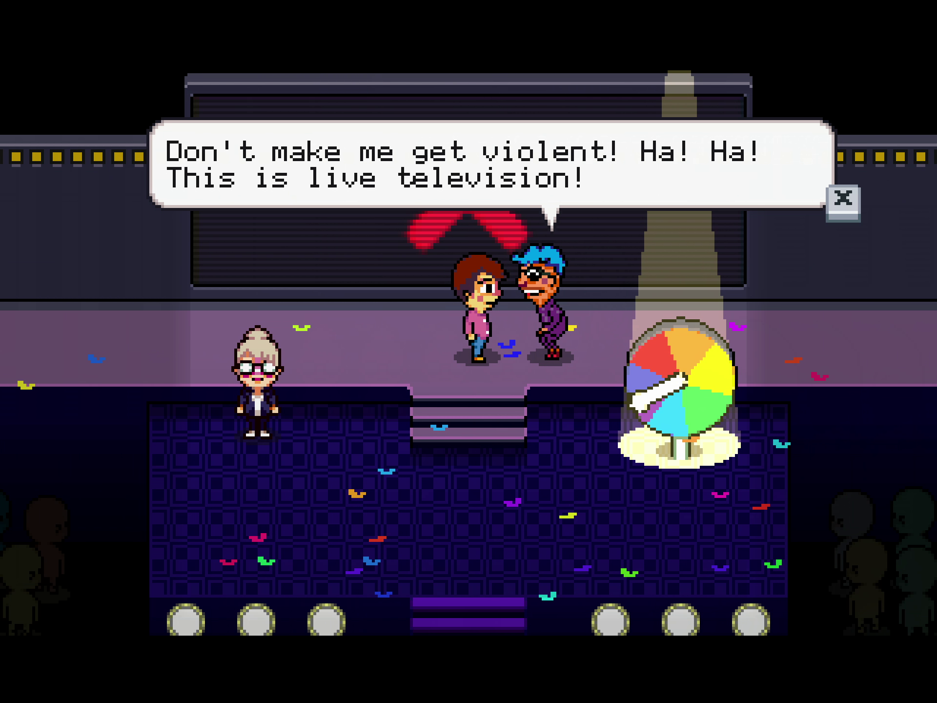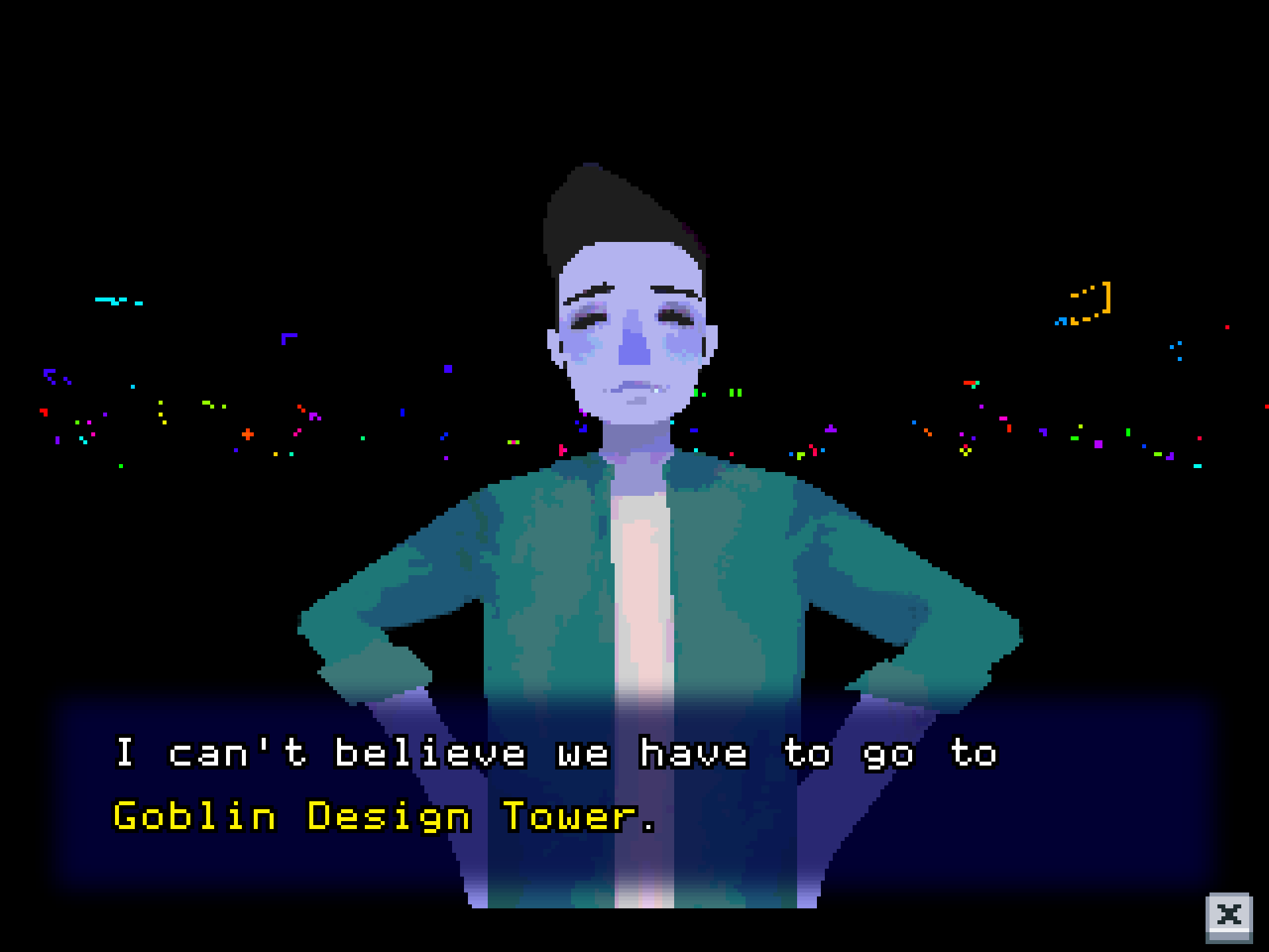 The in-game dialogue and menus use Apple ][, a freeware recreation of the iconic Apple II system font by Laz Ilong. Some in-game text is also set in Listen Here, Miss, designed by Anna Anthropy.
