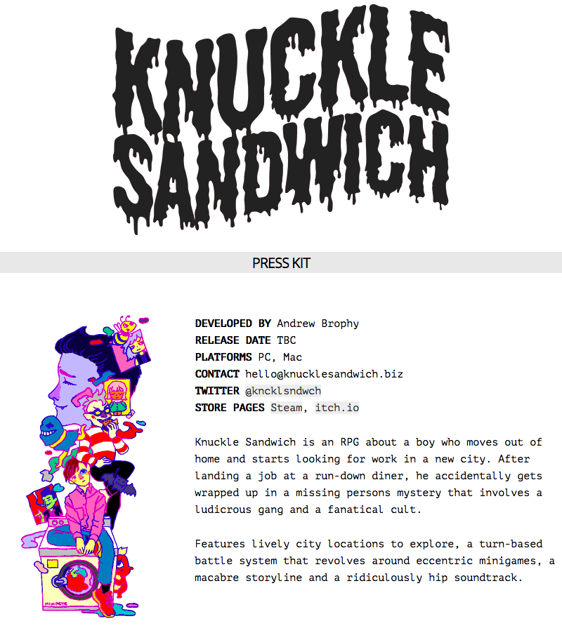 Knuckle Sandwich is an RPG about a boy who moves out of home and starts looking for work in a new city. After landing a job at a run-down diner, he accidentally gets wrapped up in a missing persons mystery that involves a ludicrous gang and a fanatical cult.
