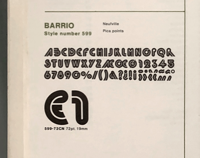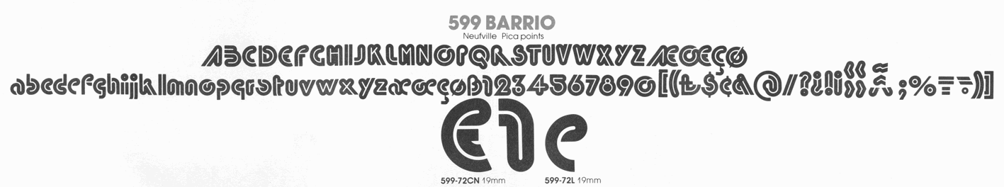 Both showings include a Neufville credit, but no designer information. According to Wolfgang Hartmann of Bauer Types, a typeface named Barrio doesn’t appear in the Neufville records, and Neufville didn’t maintain a typeface design studio in the 1970s. Chances are the design originated at Fundición Tipográfica Nacional or FTF, two companies that had been acquired by Neufville around that time. Many Bauer typefaces were licensed to Zipatone, and Neufville represented Zipatone for the Spanish market in the early 1970s, says Hartmann.