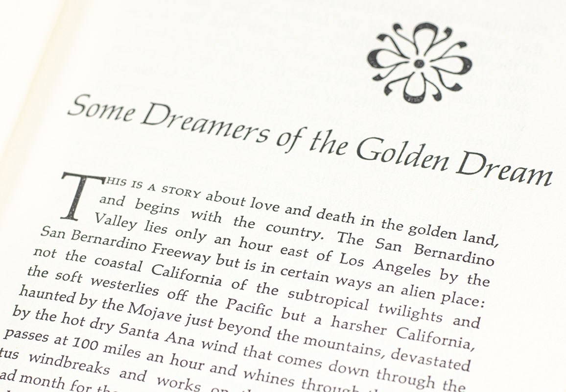 The typographic jacket for the first edition by FSG is the work of Lawrence Ratzkin. He used Profil, a contoured and shaded all-caps Clarendon. Originally issued as metal type by Haas in 1947, this is a phototype version that was distorted by means of optical effects. The lines bend toward the right, with fanned-out letterforms, creating a sense of motion. The book’s interior was designed by Guy Fleming, using Palatino – just like for The White Album, her other important essay collection from 1979.