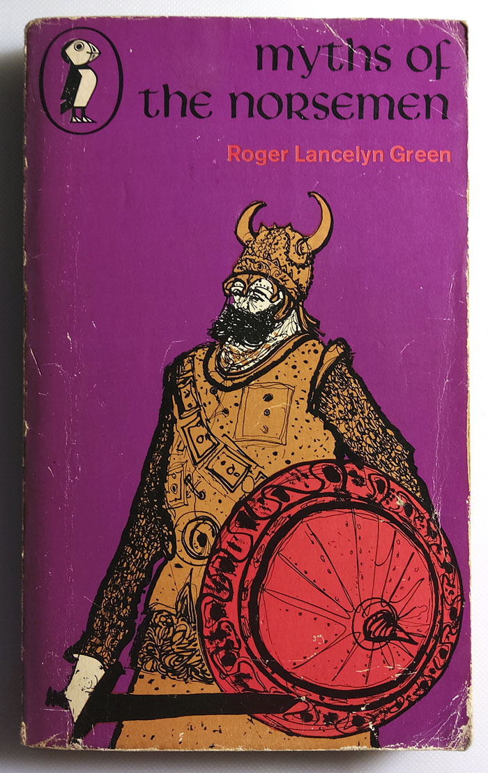 Myths of the Norsemen: Retold from the Old Norse Poems and Tales by Roger Lancelyn Green (1918–1987) was first published in 1960. This is the cover of Puffin’s paperback edition from 1976, with illustrations by Brian Wildsmith. The typeface chosen for the title is Libra: this modern uncial designed by S.H. de Roos in the 1930s strikes a good balance between the forms of Insular script as it was used in the British Isles during the Viking Age (see e.g. the Book of Durrow and the Book of Kells), and what’s easily legible to young readers today.