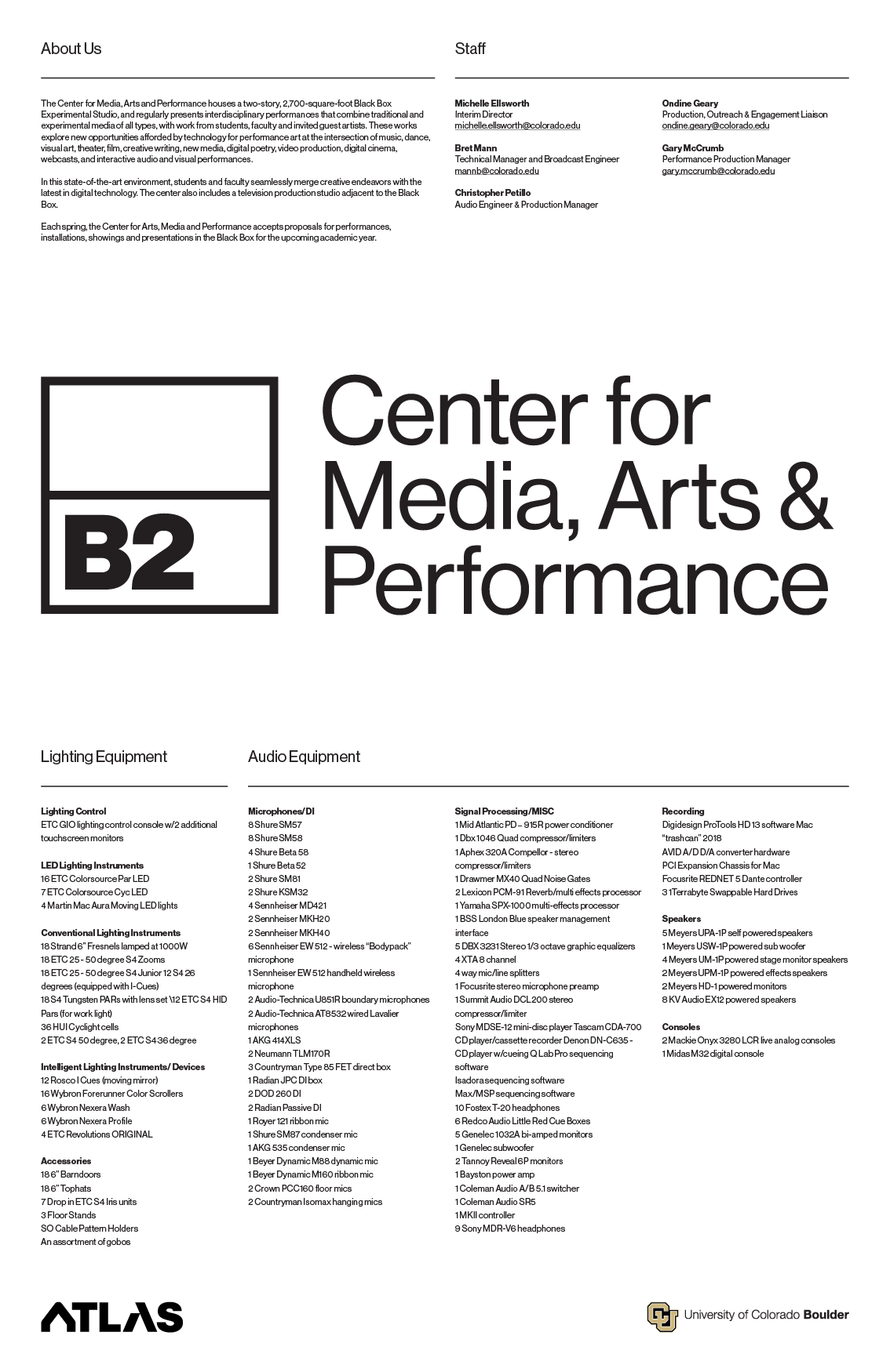 The B2 Center for Media, Art & Performance embraces convivial and interdisciplinary experimentation that co-mingles art, technology, media, science, performance, radical creativity, and [insert your practice here]. In the Black Box Experimental Studio and four studio labs on the B2 level of the Roser ATLAS building, the B2 community researches and practices intellectual/creative risk-taking, form-bending, art-making, community building, and social engagement. B2 encourages collaborations, methodologies, and productions that traverse borders and disciplines and build/unbuild the unimagined/re-imagined.