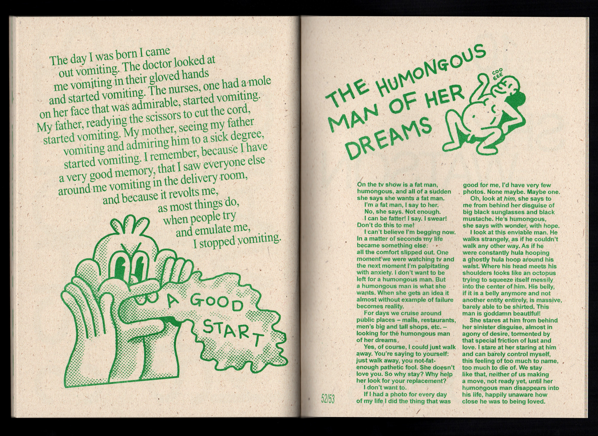 – Shane Kowalski’s mini stories explore vomiters and humongous men