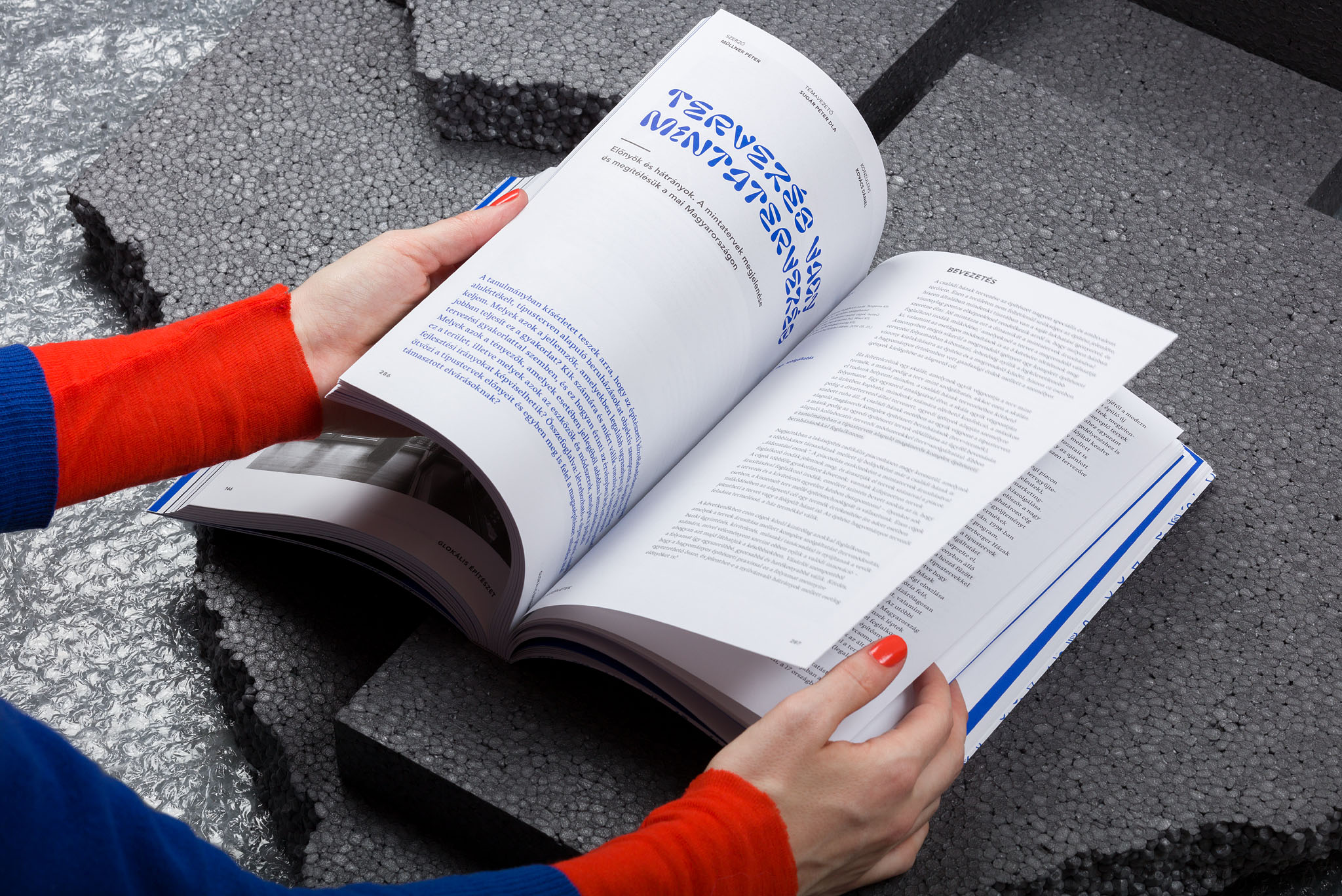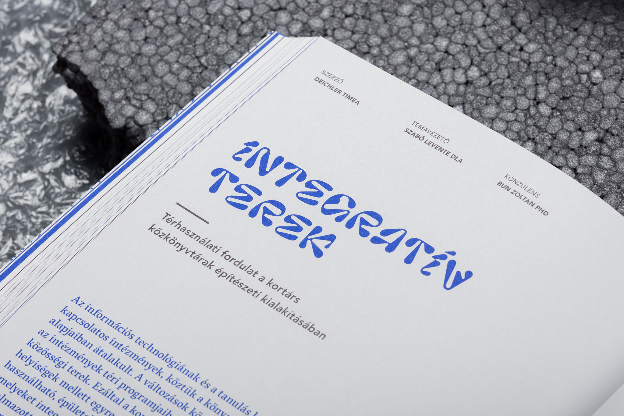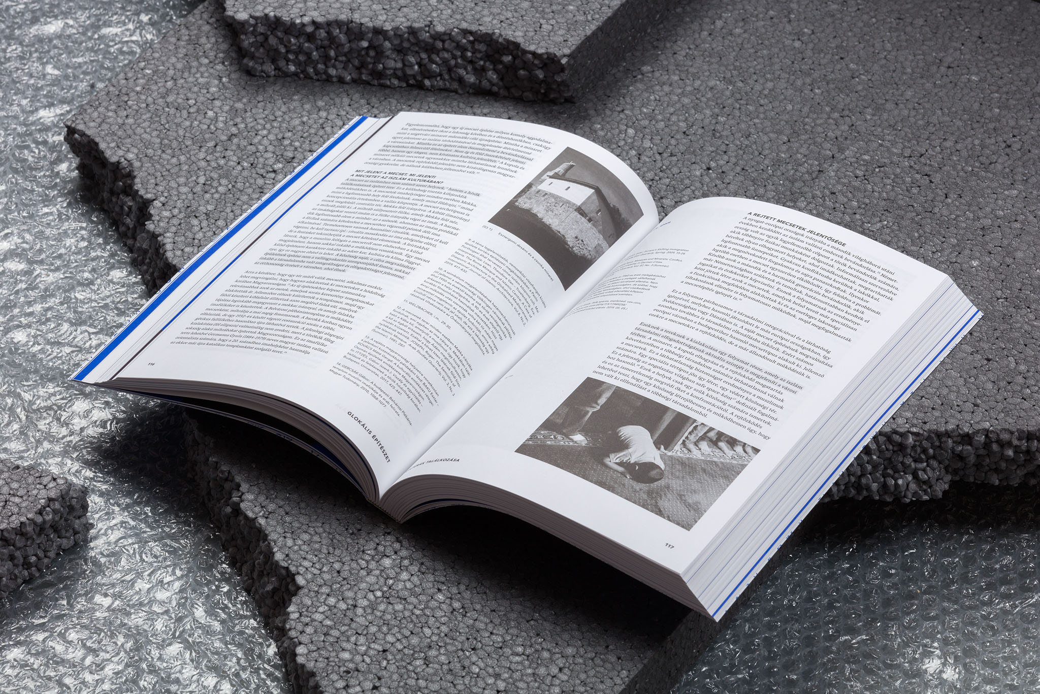 Edited by Levente Szabó, the publication was art directed and designed by Dóra Máthé, combining Pilowlava for titles with Vesper for text and Avenir for the table of contents, headings, marginal notes, running titles, page numbers. etc. The softcover book with section sewn binding was offset-printed in two colors (black, Pantone 584U blue) plus UV varnish, on Munken Lynx 100gsm and 300gsm by Elektroproduct Kft. Published by BME Doctoral School of Architecture in a limited edition of 300 copies, manually numbered on the last page.