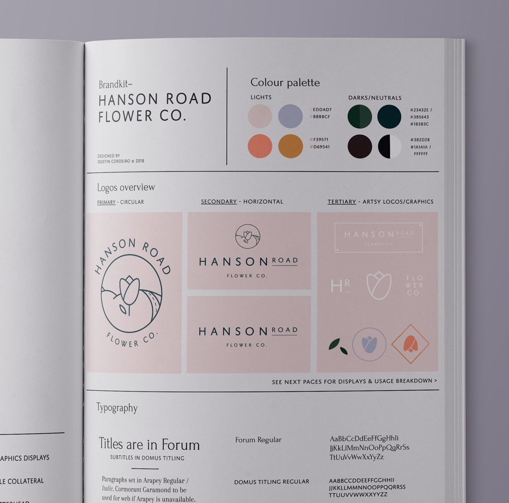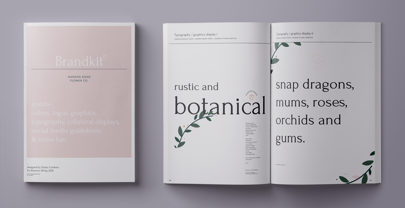 This beautiful identity for Hanson Road Flower Co. —a one-woman floristry business, based in Melbourne, Australia — features JAF Domus Titling paired with Forum. It was developed by d-co, a graphic design studio in Toronto. Note the W, which is in fact made of two overlapping V’s and not an alternate in the font.