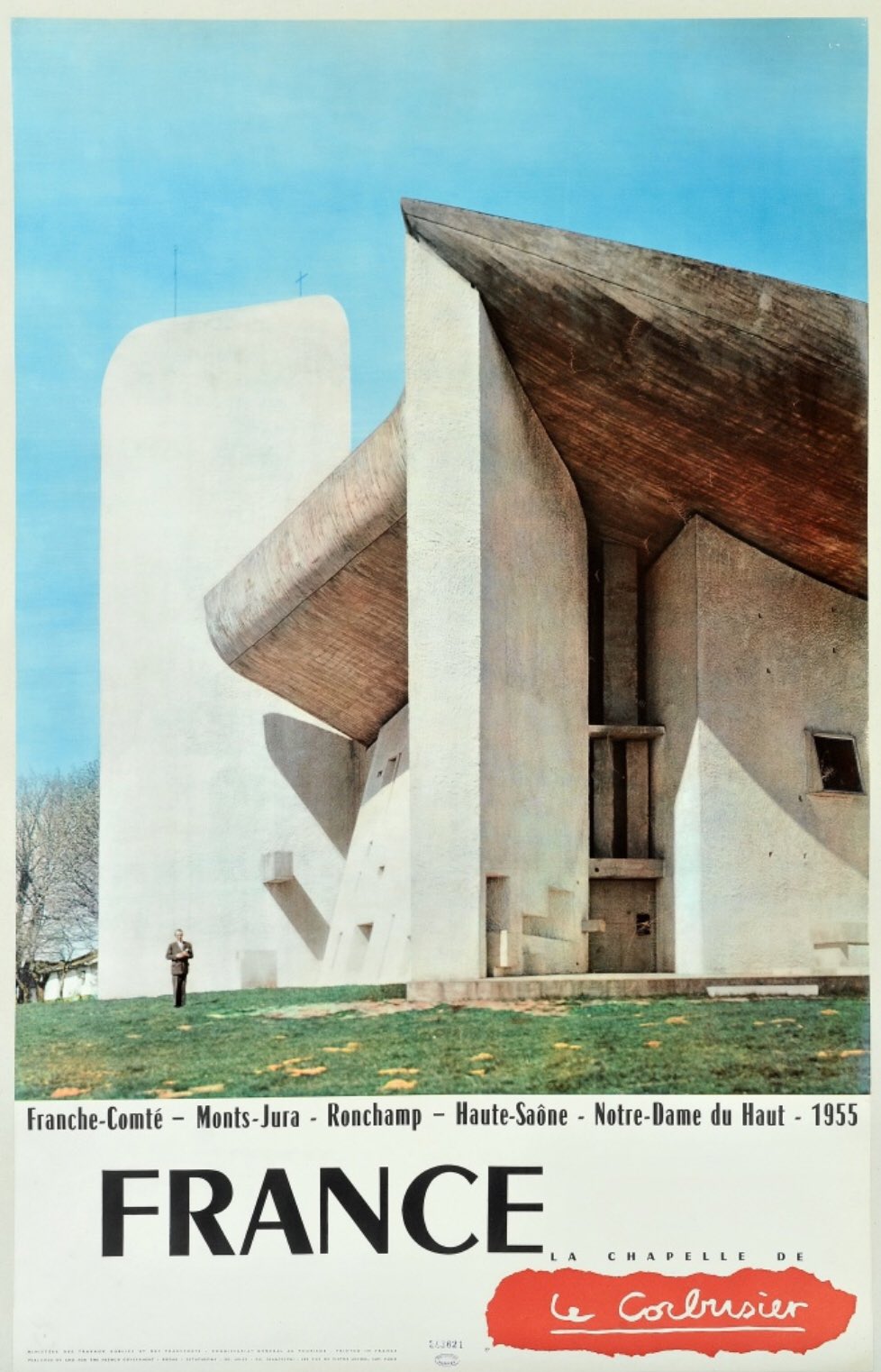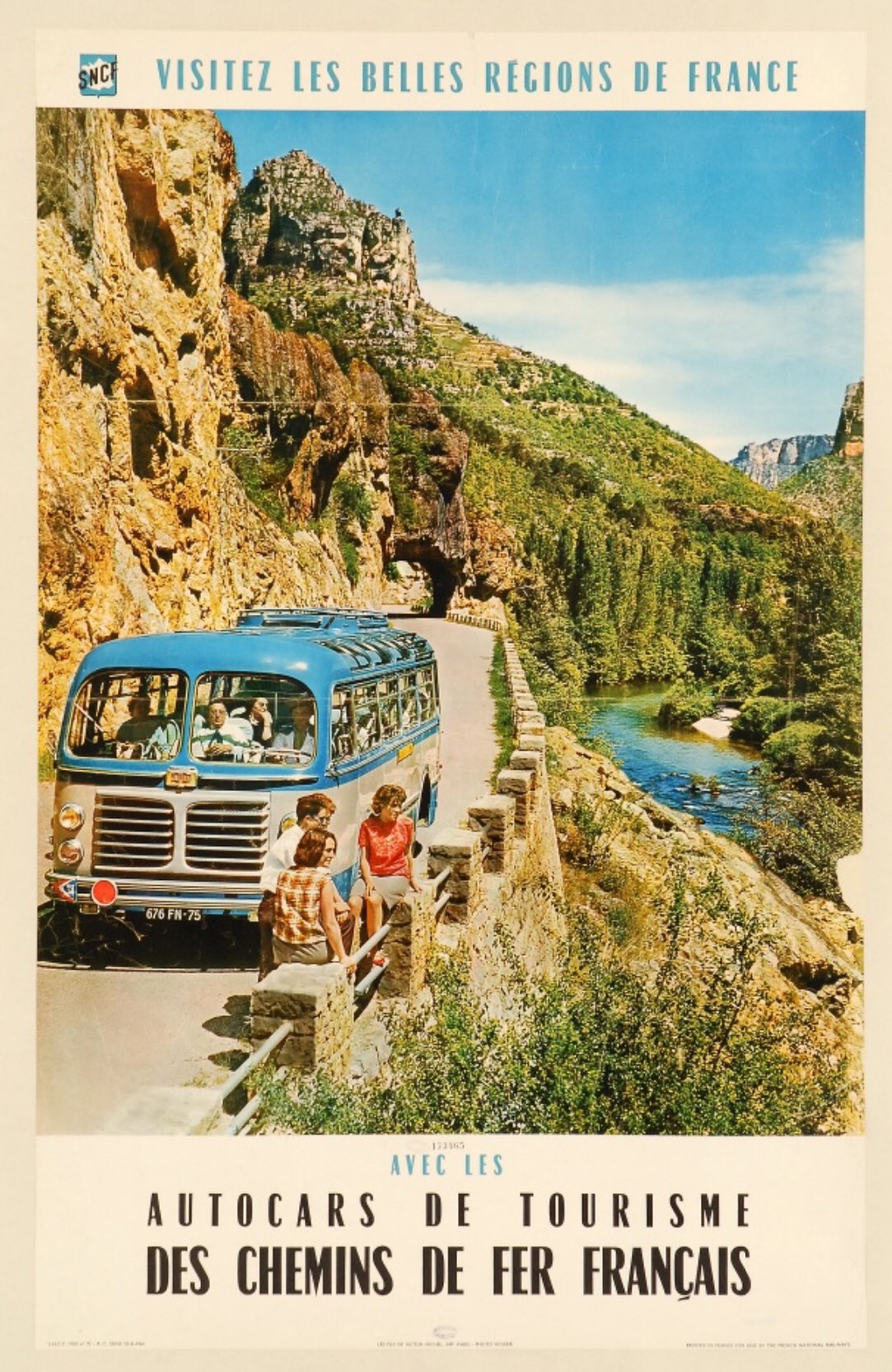 Poster by the French railway company SNCF, advertising their touristic autocar (i.e. motor coach) services, featuring Chambord étroit, a condensed member of the Chambord family designed by Roger Excoffon for Fonderie Olive, Marseilles, in 1949. Just like regular-wide Chambord closely follows Cassandre’s Peignot, the condensed is quite similar to the (all-caps) Initiales Peignot étroit.