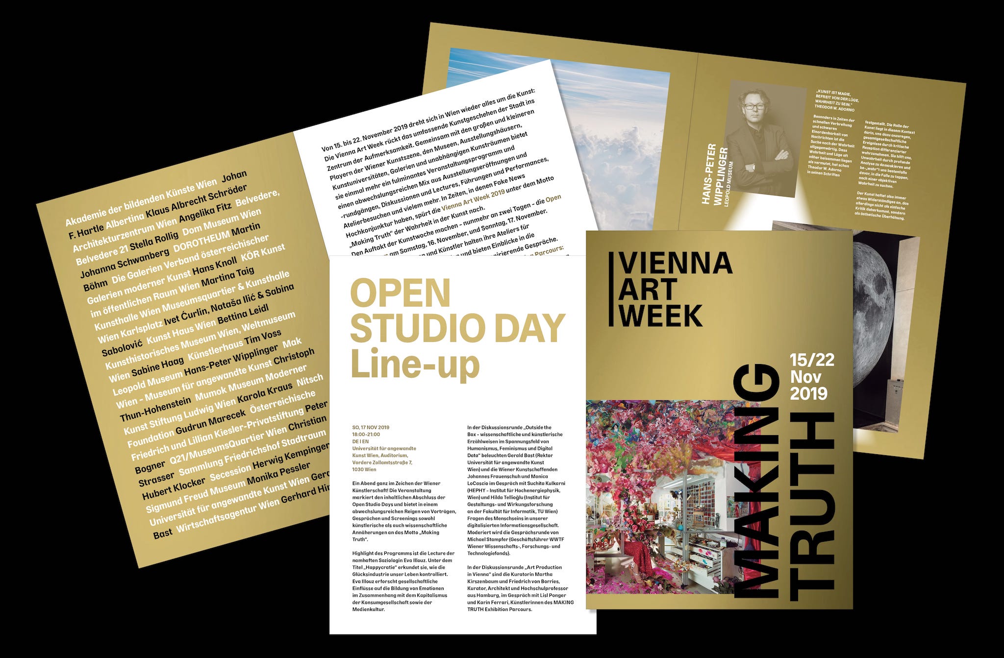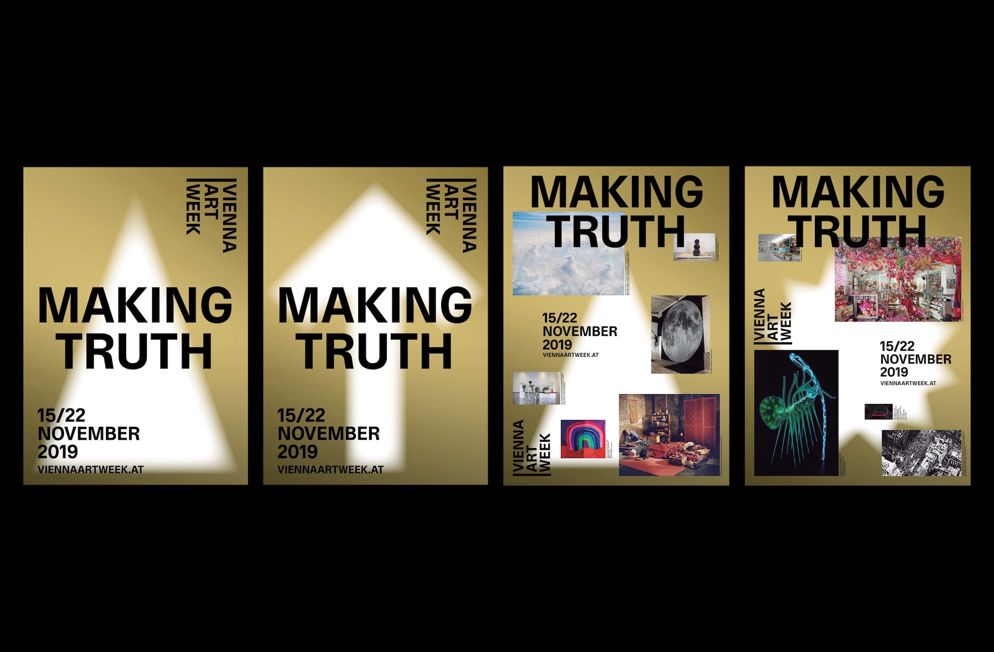 Throughout the years, multiple weights and styles have been used in a wide range of cases. The typeface was applied throughout the whole event which included facade banners, signs, balloons, bags, posters, booklets, the website and many more – most of them printed with Pantone Gold.