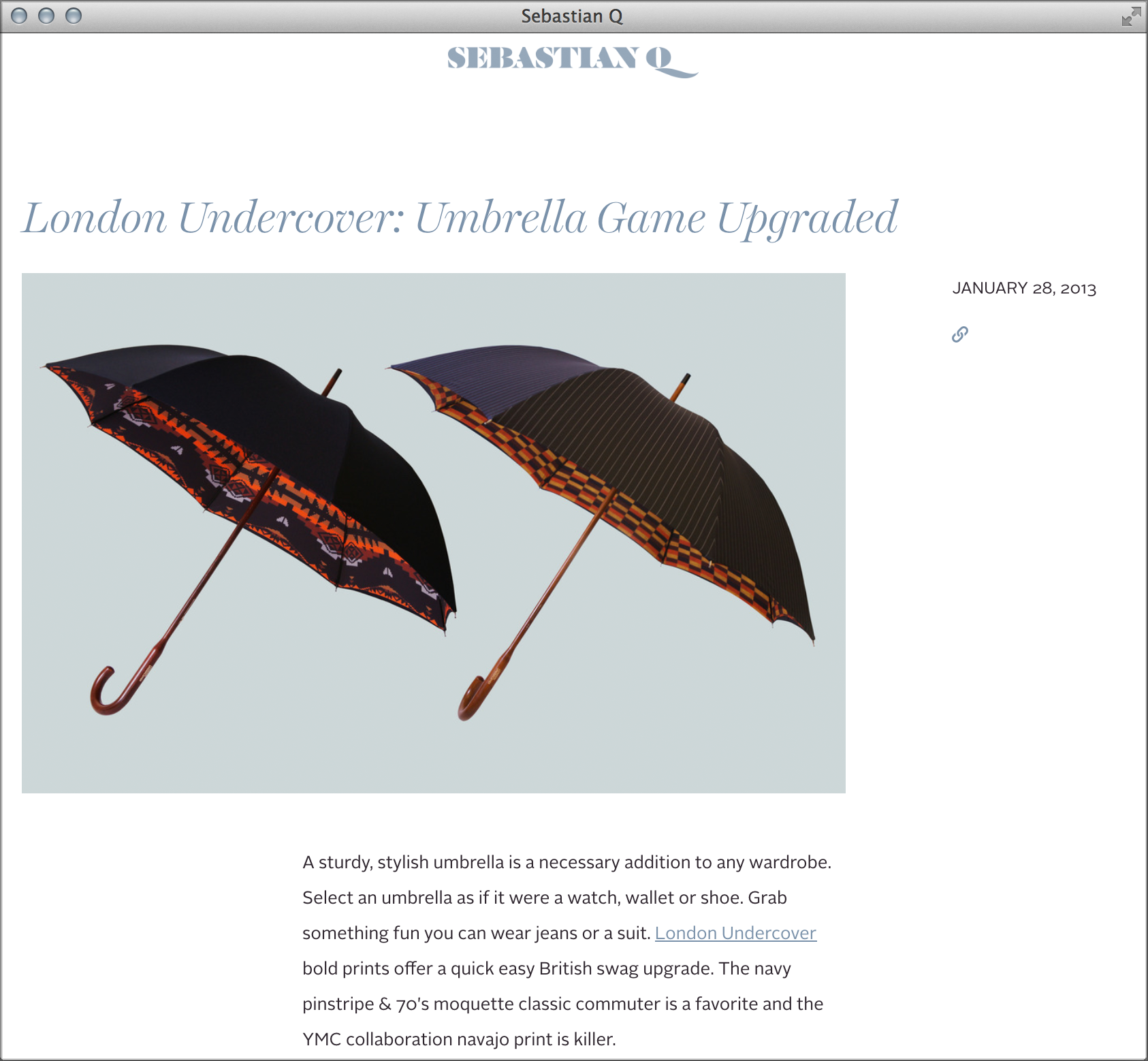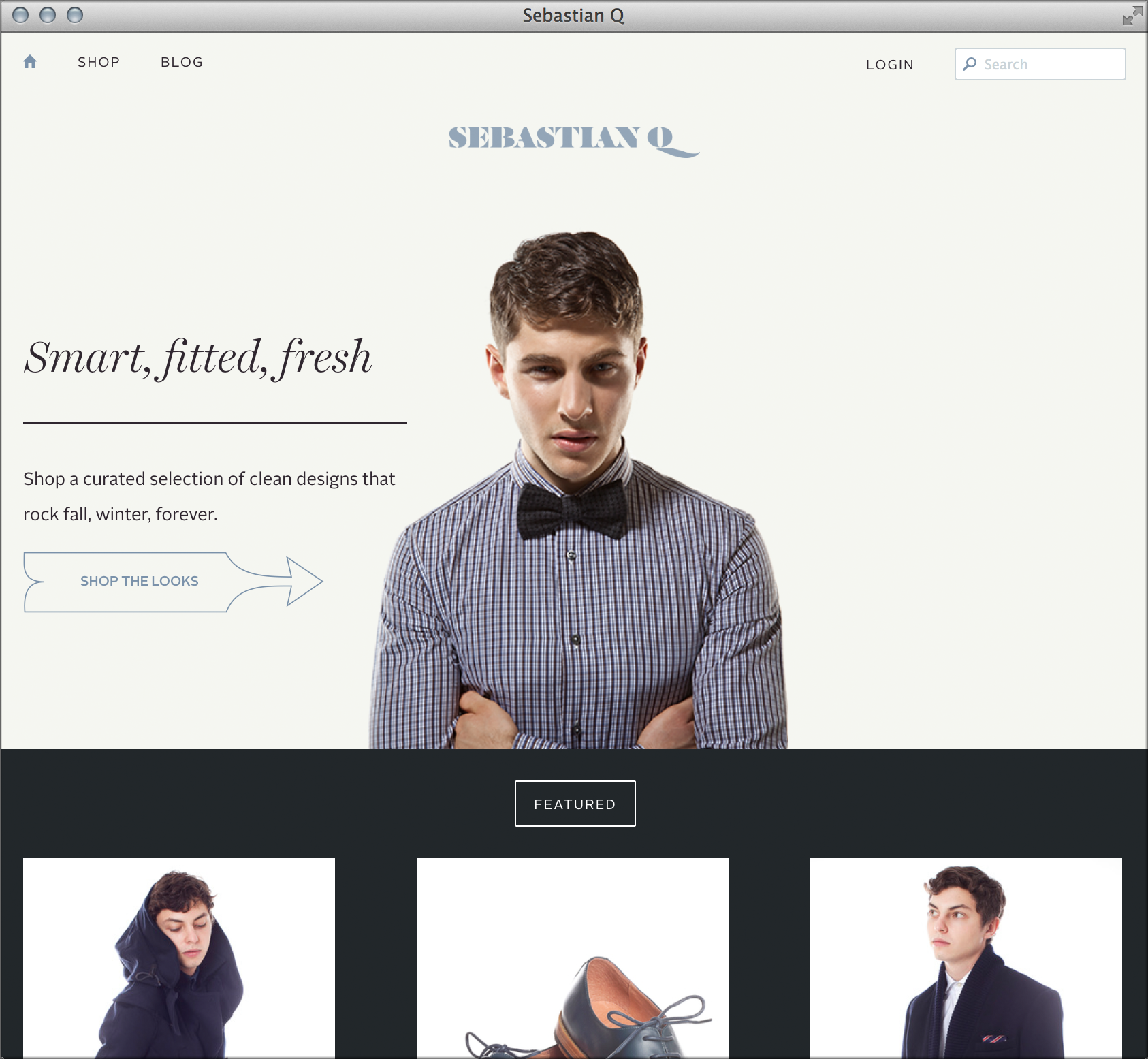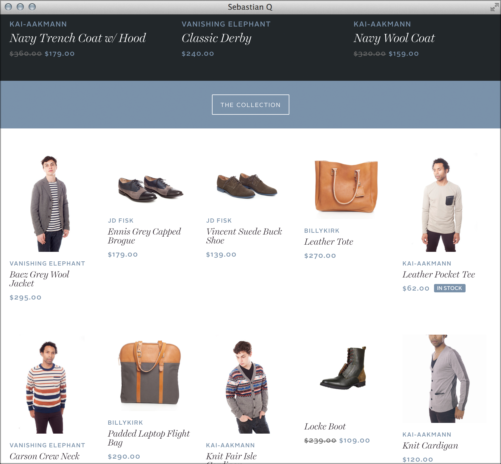 Sebastian Q is a high-quality men’s wear mailorder store based in DUMBO, Brooklyn. The shop as well as the blog use Harriet Display Light Italic for headlines and Alright Sans by Jackson Cavanaugh (Okay Type) for body copy. The logotype seems to be based on Dala Floda.