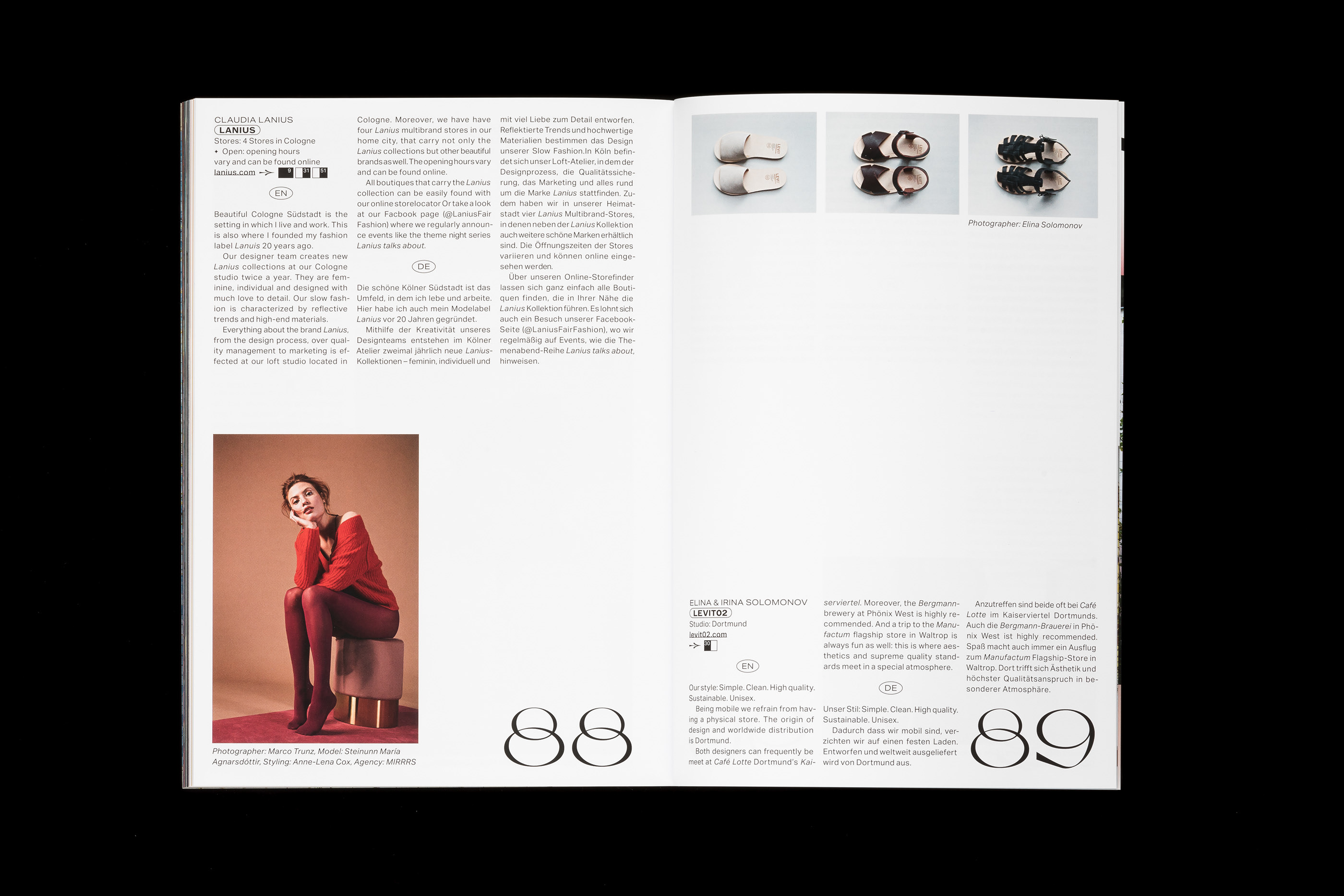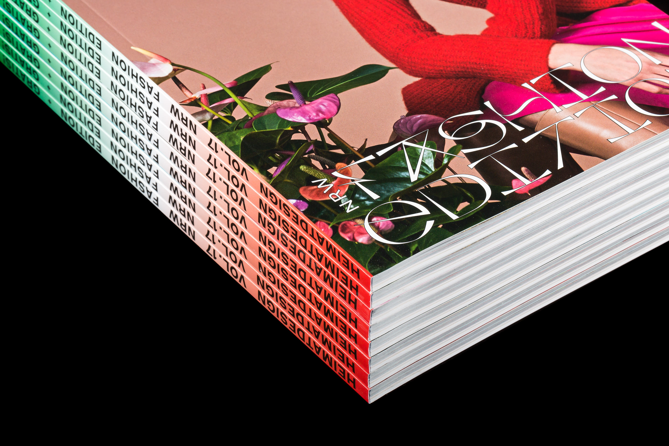 The magazine cover was printed with four pictures by different designers. It reflects the diversity and quality of the local fashion scene. The colour gradient on the back may remind you of Italy — haha, this is about fashion! — but quotes the state colors of North Rhine-Westphalia. Heimatdesign no. 17 is divided into an image and a text section. In the “Lookbook“, fashion by different designers and labels is freely combined with each other. An entertaining insight into North Rhine-Westphalia’s fashion scene.