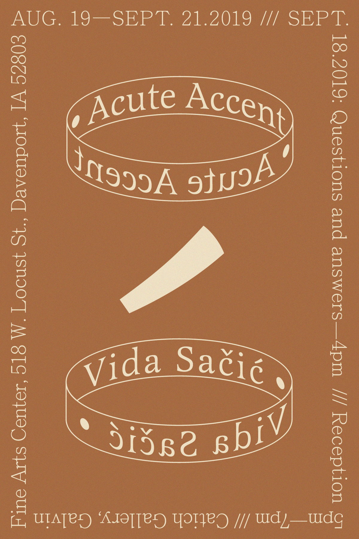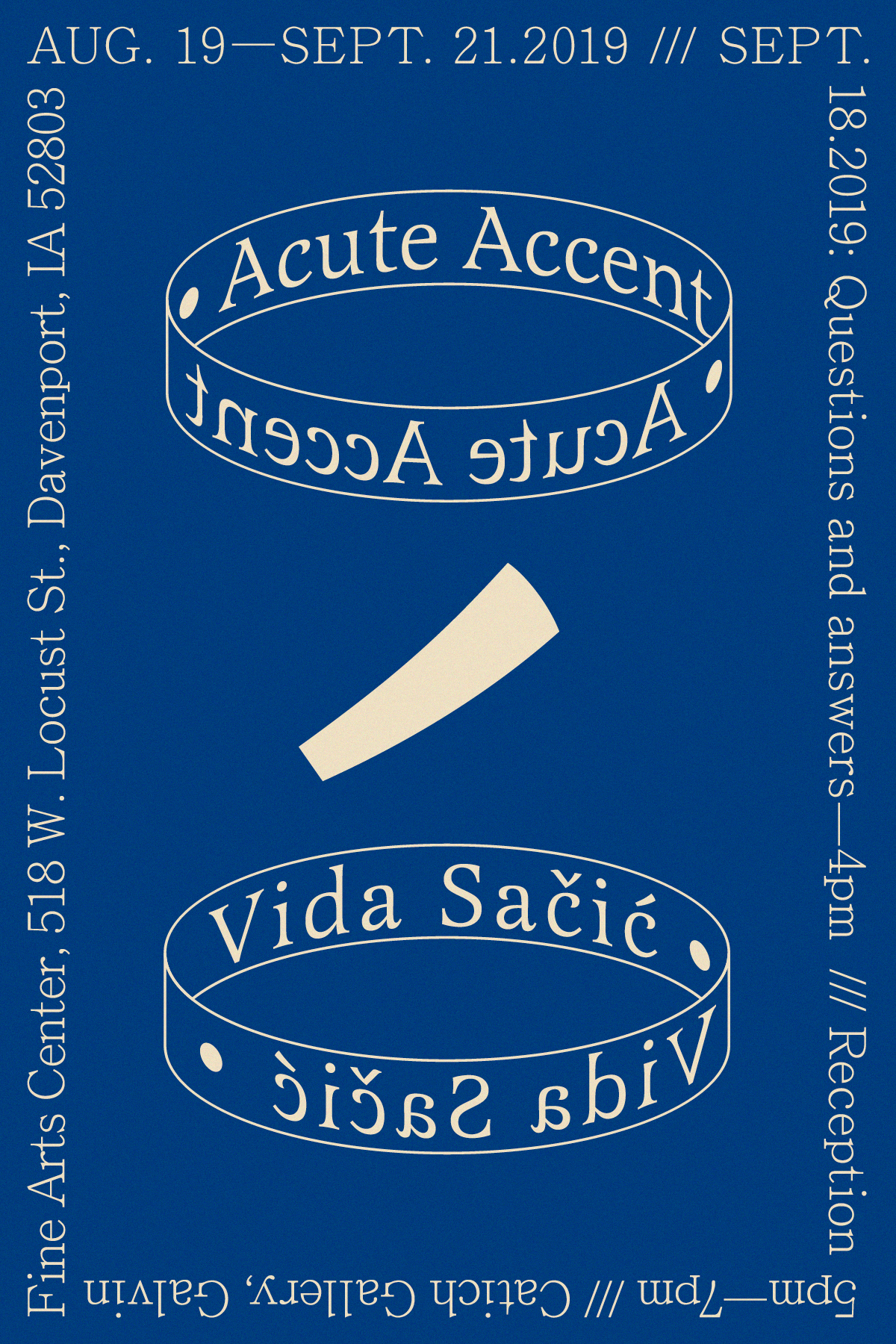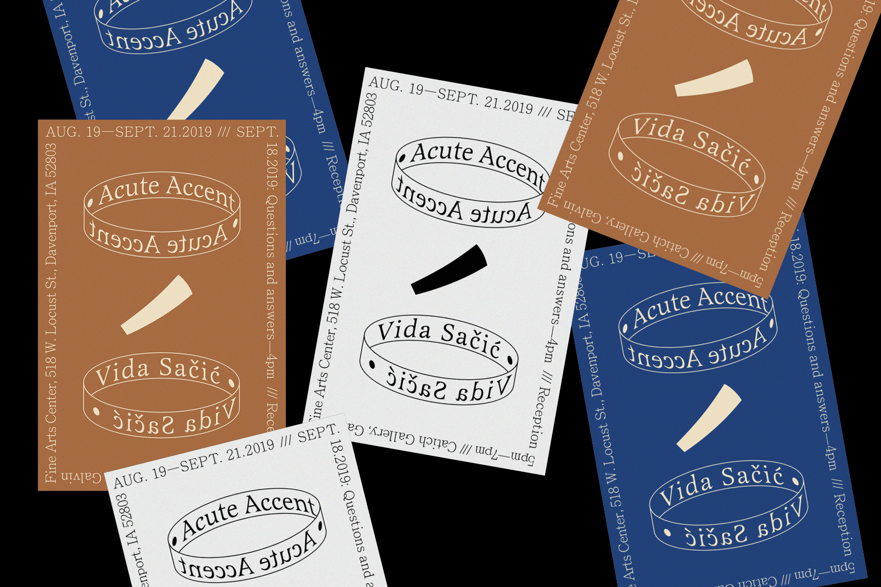 Exhibition materials designed for Chicago based artist Vida Sačić. Acute Accent refers to the acute mark (´) which can be placed over certain letters in various languages to indicate an alteration of sound such as the quality, quantity, or pitch.