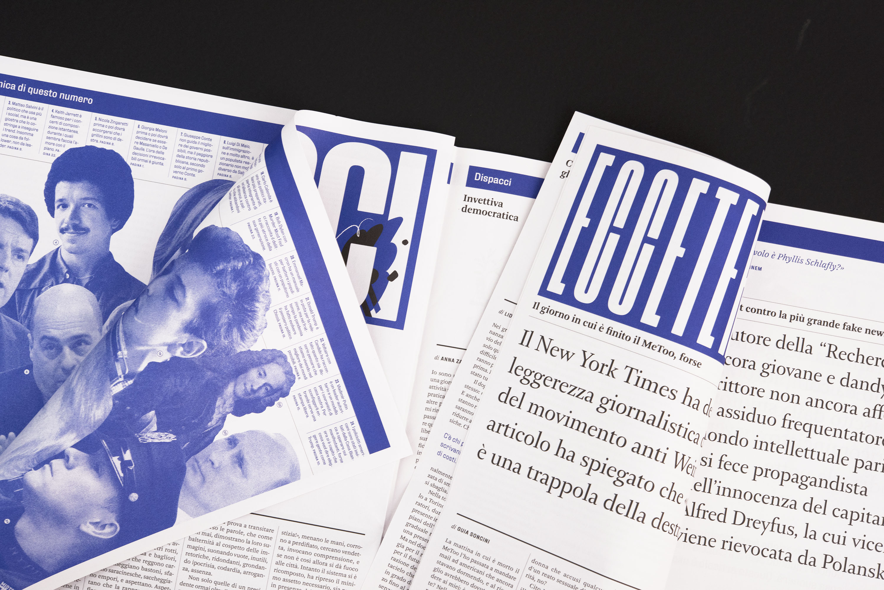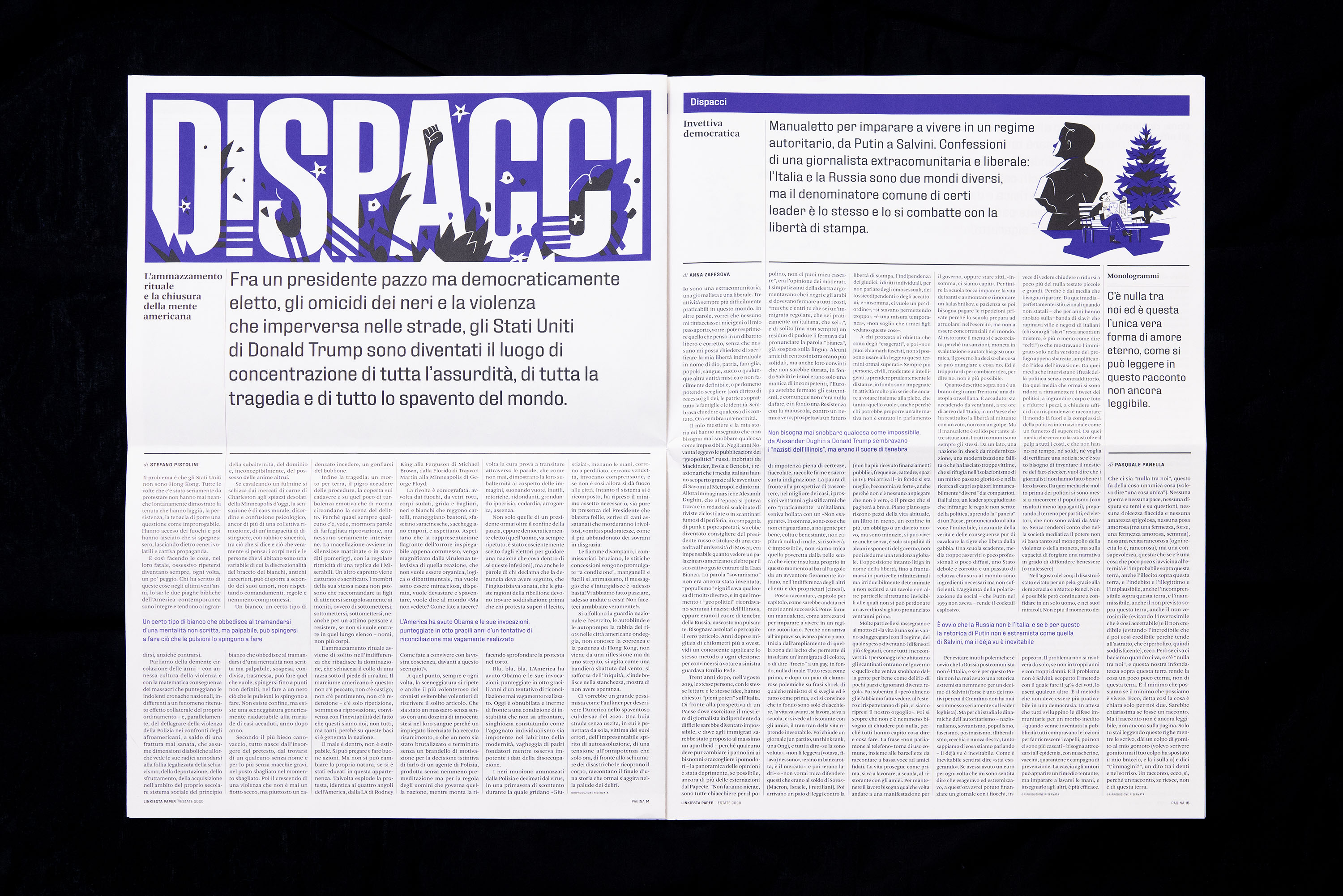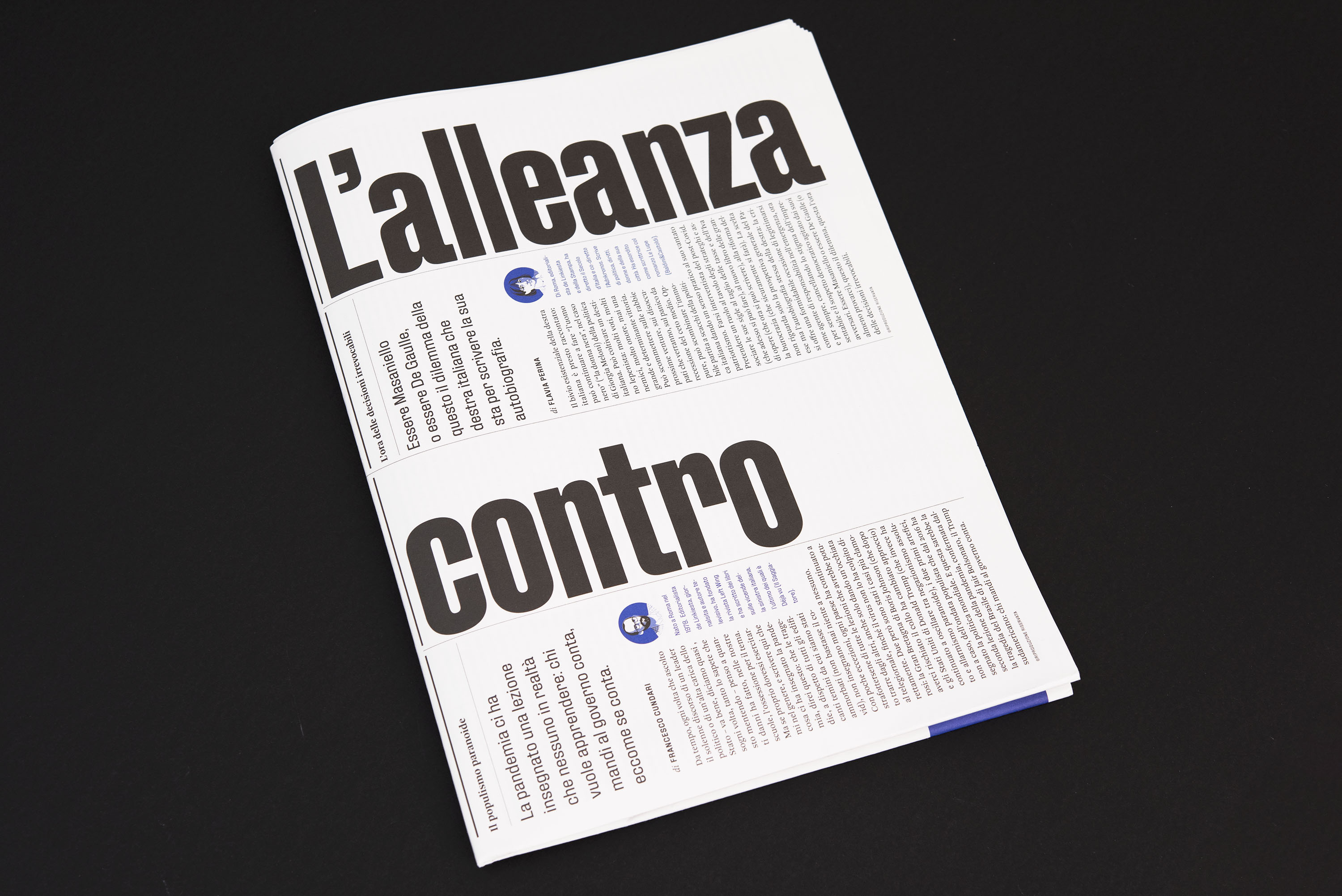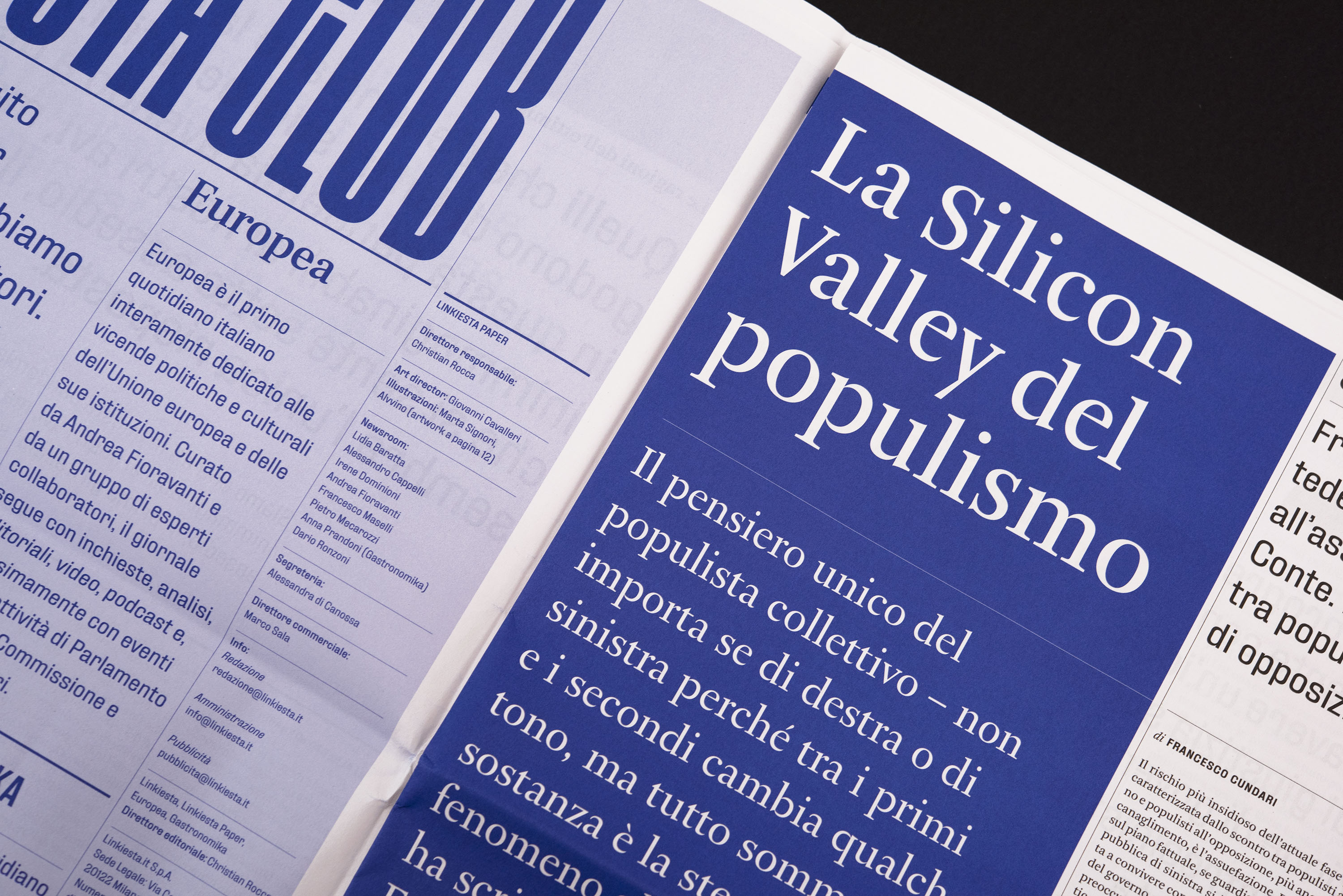 With the experience as editor of IL, the award-winning magazine of Sole 24 Ore for innovative design, Christian Rocca invited the art director Giovanni Cavalleri and the illustrators Marta Signori and Alvvino to design the paper version of Linkiesta.