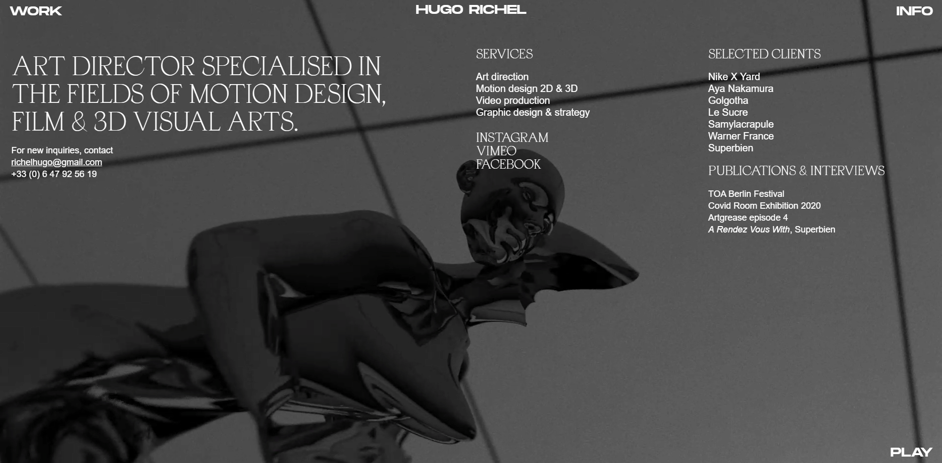 Apoc Revelations and PP Monument in use for my portfolio website. The elegant serif font created by Blaze Type is used for titles. It contrasts with the boldness of Mathieu Desjardins’s Monument Extended which is used for menus. The use of those two very different fonts tends to show the polymorphism of my work as art director. Body text is set in Helvetica.