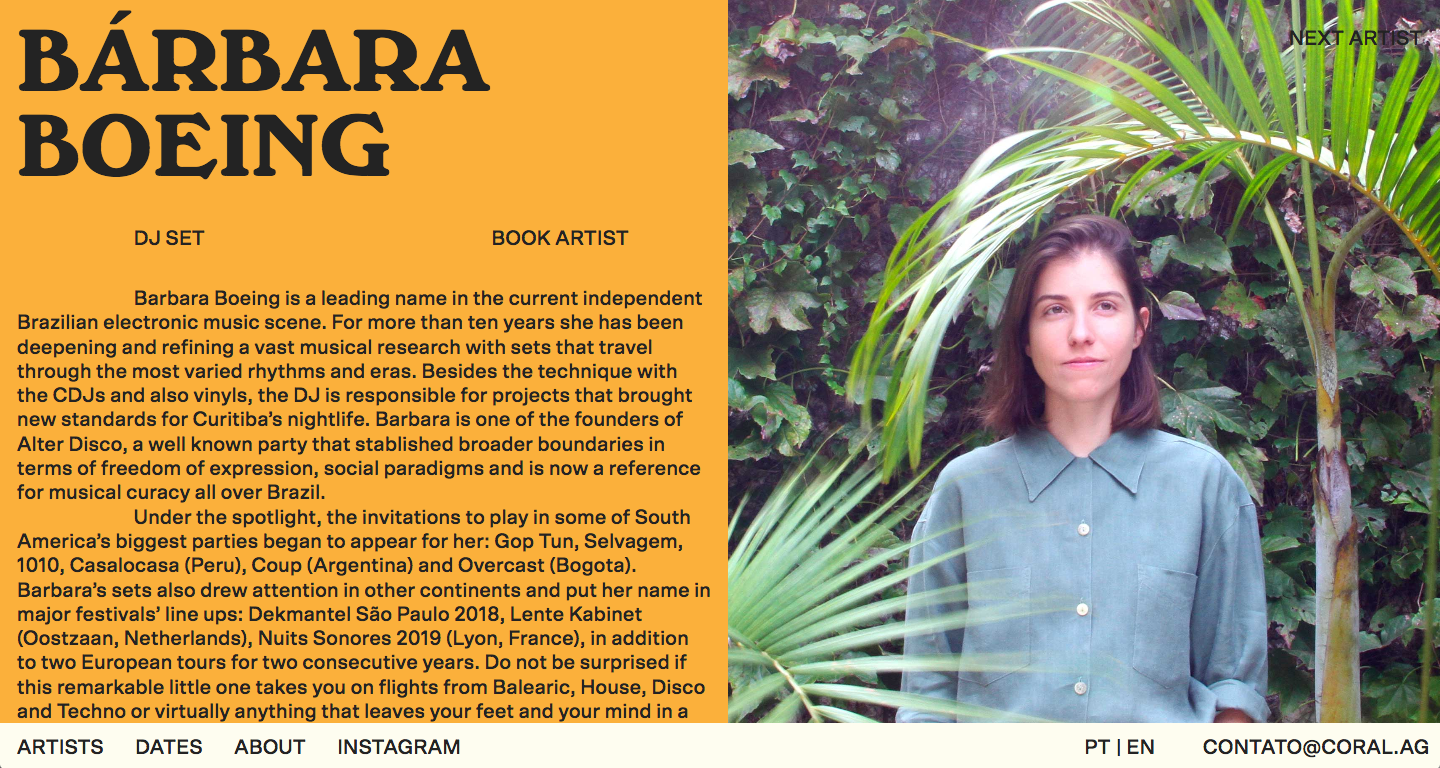 The marine coral, know for its magic colors, evoques the richness of species and diversity, an important characteristic of the agency that is not focused in just one style of electronic music, but rather, the plurality of styles found within their talents. Such qualities were represented in the identity by a large color palette made out of flashy primary colors balanced with neutral sandy tones. These values are reinforced by the silhouettes of sea corals themselves, which are animated in some digital material such as the website, throwing light at the ever changing style of the agency. The choir aspect which represents the organized and structured side of Coral, was brought into the identity by some straight composition rules such as a rigid grid, fixed text styles and classic hierarchies of content.