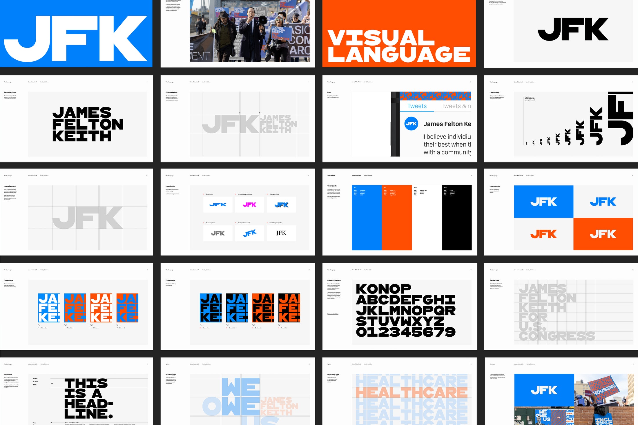 The identity for Keith’s campaign is a modular typographic system built around Mark Simonson’s HWT Konop typeface. The typeface was designed for the Hamilton Wood Type & Printing Museum to be produced as physical letterpress type, with each glyph designed in a square-based system so the wooden blocks can be rotated and locked up easily in a grid. As such, the digital version of the typeface can also be used for creating rotational grid-based systems, which Keith’s campaign takes advantage of for some of its materials.