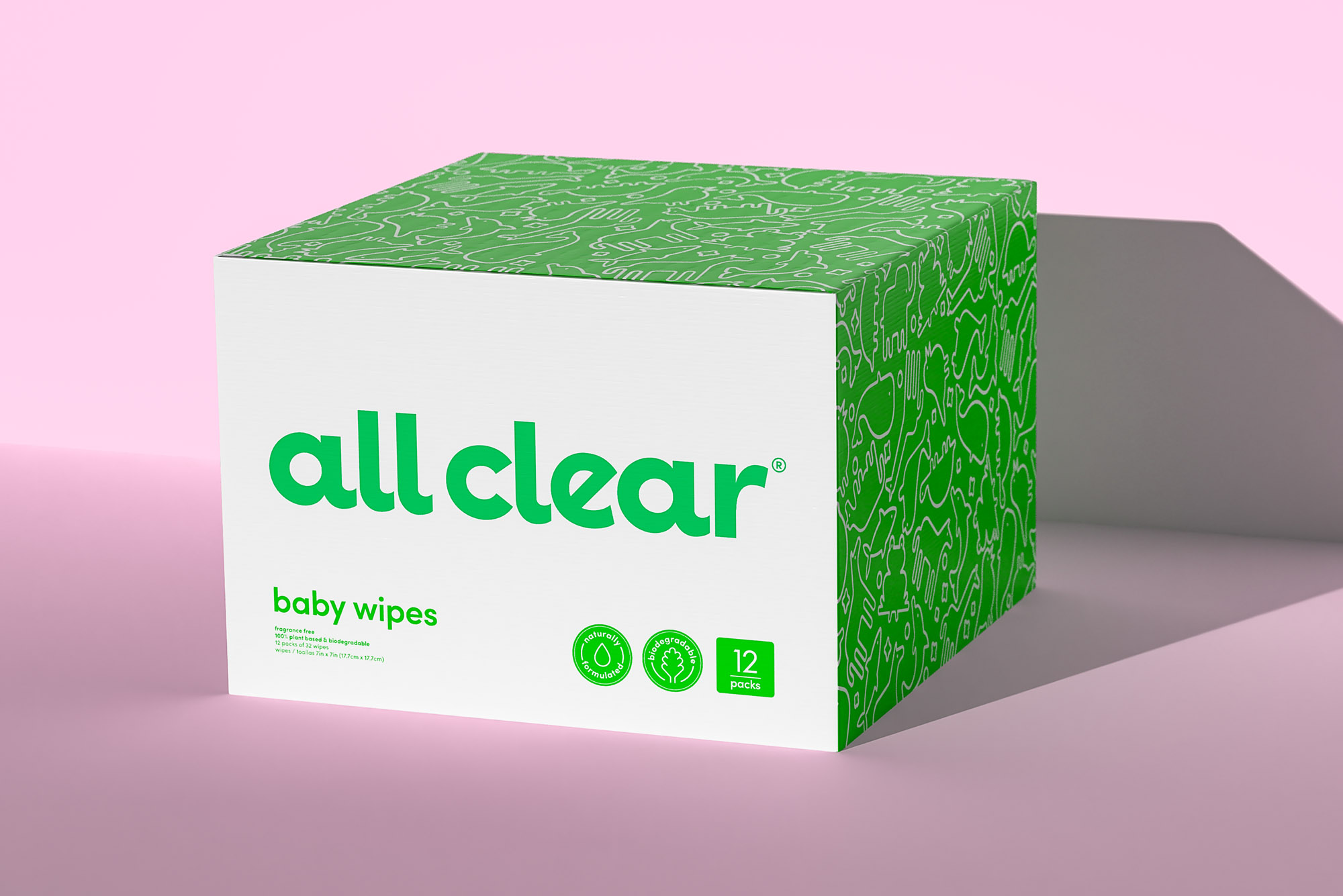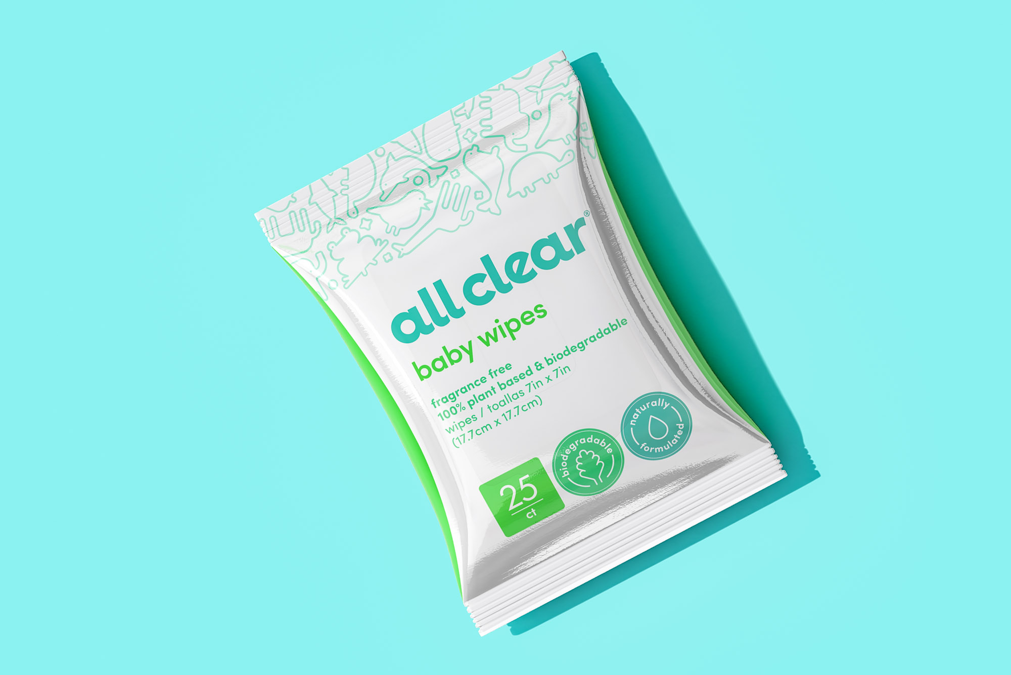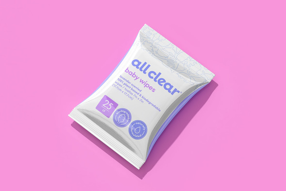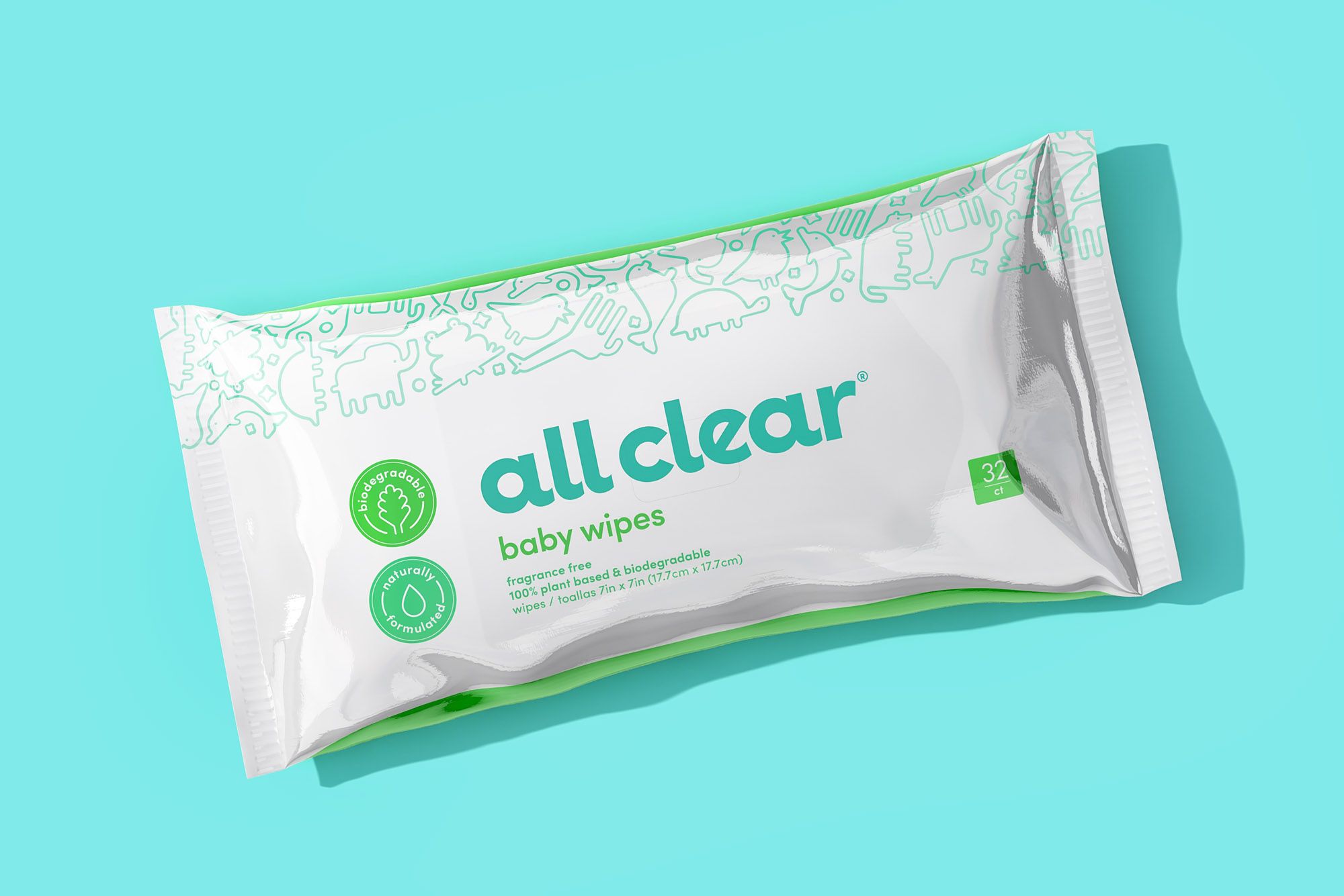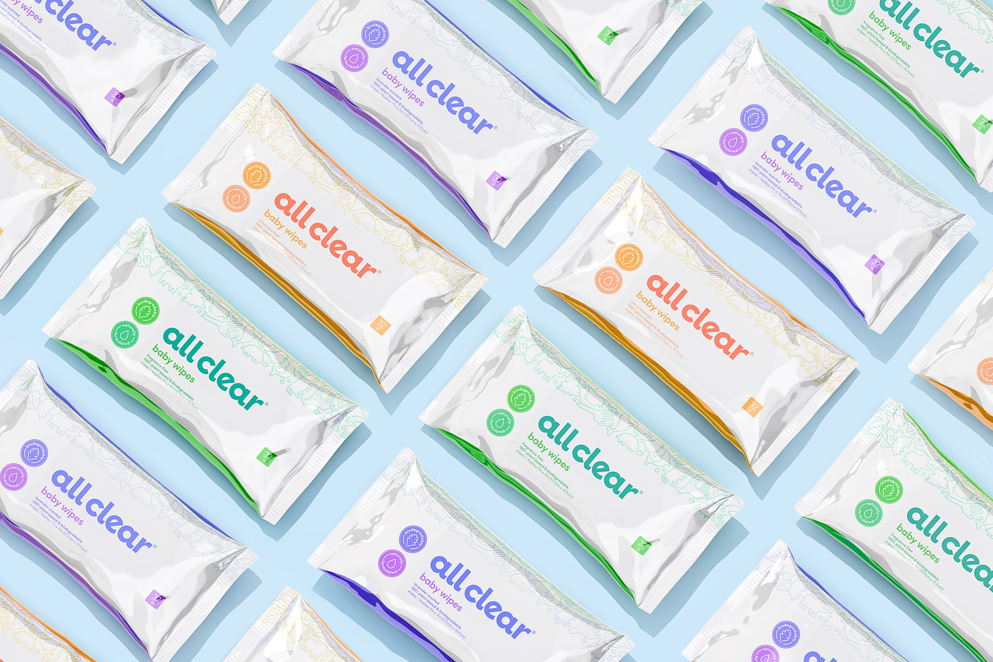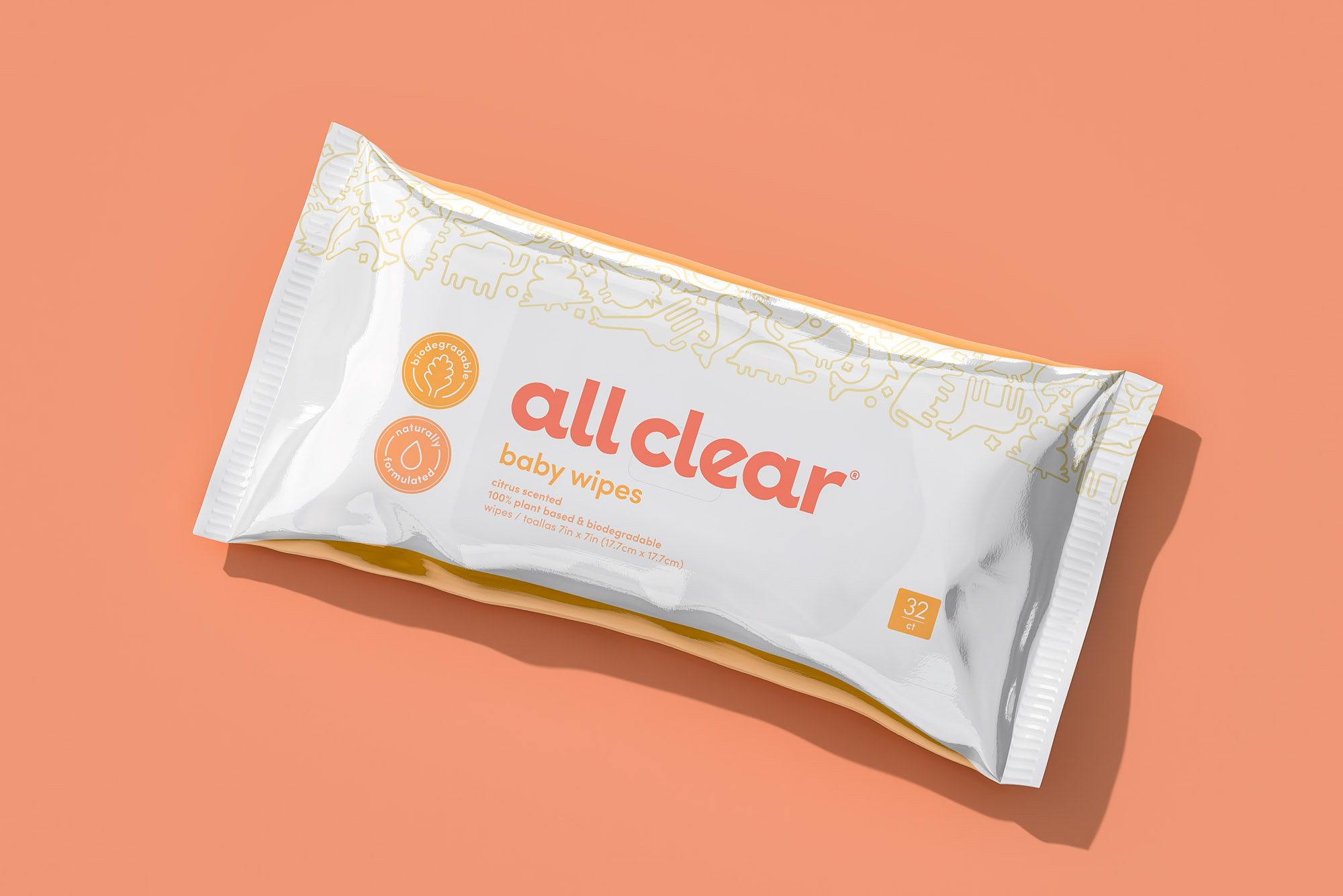 All Clear brings baby wipes with natural formulations to discount stores. Its packaging had to be modern but still friendly. We found Sofia was the perfect brand typeface because, of all the refined, new geometric sans-serifs, its letterforms feel the most subtly quirky. The logotype is custom drawn, based on Sofia Bold.