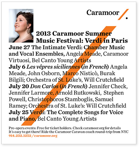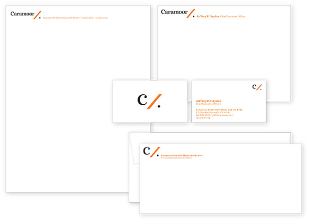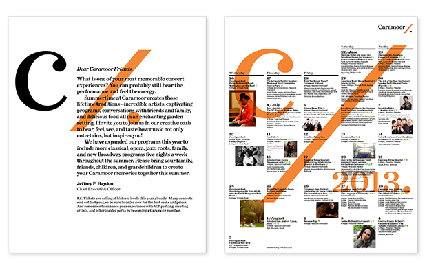 Scher and her team have created a modern identity for Caramoor that conveys its importance as an institution. The simple, graceful forms of the identity are inspired by musical notation. The ‘C’ resembles the symbol for common time, while the slanted line and dot are found in the mark for a musical simile, or segue. The slanted line also suggests a baton and can be used as a graphic divider, setting up sub-brands for different types of programming at Caramoor.
