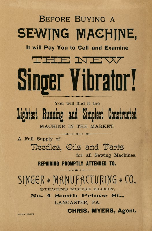 A handbill extolling the virtues of the Singer Vibrator, which was advertised as a “new” sewing machine in newspapers and magazines beginning around 1888.