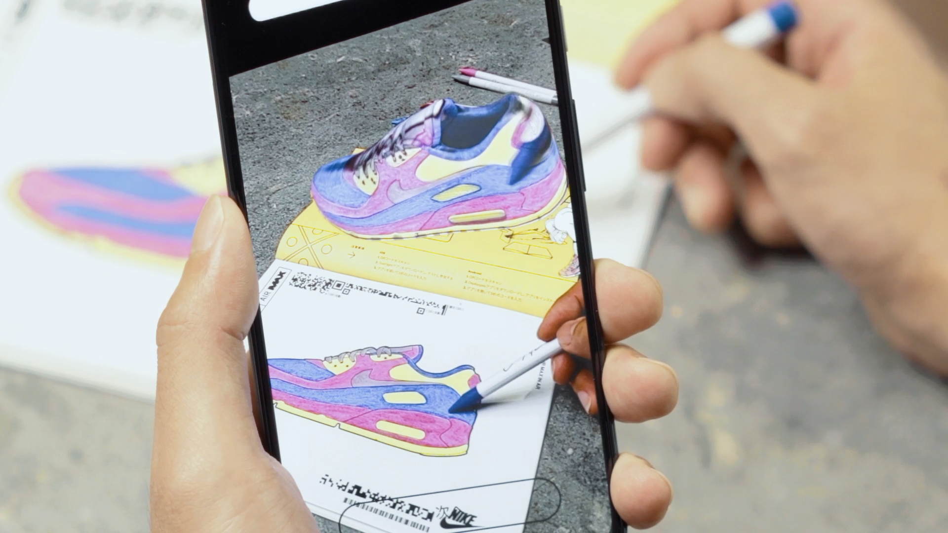 Throughout the printed zine, readers discover Air Max inspired creativity, plus black-and-white illustrations. They scan the blank shoes with a smartphone to generate a floating AR model. As the shoe is coloured in on the page, the 3D model changes to reflect the creation. Once finished an animation of the design can be shared to social channels.
