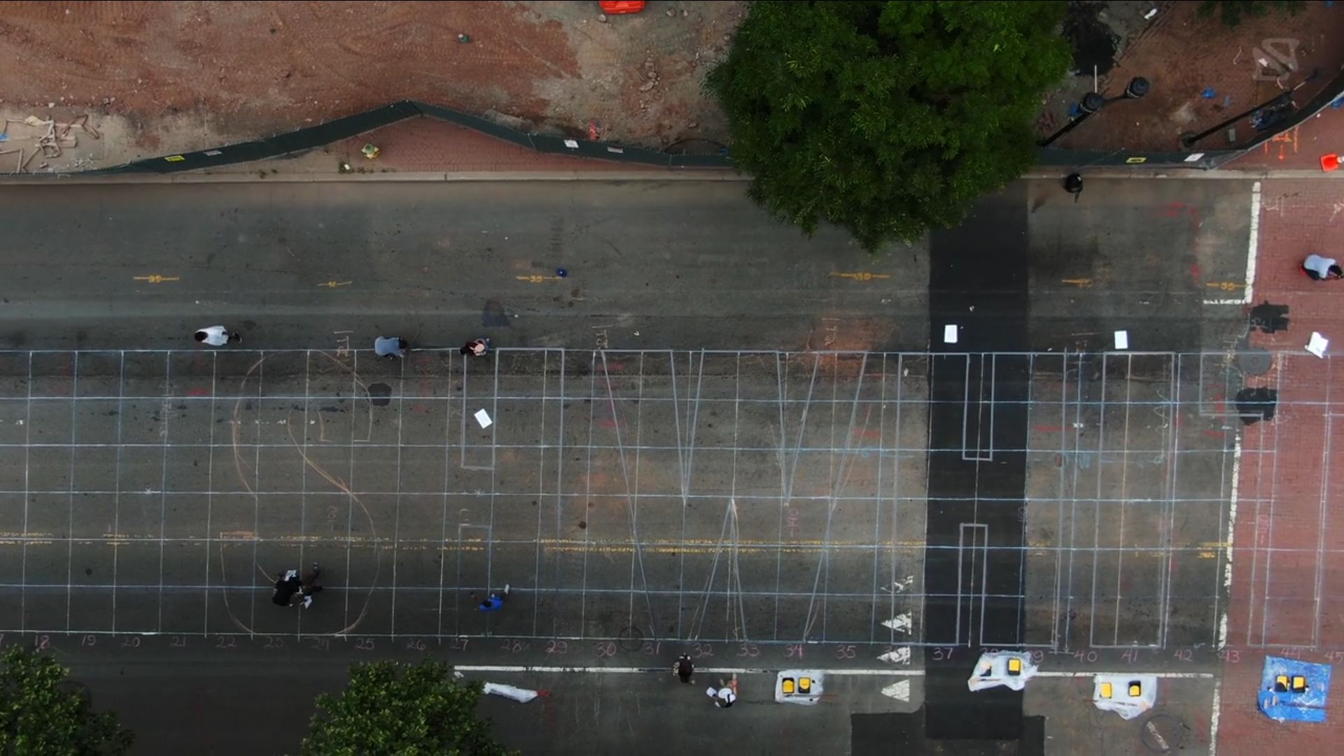 The video produced by DreamPlay Media shows that the text was first drawn in outline on a grid. This preliminary step helped to accurately transfer the proportions and spacing. In a second step, the outlines were further defined with a brush. The letterforms, which measure 25 feet in height (or 21,600 pt), were then filled in with large rollers, using weatherproof traffic paint. For more info including a full list of credits, see the article by DreamPlay Media.