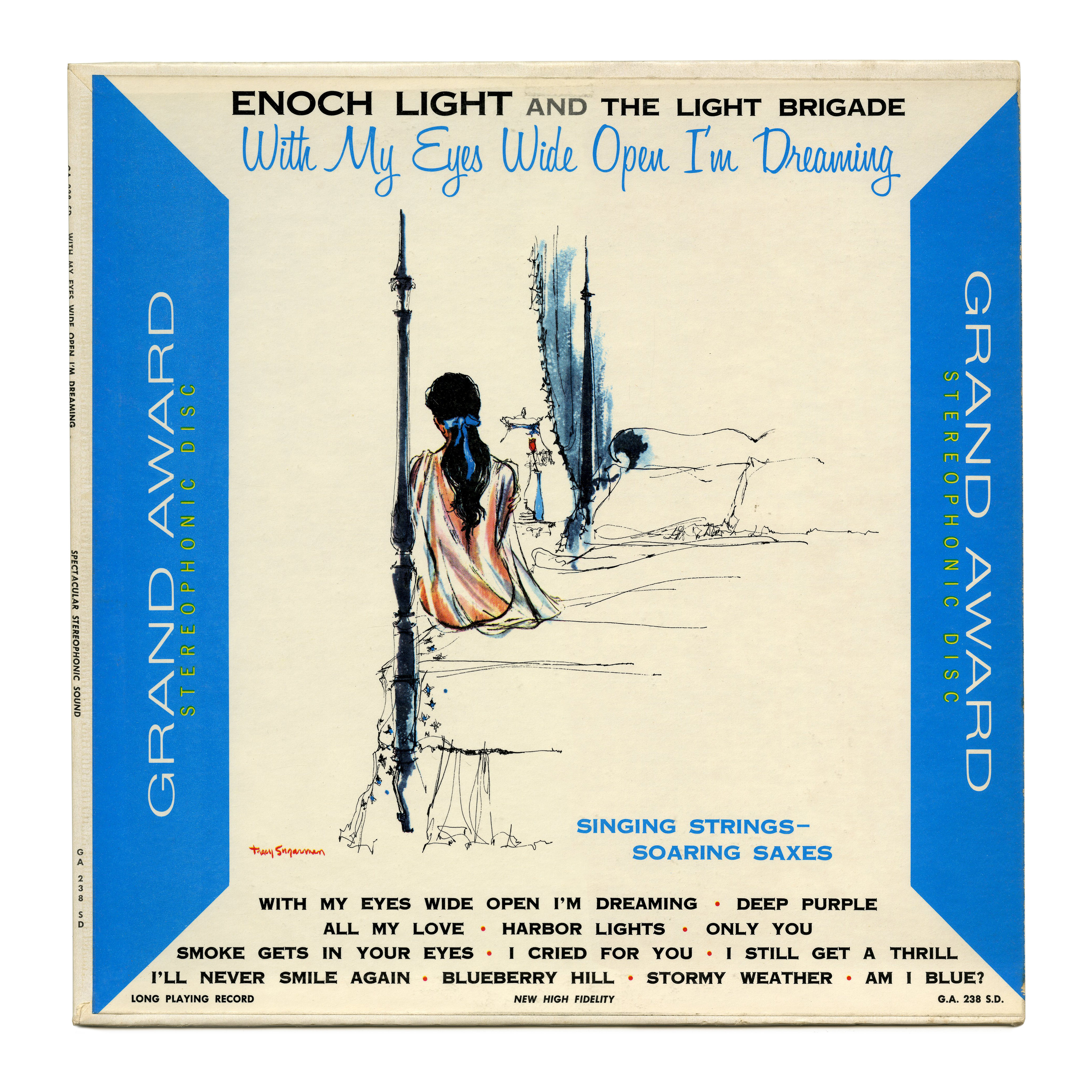 Unlike on many other earlier covers by the label, the rotated type in the trapezoids is not set in Caslon 540 Italic with Clarendon caps, but in two light sans-serif styles of contrasting width, possibly a stretched light Helvetica with Lightline or News Gothic. There’s at least one other record featuring this modernized framework, The Ink Spots’ “Greatest” Vol. 3, also from 1960. Soon after, the whole device was dropped, making room for individual artwork. The Illustration for the depicted sleeve is by Tracy Sugarman.