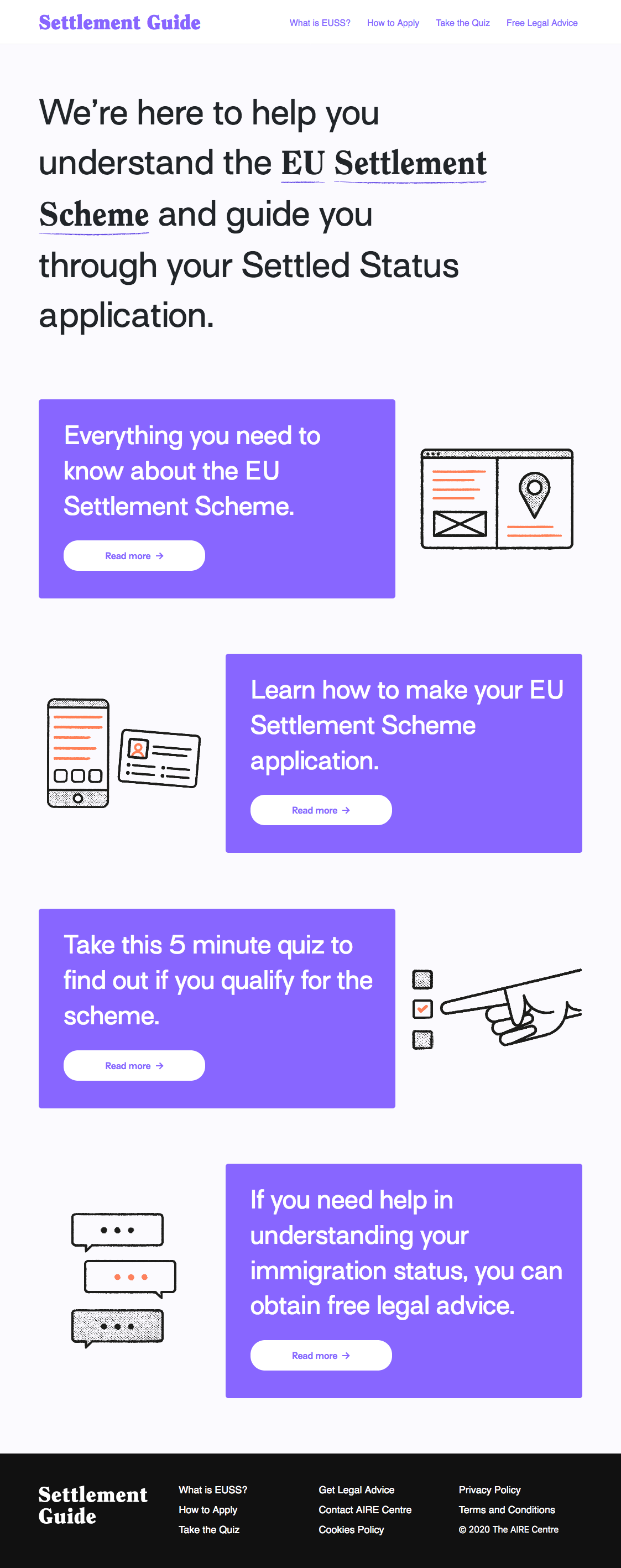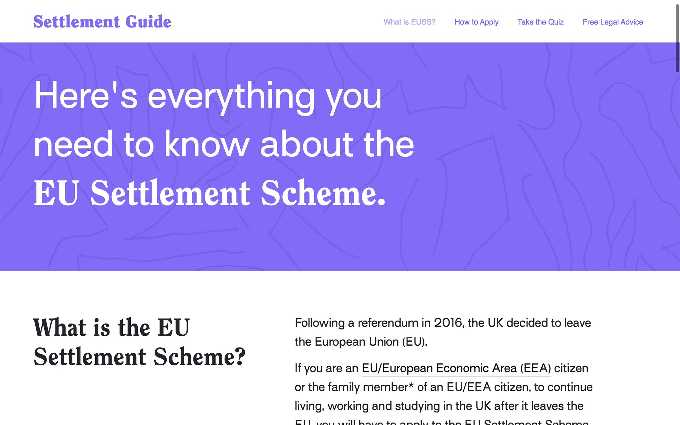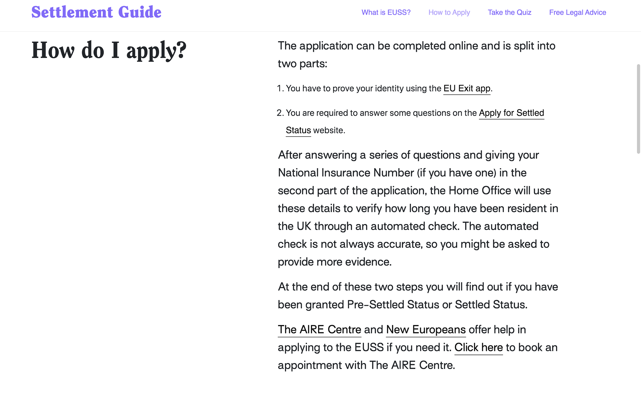 Created by The AIRE Centre with the help of partner organisations, the EU Settlement Guide has been developped in order to help young people and those in care find out if they need to apply under the EU Settlement Scheme and to help them secure their immigration status in the UK if they do need to apply.
