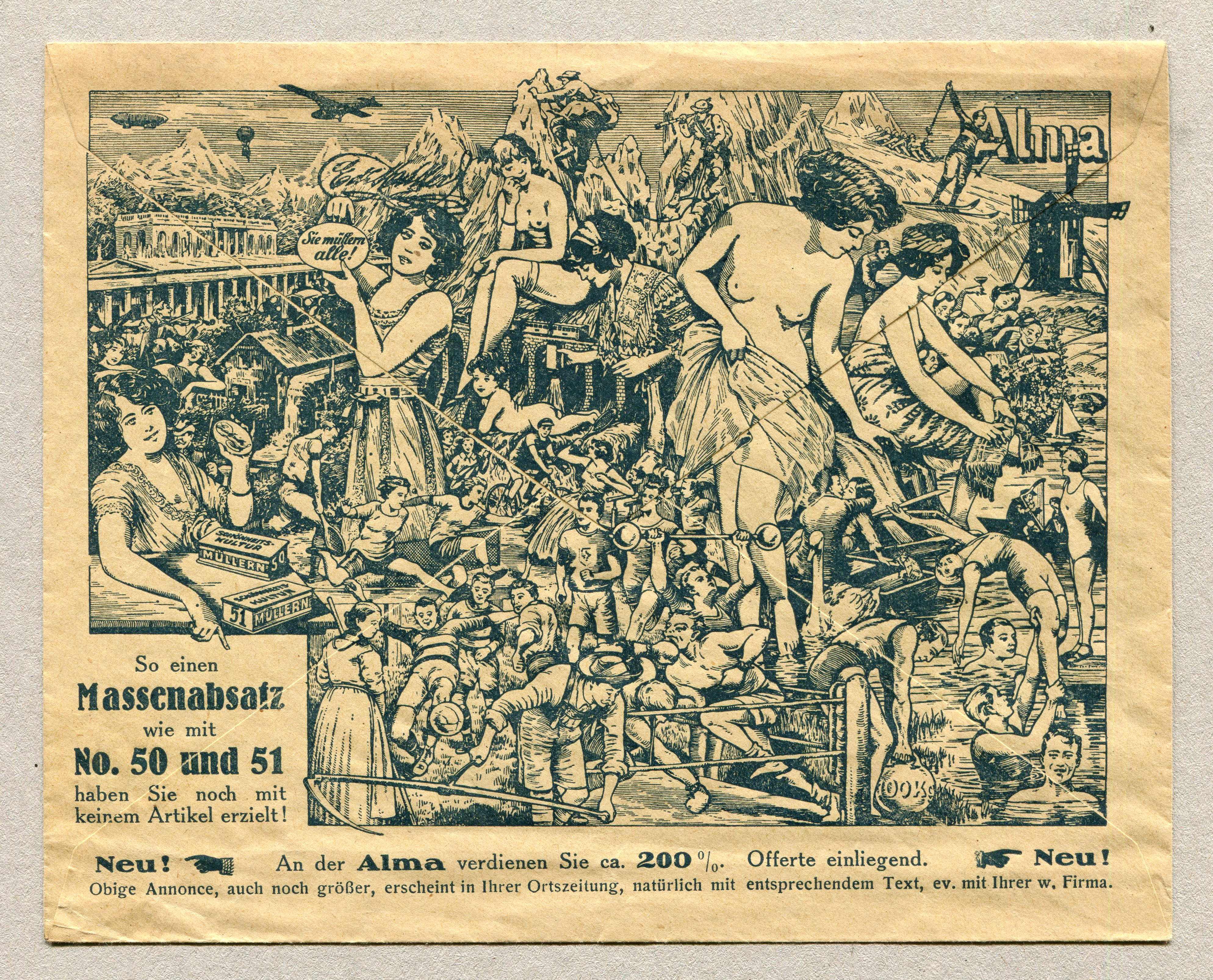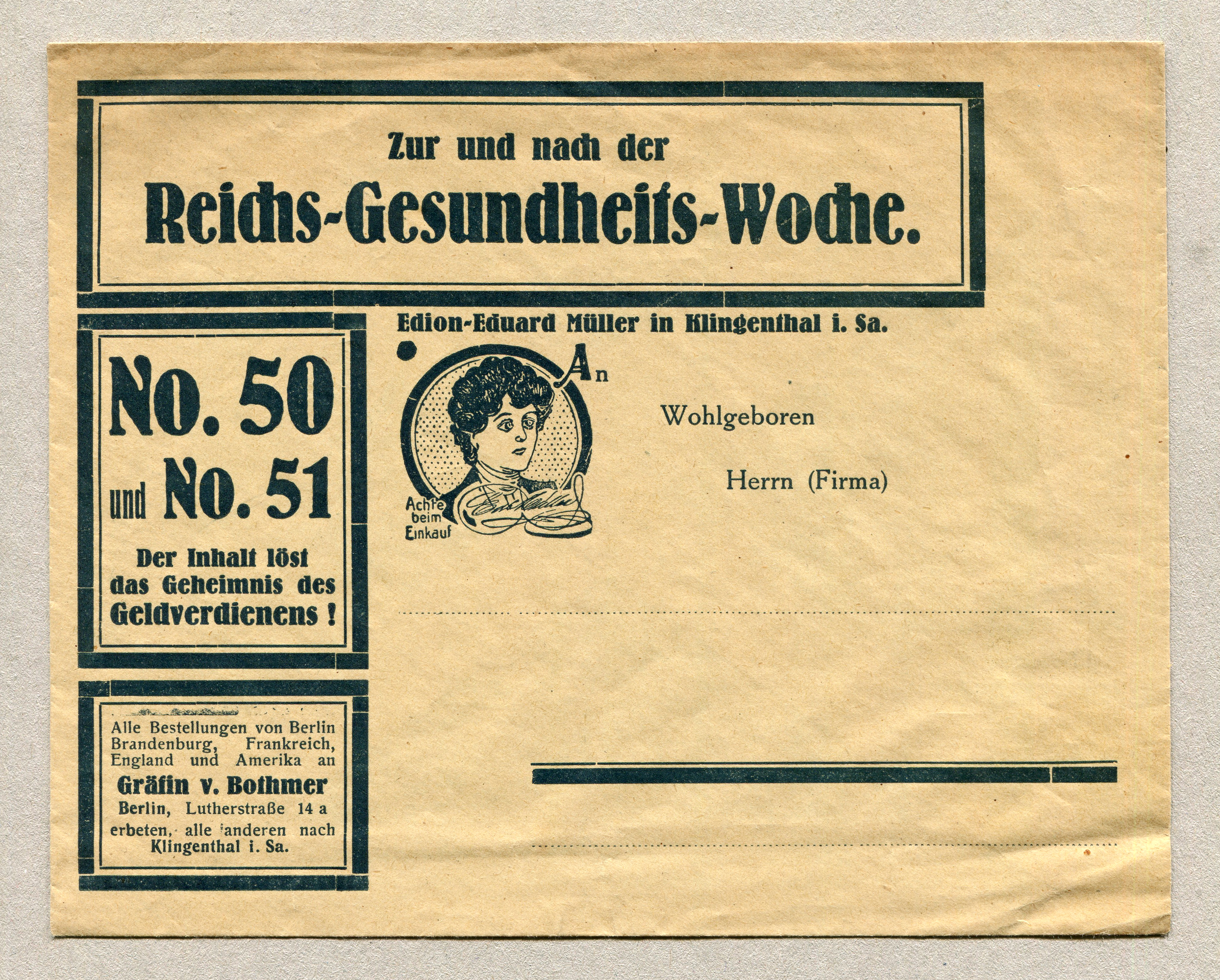 Envelope issued by Edion-Eduard Müller from Klingenthal in Saxony, Germany, on the occasion of the Reichs-Gesundheits-Woche (“Imperial Health Week”), with B2B ads for Alma, a remedy for corn, the Müllersche Schönheitskur (beauty treatments) No. 50 and 51, and similar cosmetic products.