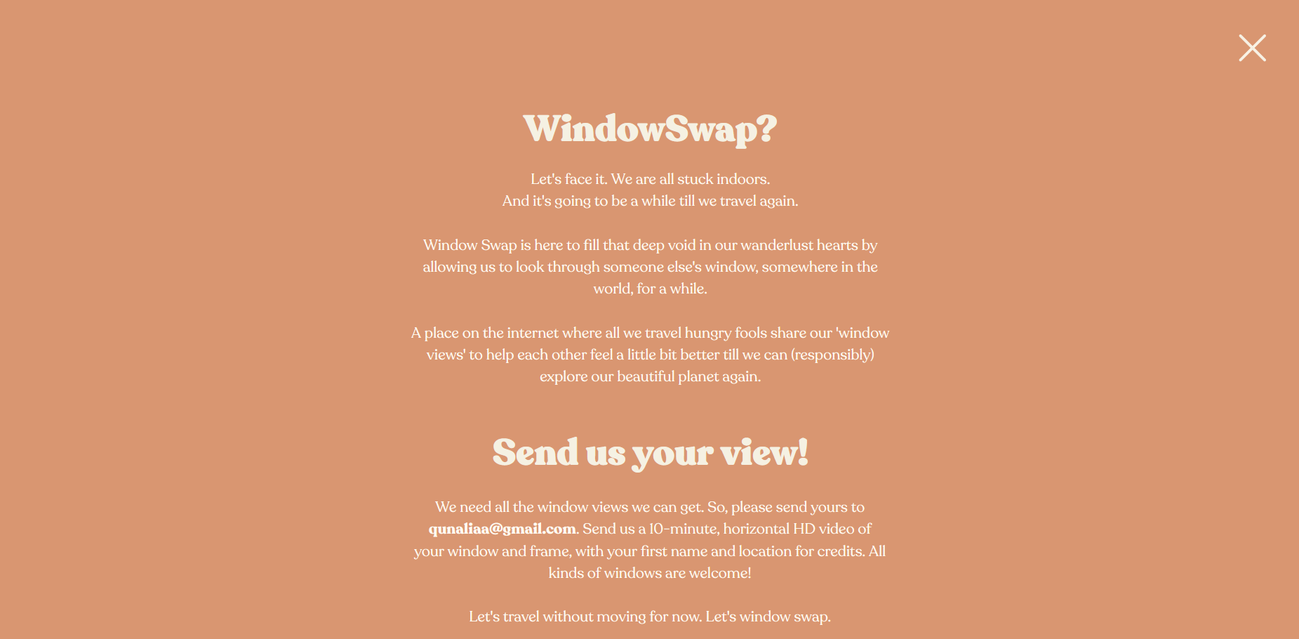A place on the internet where all we travel hungry fools share our 'window views’ to help each other feel a little bit better till we can (responsibly) explore our beautiful planet again.