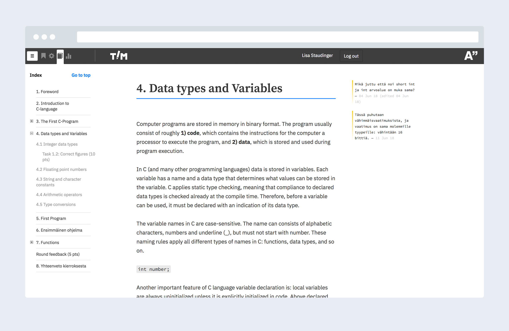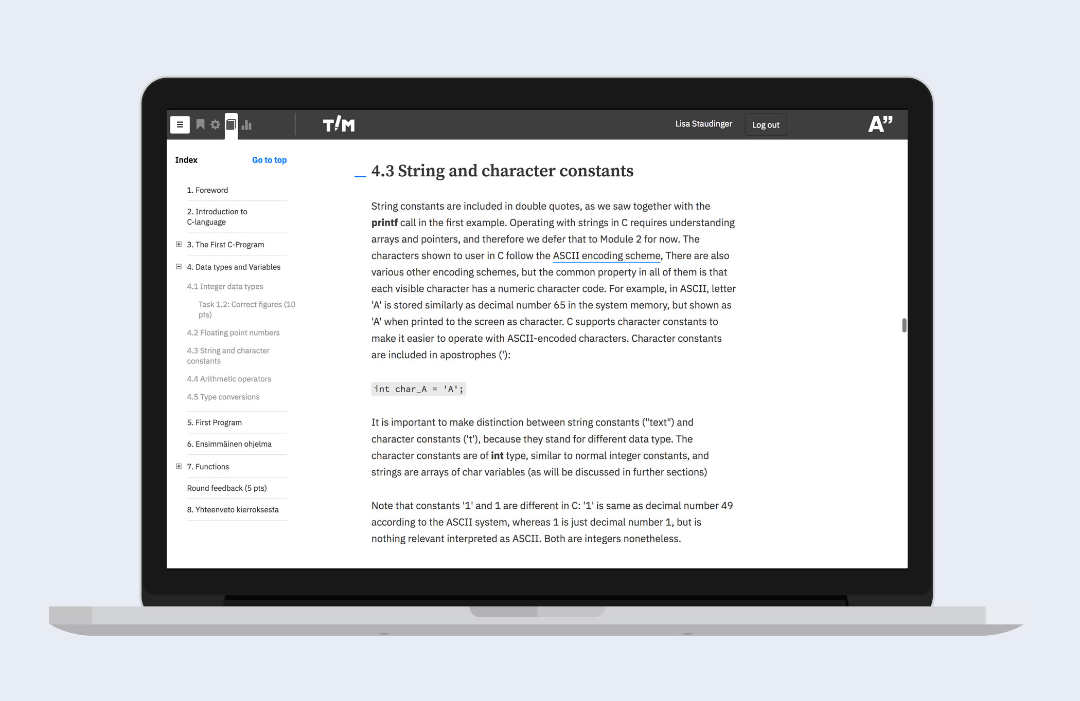 Custom interface re-design of the online platform “TIM – The Interactive Material” for Aalto University. TIM is an online textbook platform that enables teachers to share not only written content, but also give students interactive exercises to further explain the lessons.
