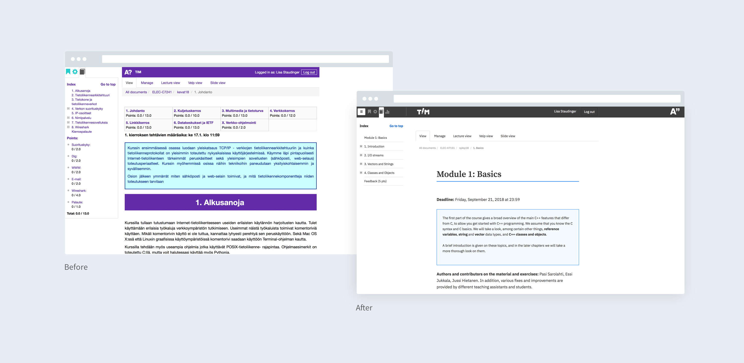 The redesign had to be mostly cosmetical, without touching the actual underlying site-structure, as the custom Aalto University version had to stay as compatible as possible with the main branch of the platform at Jyväskylä University.