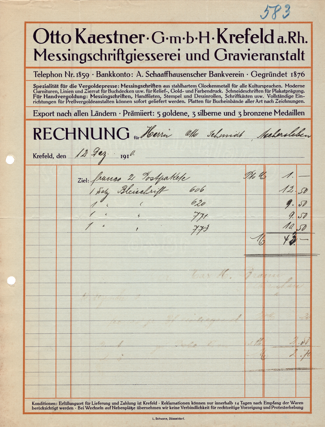 This post is about an invoice from the Otto Kaestner GmbH, an engraver and founder of brass types that operated during the first few decades of the twentieth century in Krefeld. The typeface used to compose the invoice was Peter Behrens’s Behrens-Antiqua, which had been produced by the Gebr. Klingspor typefoundry in Offenbach am Main in 1907. I think that the line at the very bottom of the invoice reading “L. Schwann, Düsseldorf” is an attribution placed there by the invoice’s printer.