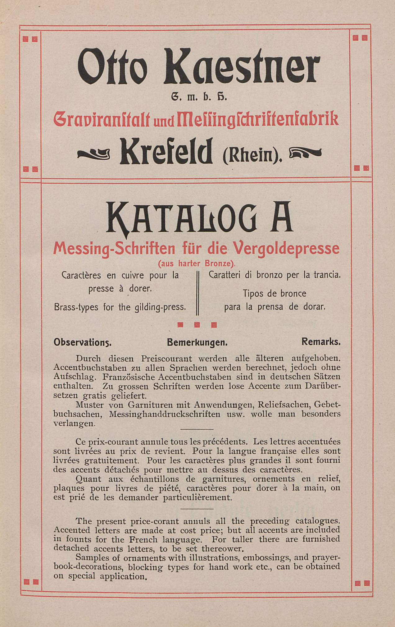 This invoice was not the only time that the Kaestner firm used a Klingspor typeface in its “corporate identity.” The firm produced several undated product catalogs. In one of them, the company header on the first page was set in the Eckmann typeface, designed by Otto Eckmann, which Gebr. Klingspor had published back in 1900 (when they still operated under the name Rudhard’sche Gießerei).