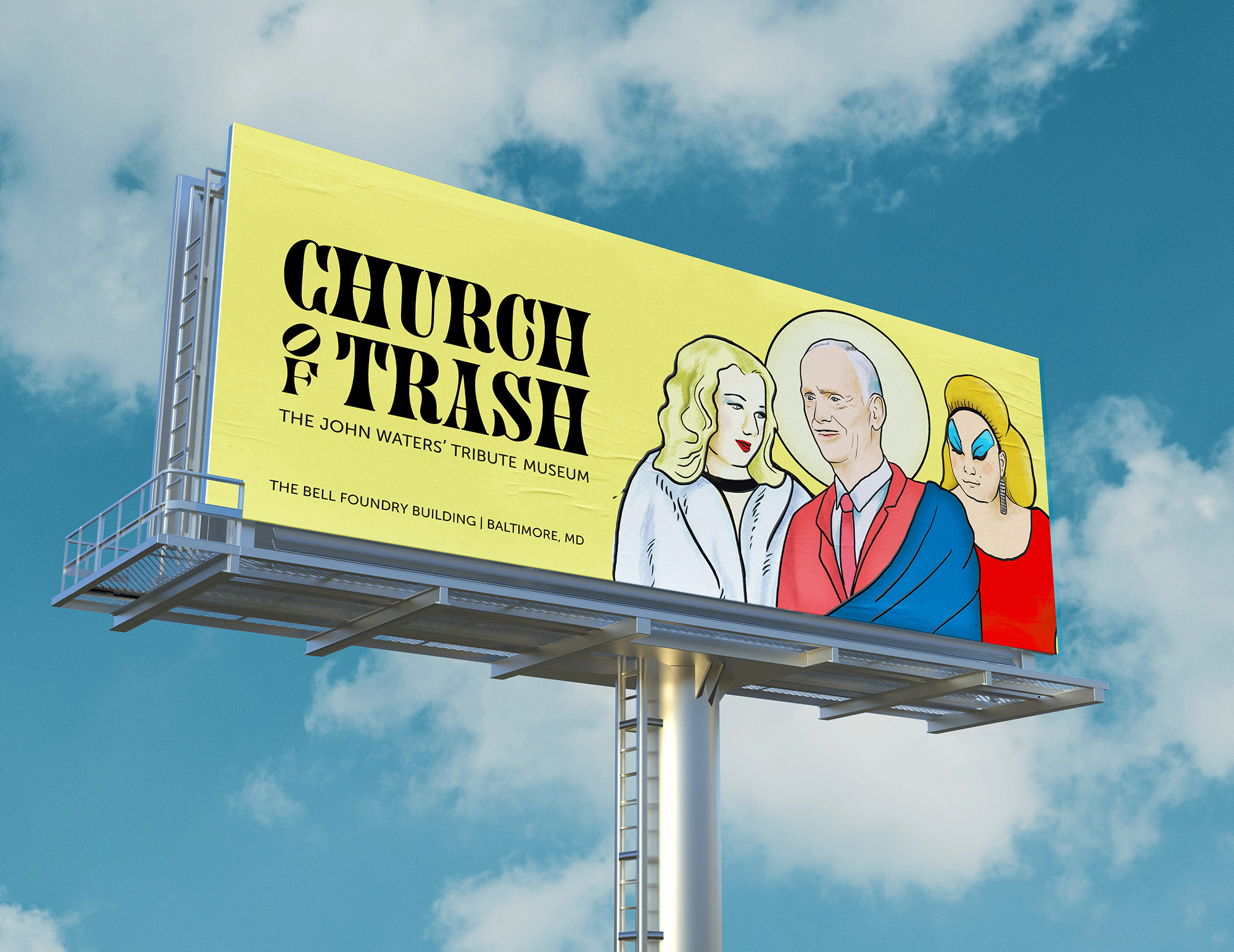 The Church of Trash is a branding project for an imaginary museum and exhibition celebrating John Waters’ work. The museum inhabits the Bell Foundry building in Baltimore, as the self-proclaimed pope of trash is a proud Baltimorean.