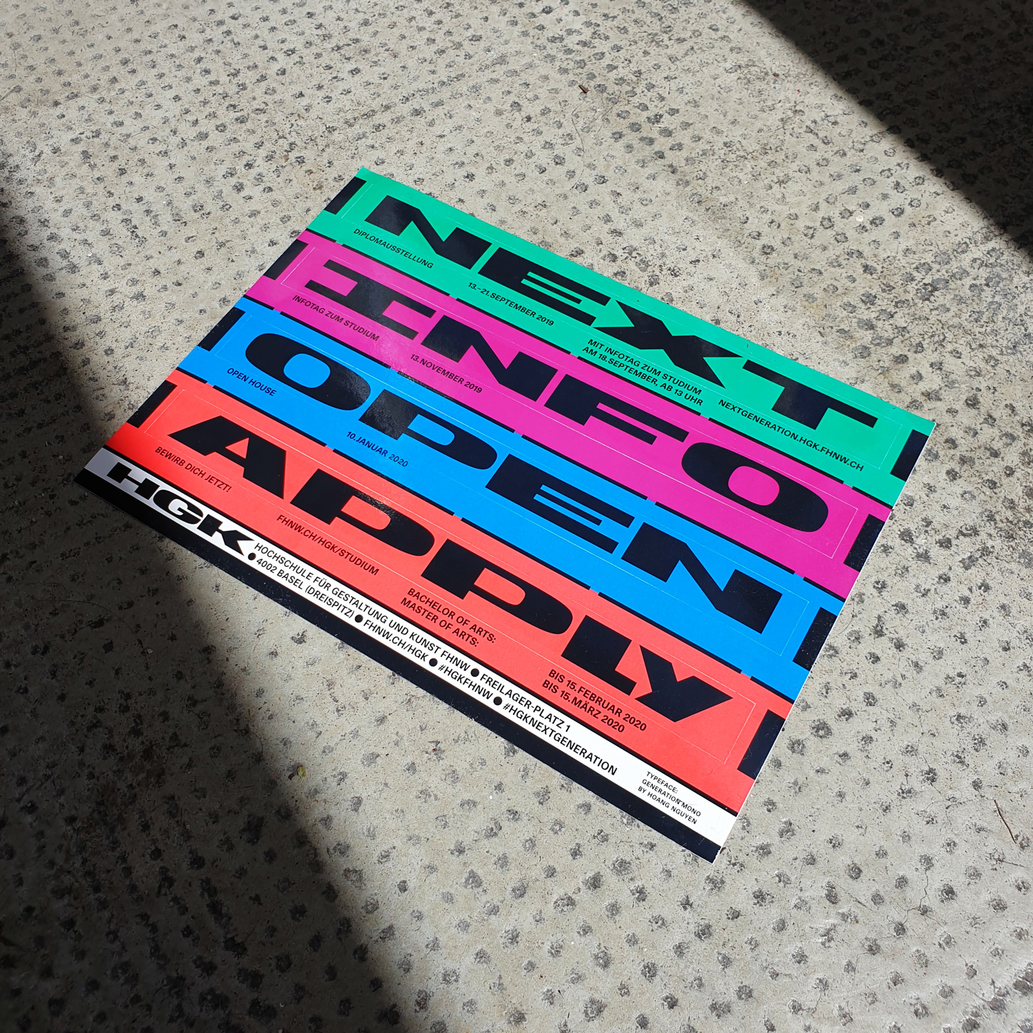 Hoang Nguyen (IG) was involved in designing and implementing the 2019 edition of the annual “Next Generation” campaign of the FHNW Academy of Art and Design in Basel in which the academy and its most recent graduates get promoted. Two of the applications that were designed by Hoang Nguyen are a flyer, of which the different words could be peeled off and used as stickers, and a bag that was distributed at various events of the FHNW Academy of Art and Design.