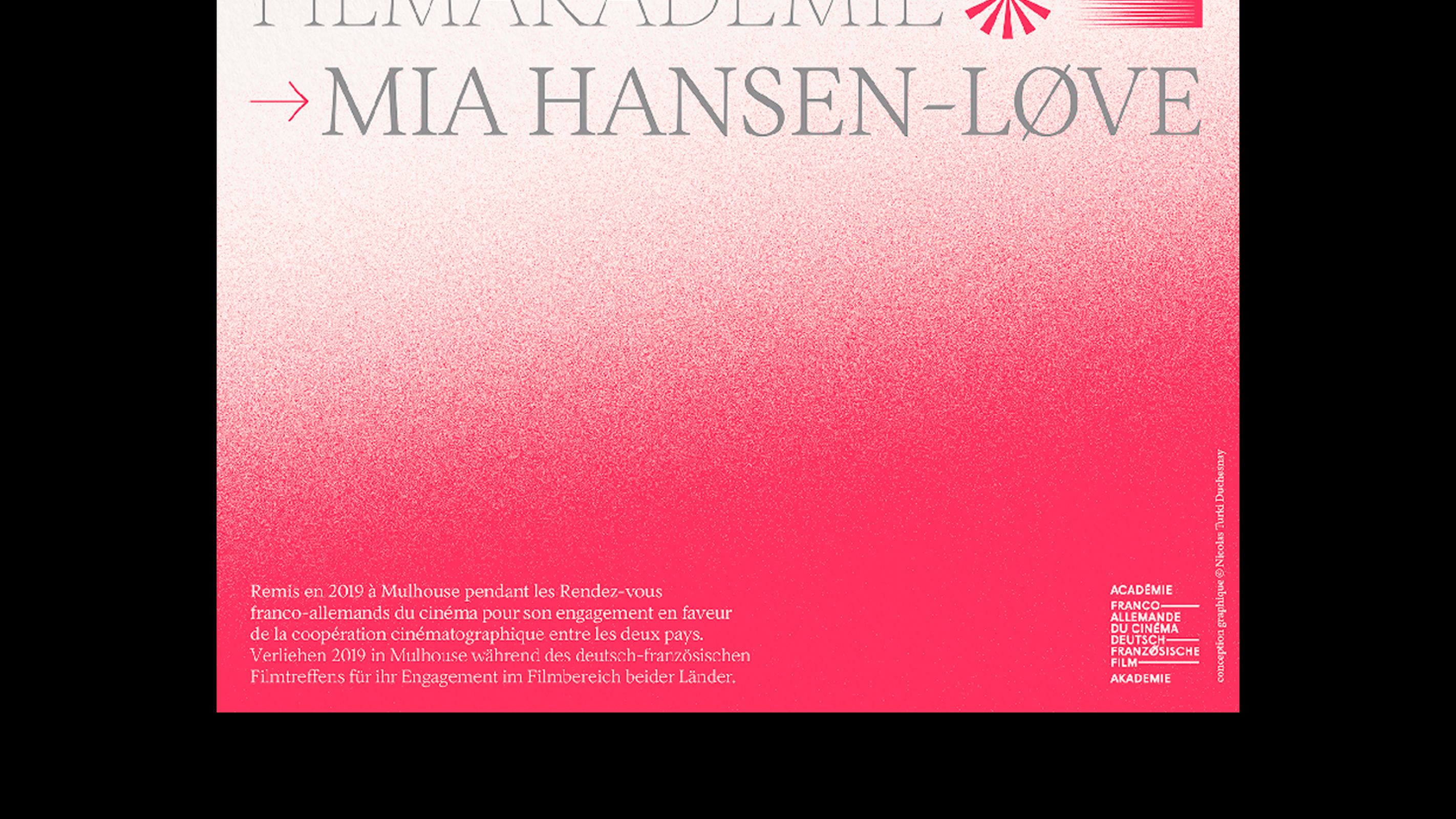 In 2019, the Franco-German Film Academy invited me to design its first award. The prize was awarded to Mia Hansen-Løve to salute her commitment to film cooperation between the two countries.